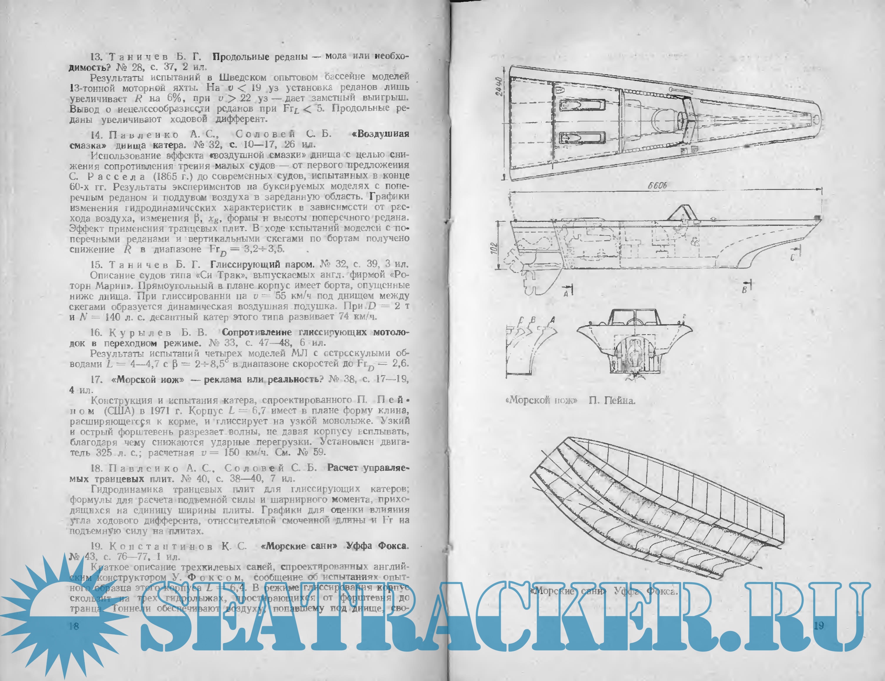 Содержание Предисловие. Нумерация сборника по годам выпуска Принятые обозначения и сокращения. I. КАТЕРА И МОТОРНЫЕ ЛОДКИ. 1. Общие вопросы проектирования моторных прогулочно-туристских судов 2. Гидродинамика и выбор обводов корпуса . А. Общие статьи и рекомендации Б. Экспериментальные исследования. Обводы новых типов 3. Выбор материала и конструкции корпуса. 4. Катера со стационарными двигателями А. Катера заводской постройки. Б. Катера любительской постройки и за рубежом 5. Лодки с подвесными моторами A. Мотолодки с рубками Б. Открытые мотолодки серийного производства B. Усовершенствования серийных лодок. Переделки. Установка крыльев, парусов Г. Открытые глиссирующие мотолодки (длиной свыше 3,6 м) любительской постройки и за рубежом Д. Малые глиссирующие лодки и универсальные "картоп"-лодки 6. Плавучие дачи 7. Гоночные суда 8. Суда на подводных крыльях 9. Малые суда специальных типов (СВП, на гидролыжах, на колесах, экранопланы) 10. Катера-амфибии (колесные) 11. Паруса на моторных судах. Подвесной парус II. ДВИГАТЕЛИ И ДВИЖИТЕЛИ 1. Стационарные двигатели 2. Подвесные моторы . A. Общие вопросы устройства и эксплуатации Б. Устройство и эксплуатация ПМ отдельных марок ("Салют"; "Стрела"; "Прибой"; "Ветерок"; "Москва", "Москва-М"; "Москва-25", "Москва-30"; "Вихрь", "Вихрь-М", "Вихрь-30"; "Нептун-23"; "Привет-22") B. Самодельные моторы Г. Основные публикации по зарубежным подвесным моторам 3. Гоночные подвесные моторы и двигатели 4. Угловые поворотно-откидные колонки 5. Водометные движители...... А. Стационарные водометные установки Б. Водометные подвесные моторы. 6. Гребные винты А. Проектирование гребных винтов. Доводка при испытаниях судна Б. Изготовление и .ремонт гребных винтов. Замеры шага. III. ПАРУСНЫЕ СУДА 1. Общие вопросы проектирования яхт; их мореходные качества 2. Правила обмера и классификации яхт 3. Парусное вооружение и оборудование яхт 4. килевые гоночные и крейсерско-гоночные яхты A. Крейсерско-гоночные яхты длиной свыше 9 м Б. Крейсерско-гоночные яхты "тонных" классов ("Однотонники"; "Полутонники"; "Четвертьтонники"; "Минитонники") B. Килевые яхты гоночных классов Г. Яхты-"двенадцатимётровики" 5. Килевые крейсерские яхты А. Крейсерские яхты длиной свыше 9м Б. Яхты заводской постройки. Усовершенствования. Переделки серийных гоночных яхт В. Малые крейсерские яхты самостоятельной постройки. Г. Зарубежные мини-яхты Д. Яхты из шлюпок и ботов 6. Крейсерские и гоночные швертботы . А. Крейсерские швертботы серийной постройки Б. Крейсерские швертботы любительской постройки и за рубежом В. Парусные тузики и прогулочно-снортивные швертботы Г. Гоночные швертботы. Техника спорта . 7. Многокорпусные суда A. Крейсерские катамараны Б. Крейсерские тримараны B. Гоночные и легкие прогулочные катамараны 8. Буера и колесные яхты 9. Яхты на подводных крыльях 10. Виндсерфинг IV. ГРЕБНЫЕ И ГРЕБНО-МОТОРНЫЕ ЛОДКИ 1. Общие вопросы проектирования малых лодок 2. Неразборные гребные и гребно-моторные лодки A. Лодки серийной постройки Б. Лодки самостоятельной постройки. Зарубежные лодки. B. Лодки местных типов (народной постройки) 3. Прогулочно-турястские и рыболовные разборные лодки А. Лодки заводской постройки. Усовершенствования и переделки , Б. Лодки, построенные любителями. Зарубежные лодки. 4. Байдарки и каноэ. Оборудование. Применение подвесного мотора и парусов 5. Надувные лодки А. Надувные гребные л