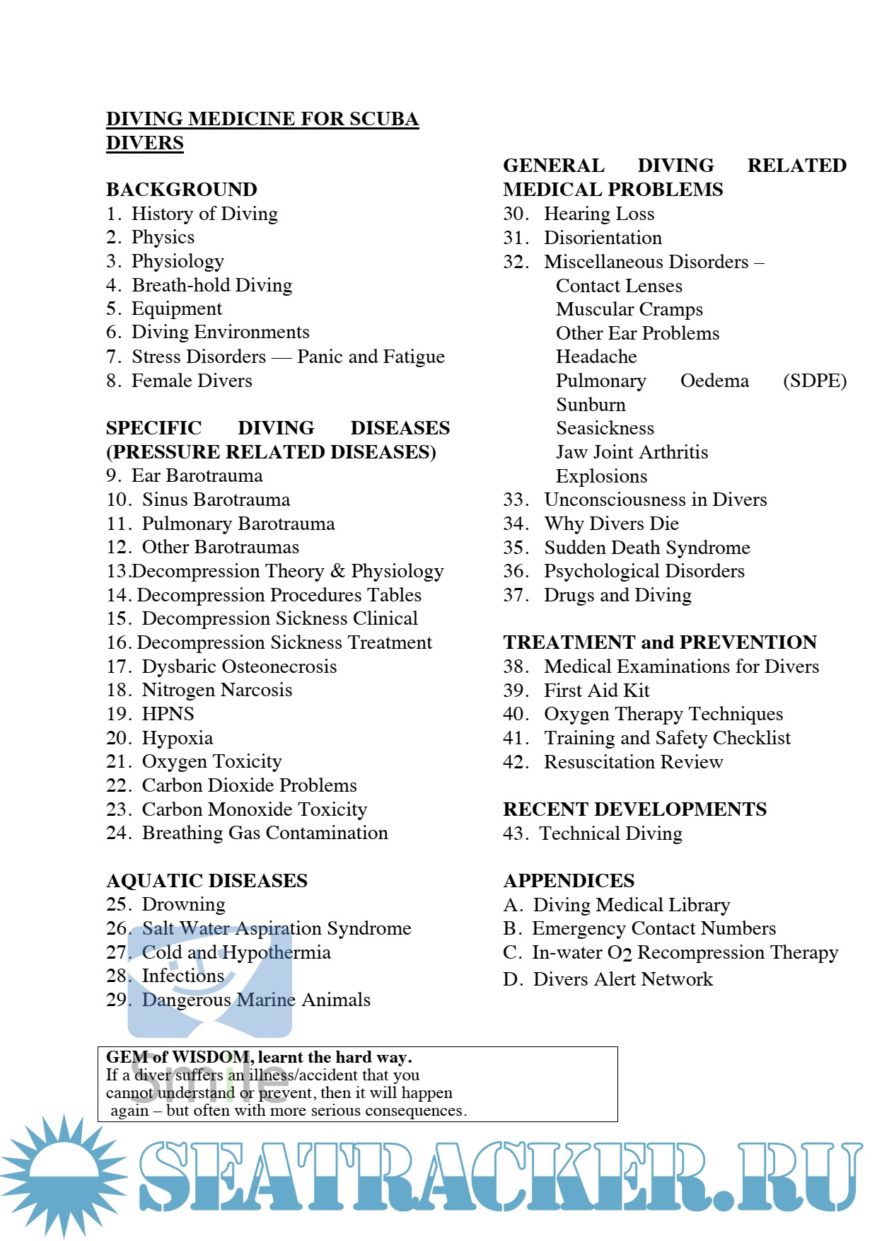 Year: 2012 Language: english Author: Edmonds K. at all Genre: Manual Publisher: Edmonds Carl Edition: 4th ISBN: 978-0-646-52726-0 Format: PDF Quality: Scanned pages Pages count: 359 Description: Diving Medicine for SCUBA Divers.