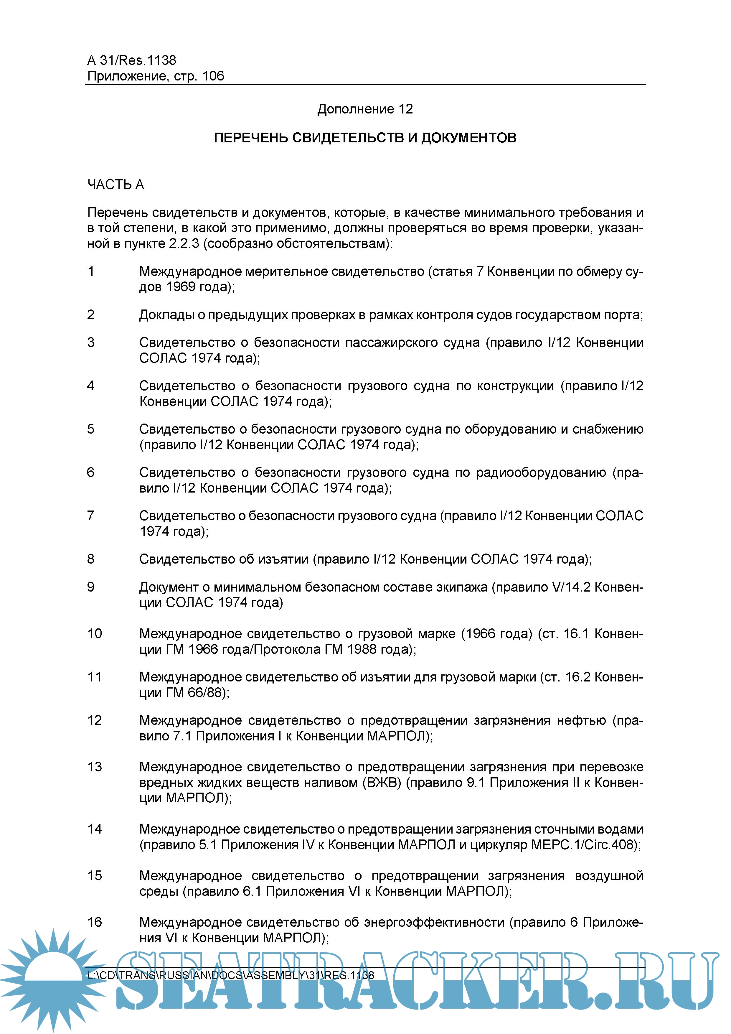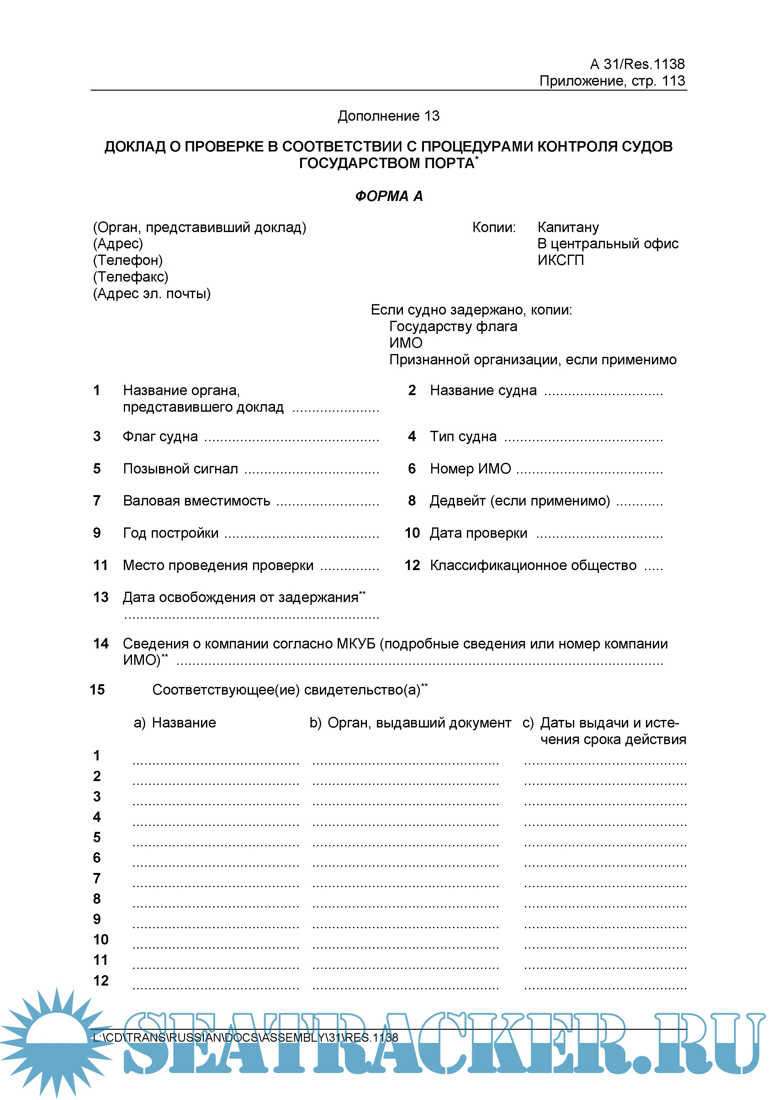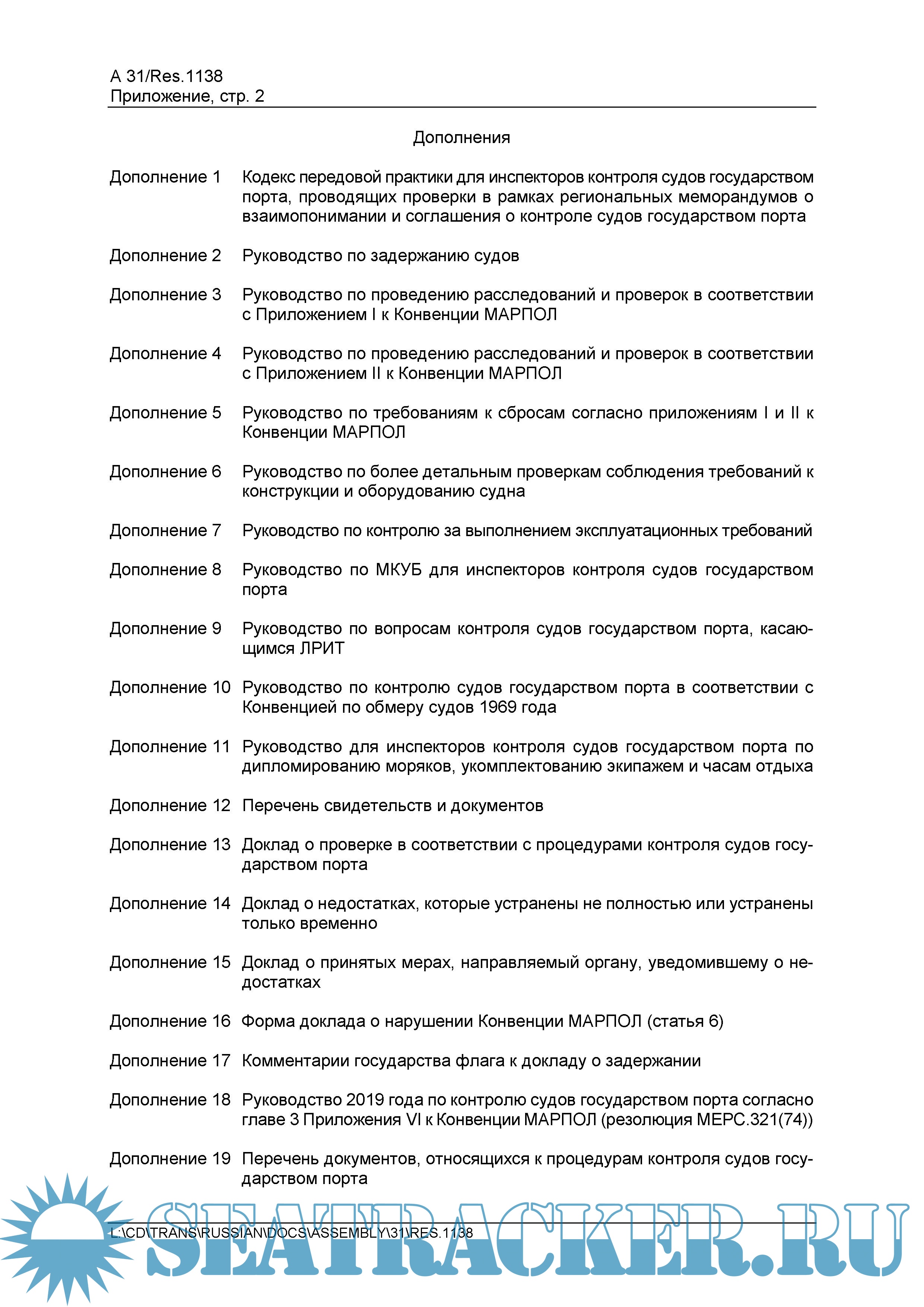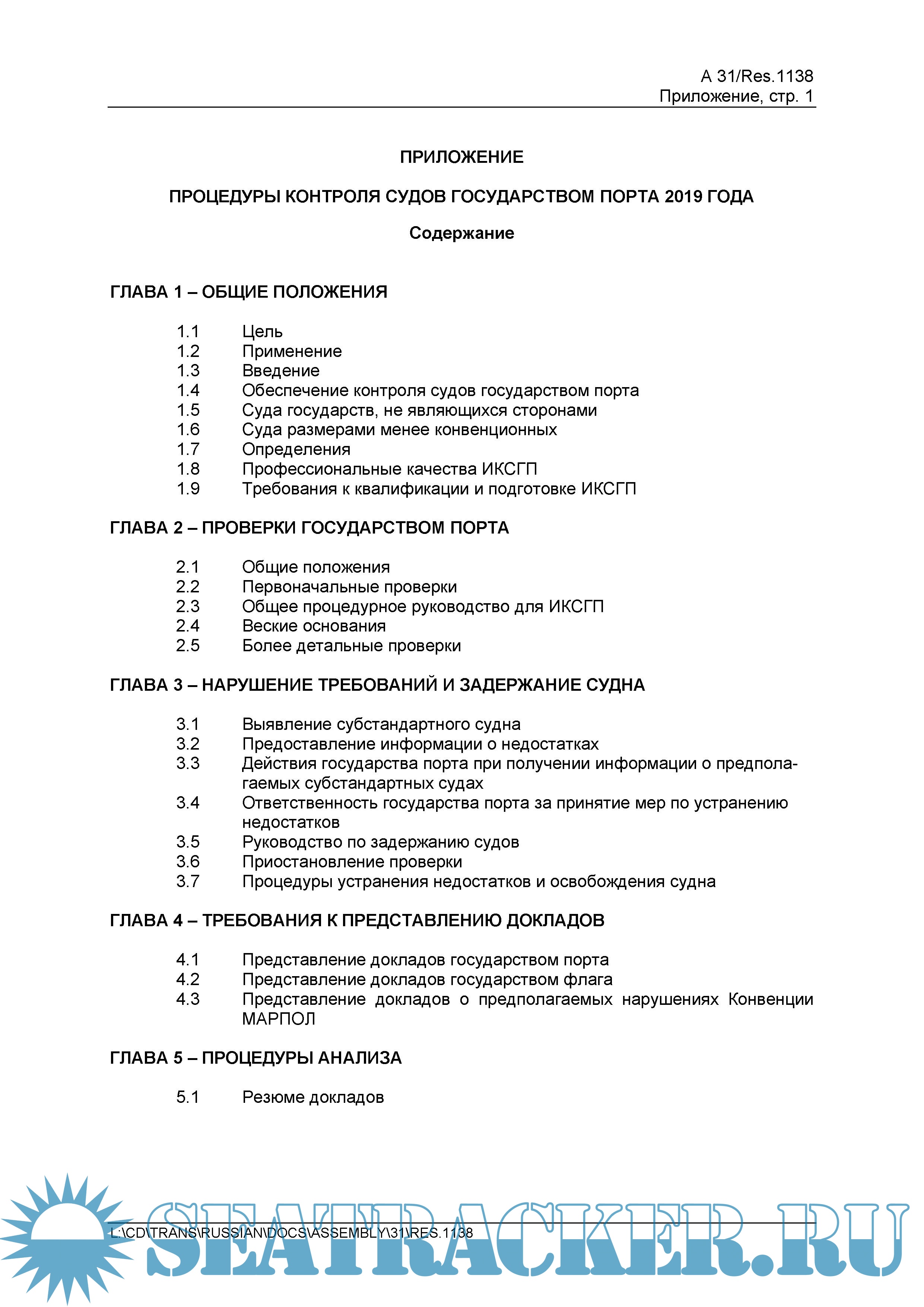 Год выпуска: 2020 Язык: русский Автор: Отдел безопасности мореплавания АО «ЦНИИ морского флота» Жанр: Руководство Издательство: АО «ЦНИИМФ» Формат: PDF Качество: Неизвестно Количество страниц: 408 Описание: Procedures for Port State Control, 2019. IMO Pesolution A.1138(31) Приводится на русском языке текст резолюции А.1138(31) Международной морской организации (ИМО) — «Процедуры контроля судов государством порта 2019 года», принятой на 31-й сессии Ассамблеи ИМО (27 ноября — 6 декабря 2019 г.) Документ предназначен предоставить основы руководства по проведению контроля судов государством порта и обеспечению единообразия в проведении этих проверок, по выявлению несоответствий судна, его оборудования или его экипажа и в применении процедур контроля. Положения региональных меморандумов о взаимопонимании по контролю судов (Парижского, Черноморского, Токийского и др.) основываются на этой резолюции. В отличие от предыдущего, издание включает новое добавление 18 к Руководству 2019 г. по контролю со стороны государства порта в соответствии с гл. 3 Прил. VI к МК МАРПОЛ, принятое резолюцией MEPC.321 (74) (https://seatracker.club/viewtopic.php?t=37994), в котором содержатся руководящие указания по проведению инспекций по контролю выбросов с судов. Также содержит поправки как к Руководству для офицеров контроля государства порта по МКУБ (добавление 8), так и к Руководству для офицеров контроля государства порта по дипломированию моряков, укомплектованию экипажа и времени отдыха (добавление 11). Английский язык является одним из официальных и, в отличие от русского, рабочим языком ИМО. По этой причине, в случаях каких-либо разночтений положений резолюции, предпочтение должно отдаваться тексту на английском языке (https://seatracker.club/viewtopic.php?t=40775). !!!ОТМЕНЯЕТ!!! Резолюцию А.1119(30) (https://seatracker.club/viewtopic.php?t=27490) .
