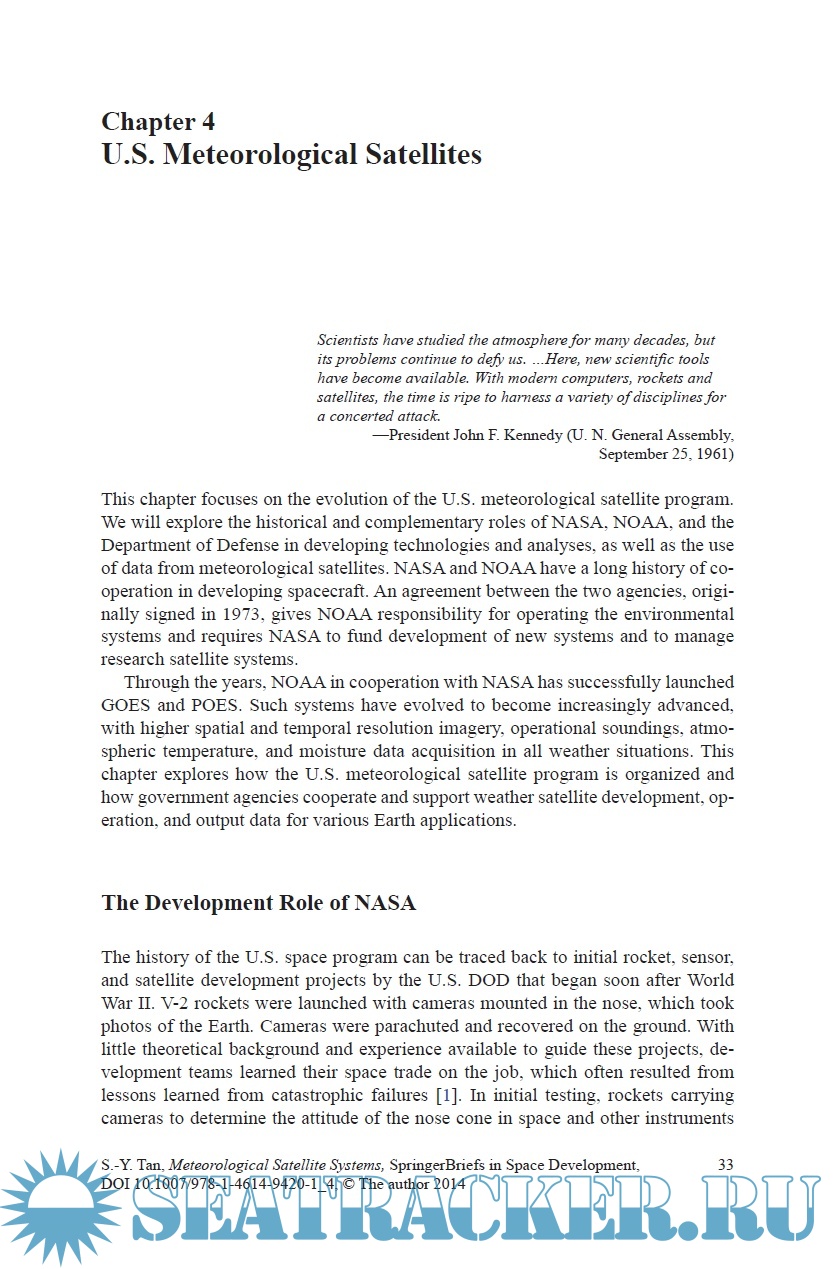 Year: 2014 Language: english Author: Su-Yin Tan Genre: Reference book Publisher: Springer ISBN: 978-1-4614-9420-1 Format: PDF Quality: eBook Pages count: 145 Description: A weather forecast can only be as good as the data that is available. In recent years the bulk of weather data in all environmental domains is acquired by satellite-based instrumentation. “Meteorological Satellite Systems” is a reference on weather satellites and their Earth applications, and a tool for students, engineers, scientists ad teachers. The book reviews developments and recent advancements in GEO and polar orbiting meteorological satellites. It explores the evolution of these technologies and their capabilities to monitor short- and long-term changes in weather patterns. The satellite systems of the main countries (U.S., Europe, Russian, Chinese, Japanese, Indian) are reviewed, as well as international efforts to coordinate meteorological data collection and sharing are discussed.