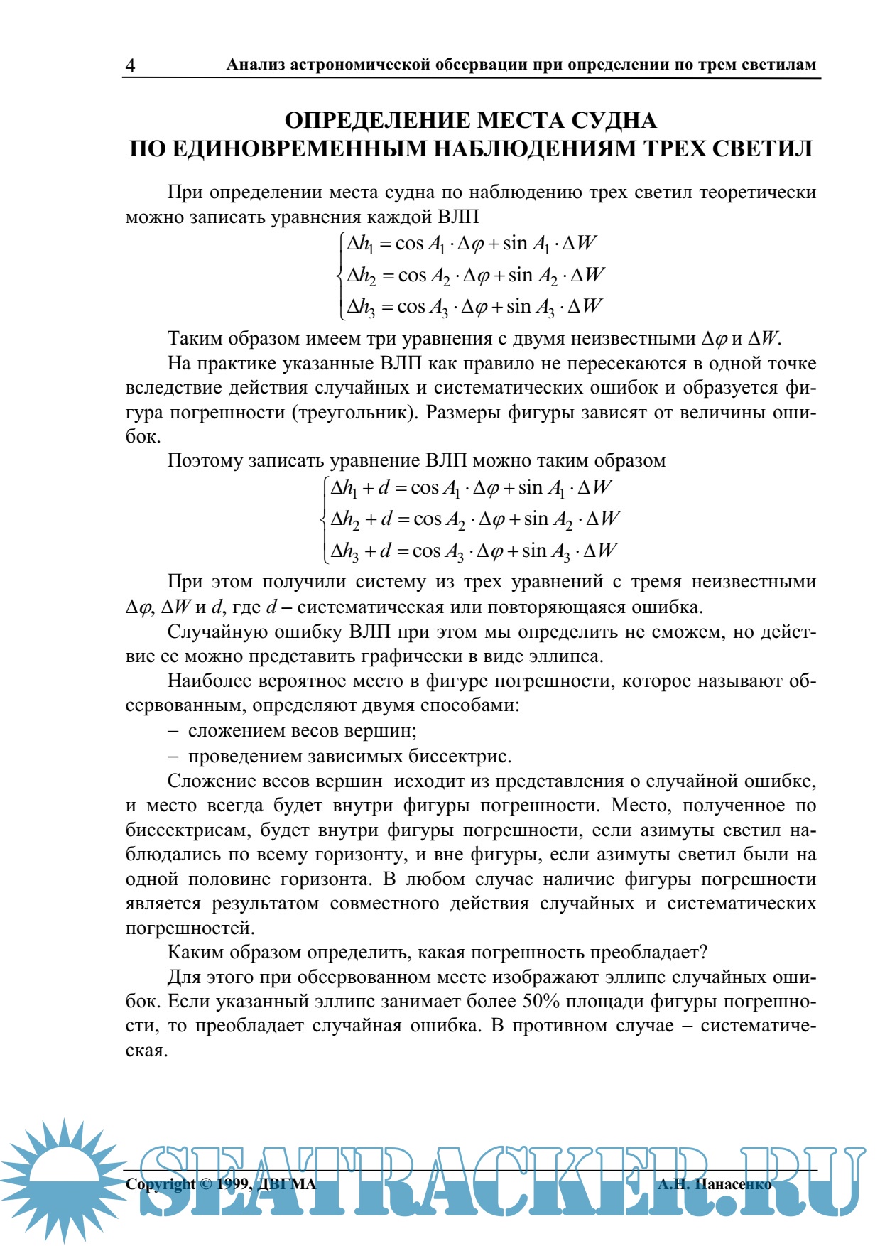 Описание: Лабораторные работы но анализу обсерваций выполняются в последнем семестре изучения дисциплины ''Мореходная астрономия'', т.е. на 4-м курсе. Целью лабораторных работ является освоение практических приемов отыскания вероятного места в фигуре погрешности и оценки его точности с учетом влияния случайных и систематических погрешностей в исходных высотных линиях положения