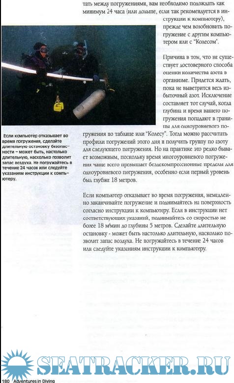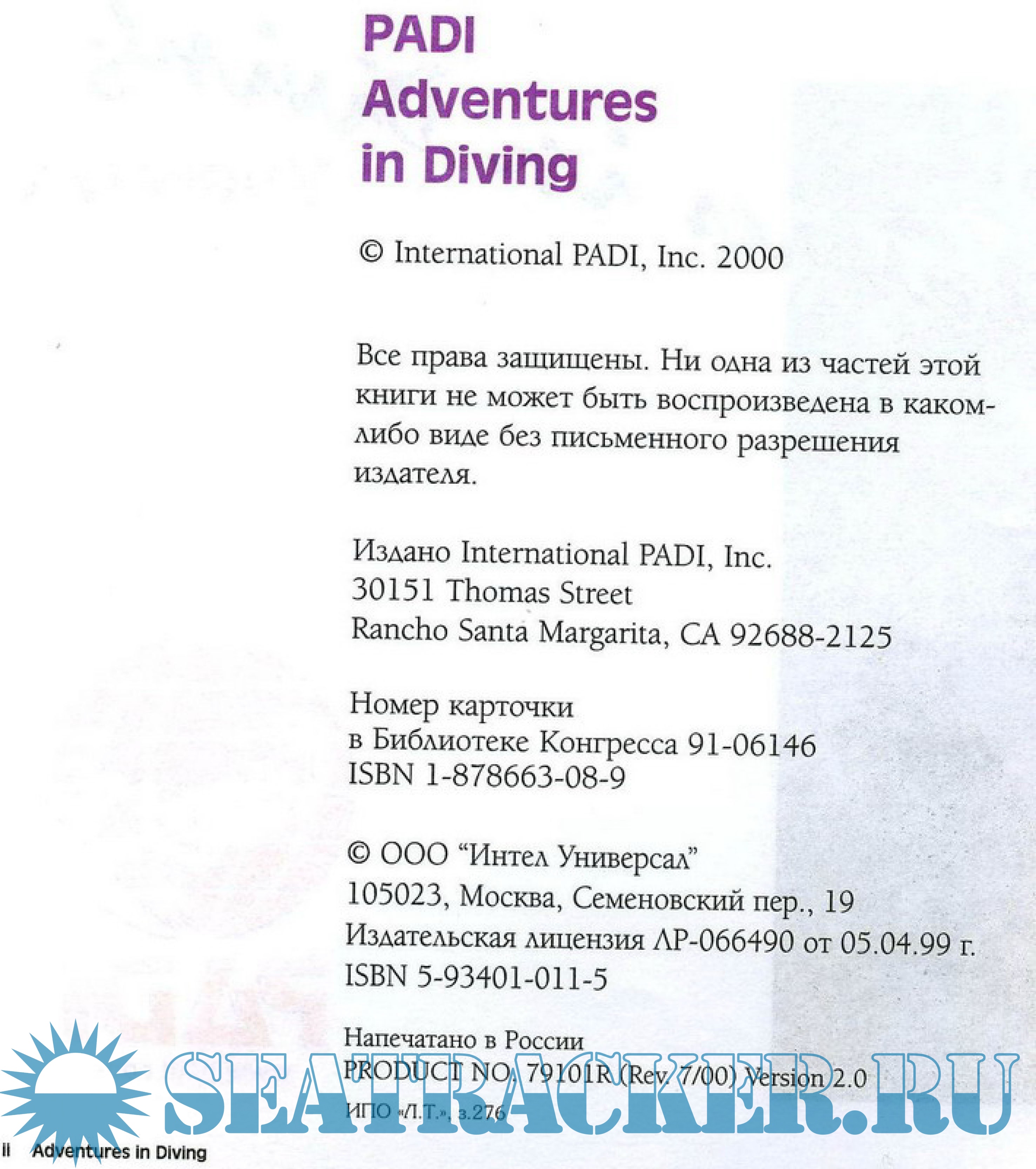 Дайвинг - это вид занятий, сопряженный с риском. Каждый дайвер в отдельности, принимающий участие в любом виде погружений, обязан согласиться с рисками и принять на себя ответственность за свои действия. Автор и издатель (и уж тем более раздающий) не несут никакой ответственности ни перед кем за утери, повреждения, травмы или смерть, вызванные любыми ошибками, пропусками в тексте, а также личной интерпретацией текста дайвером. Любая подобная ответственность не признается. Информация в данном пособии относится к дайвинrу с аквалангом и должна использоваться только как дополнение к утвержденному курсу обучения, который проводит сертифицированный инструктор.