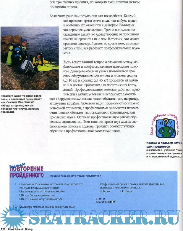 Вы, наверное, уже обнаружили, что дайвинг - это не просто погружение с аквалангом. Под водой можно выполнять различные действия и превратить подводное плавание в приключение, развлечение, отдых, словом, выбрать себе занятие по вкусу. Вашим подводным приключением может стать все, что угодно, например, катание на подводном буксировщике, подводная фотосъемка, поиск затонувших объектов, погружение к вашему любимому рифу. Выбор за вами. Естественно, все это можно делать только при определенных условиях - поэтому вам понадобится совет вашего инструктора.