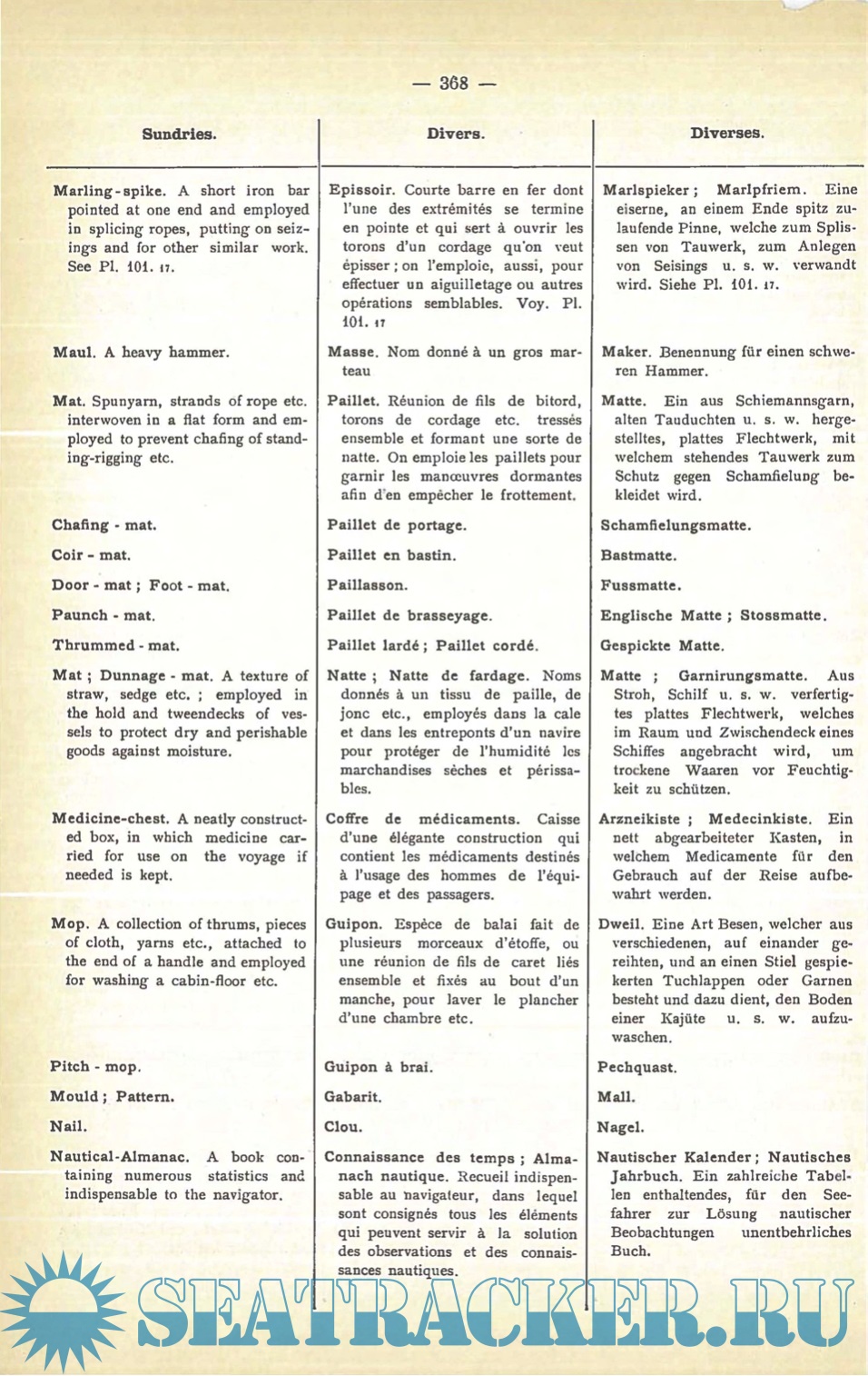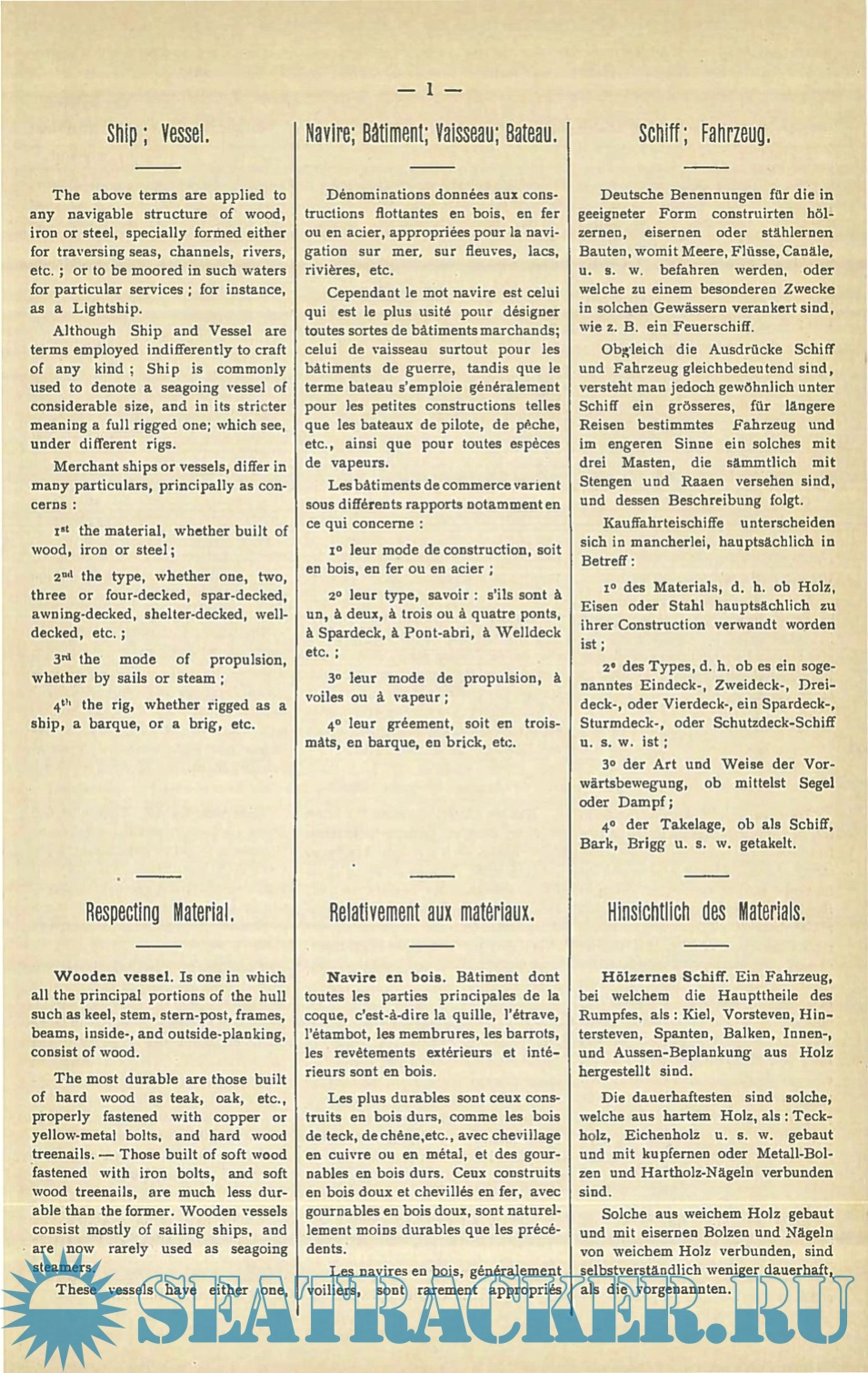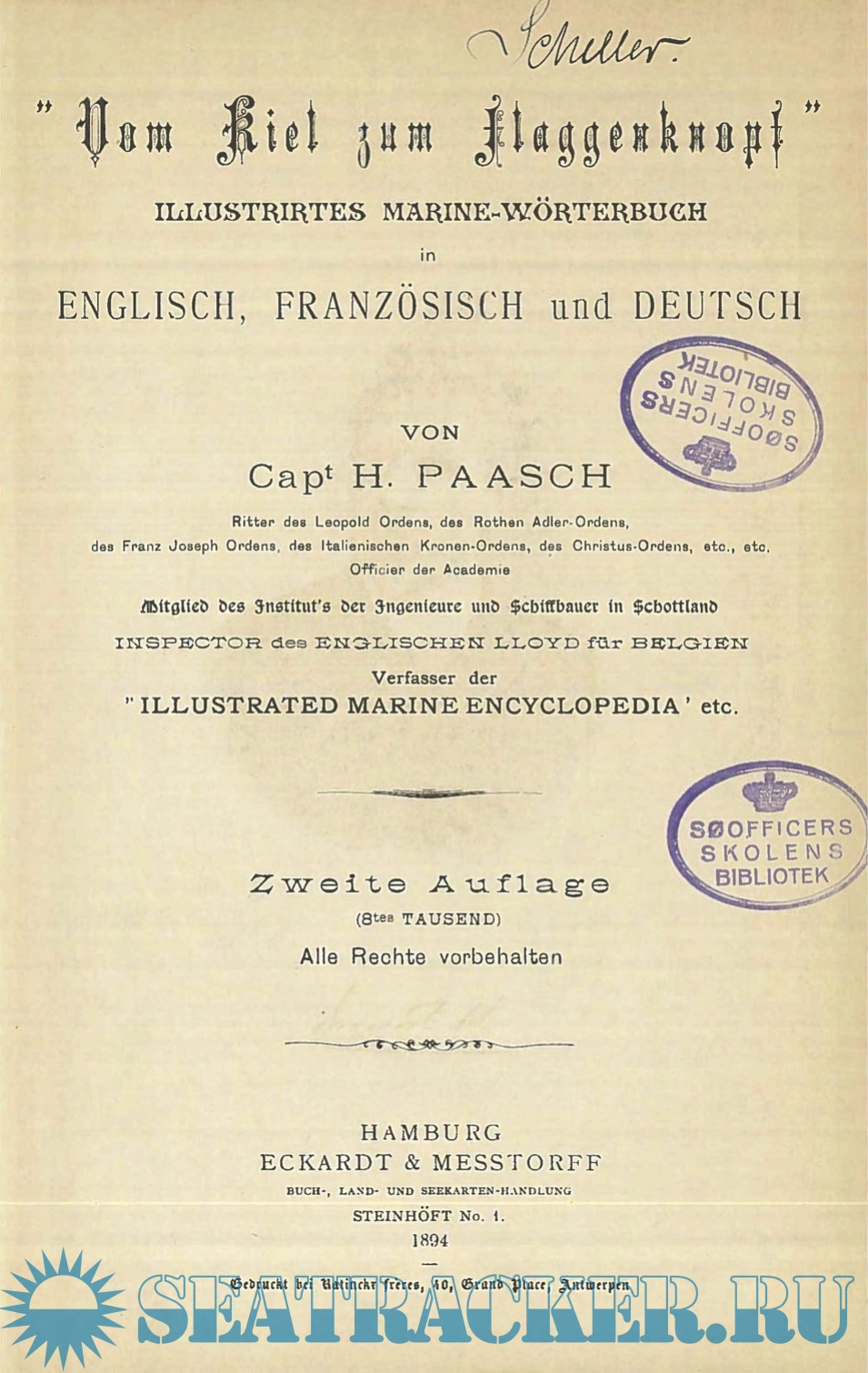 Year: 1894 Language: english/french/german Author: Paasch H. Genre: Dictionary Publisher: Eckardt & Messtorff Format: PDF Quality: Scanned pages Pages count: 797 Description: Captain Heinrich Paasch was the first to recognize the complexity and variety in marine vocabulary and technical terminology and the inherent need for a cohesive classification of nautical terms. Equipped with over thirty-five years of seafaring experience, including as a sailor, captain, and as a Surveyor to Lloyd's Register, Paasch sets out, chapter by chapter, an exhaustive explanation of all the principal parts of a ship's structure and equipment. He describes the main types of steam and sailing vessels; wooden and iron hulls; propulsion machinery; anchors and related equipment; masts and spars; standing and running rigging, as well as sails, tackle, blocks and ropes. He concludes with knots, bends, hitches, and splices and finally provides a listing of standard measurements.Paasch's stated intention to describe a ship literally “From Keel to Truck” has been widely applauded as has his inclusion of the equivalent terms in French and German alongside the English. Each section is accompanied by dozens of high-quality line engravings to accompany the text and illustrate the terminology and concept described. First published in 1885, and an invaluable resource ever since, Captain Paasch’s dictionary is both a full encyclopedia and an unequaled introduction for anyone interested in steam and sailing ships, life aboard a ship, engineering, or simply understanding the language. Additional info: Paasch's illustrated marine dictionary - Originally published as 'From Keel to Truck' - Paasch H. [2014, EPUB] - https://seatracker.club/viewtopic.php?t=36895