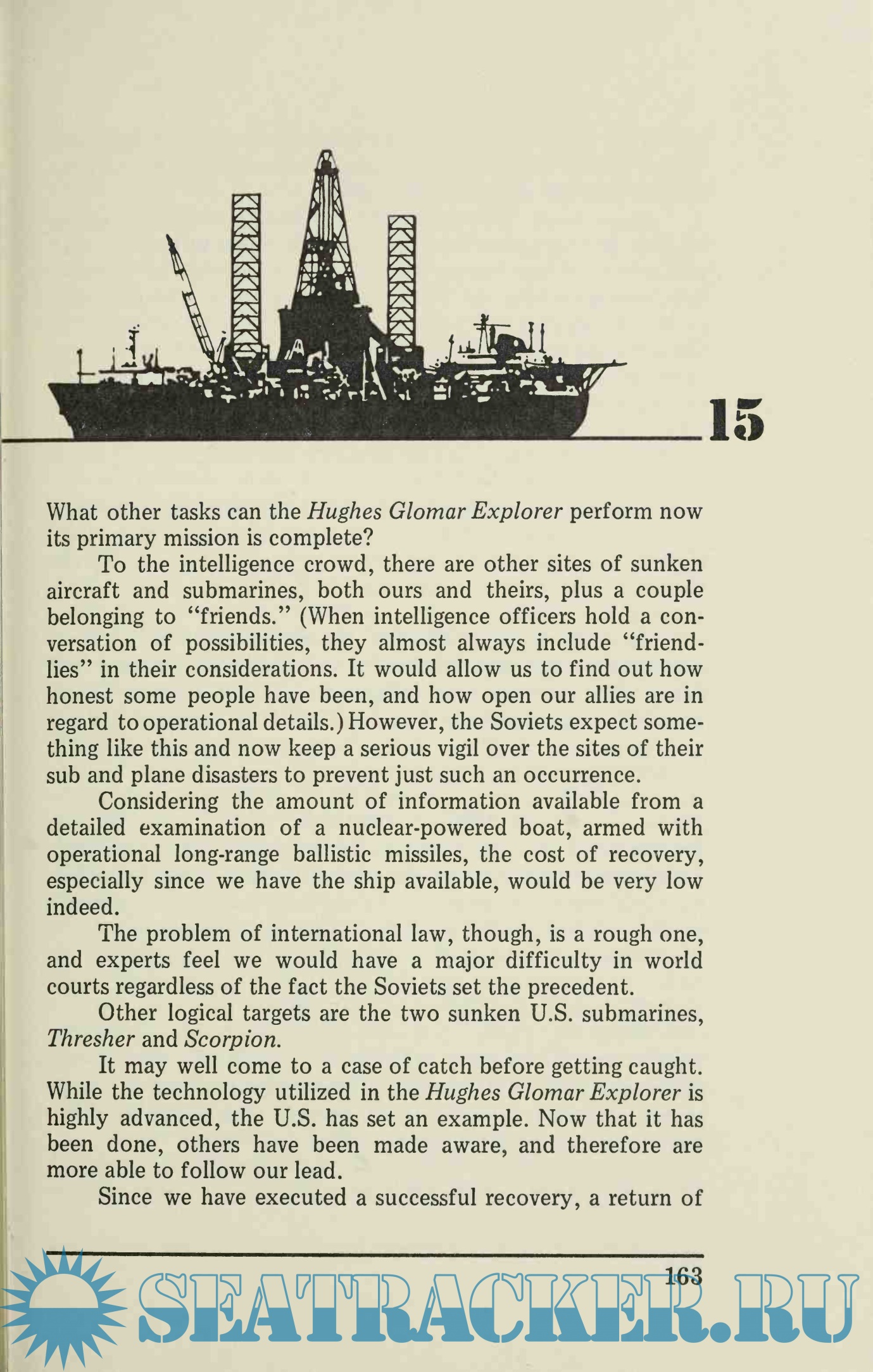 The Project was a monumental effort to create a tool that could reach three miles below the ocean's surface and pull the sub from primordial muck—in secret. Financed and built by Hughes and Global Marine under contract with the CIA, the ship created to pluck the sub from the ooze was a technological marvel. Two football fields in length and twenty-three stories high, the Hughes Glomar Explorer held in its hull a six-million-pound submersible "claw" for picking up sections of the submarine.