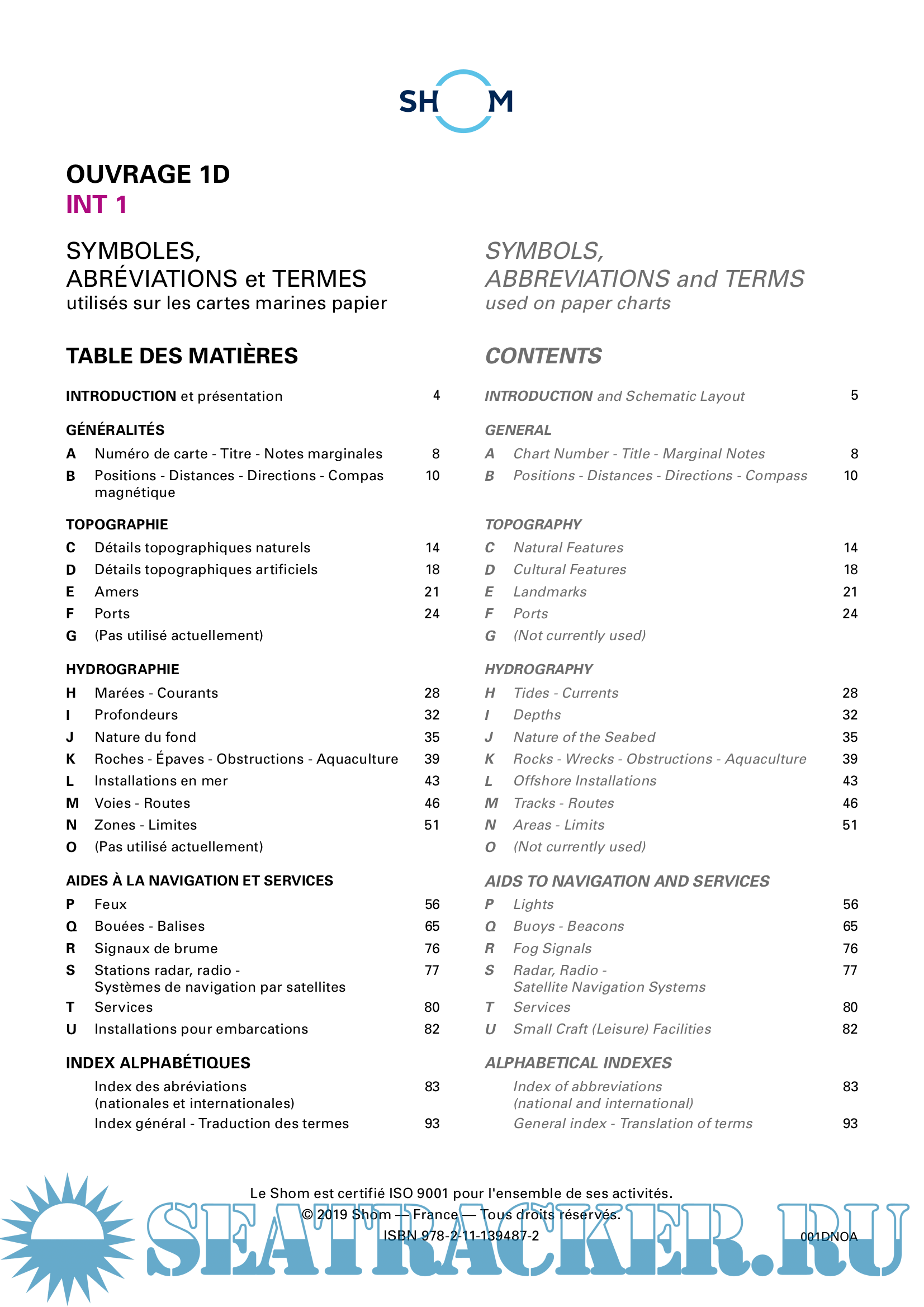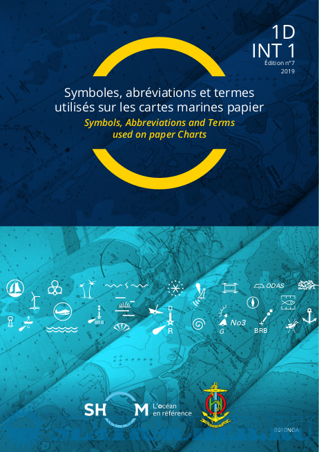 Description: On trouve dans ce document l’ensemble des symboles, abréviations et termes utilisés aussi bien sur les cartes marines aux normes internationales que sur les cartes marines aux normes anciennes du Service hydrographique et océanographique de la marine (Shom). L’ouvrage 1D s’applique aux cartes marines imprimées. Les symboles et abréviations affichés sur les écrans de navigation utilisant des cartes marines électroniques peuvent parfois différer de ceux décrits dans cet ouvrage.