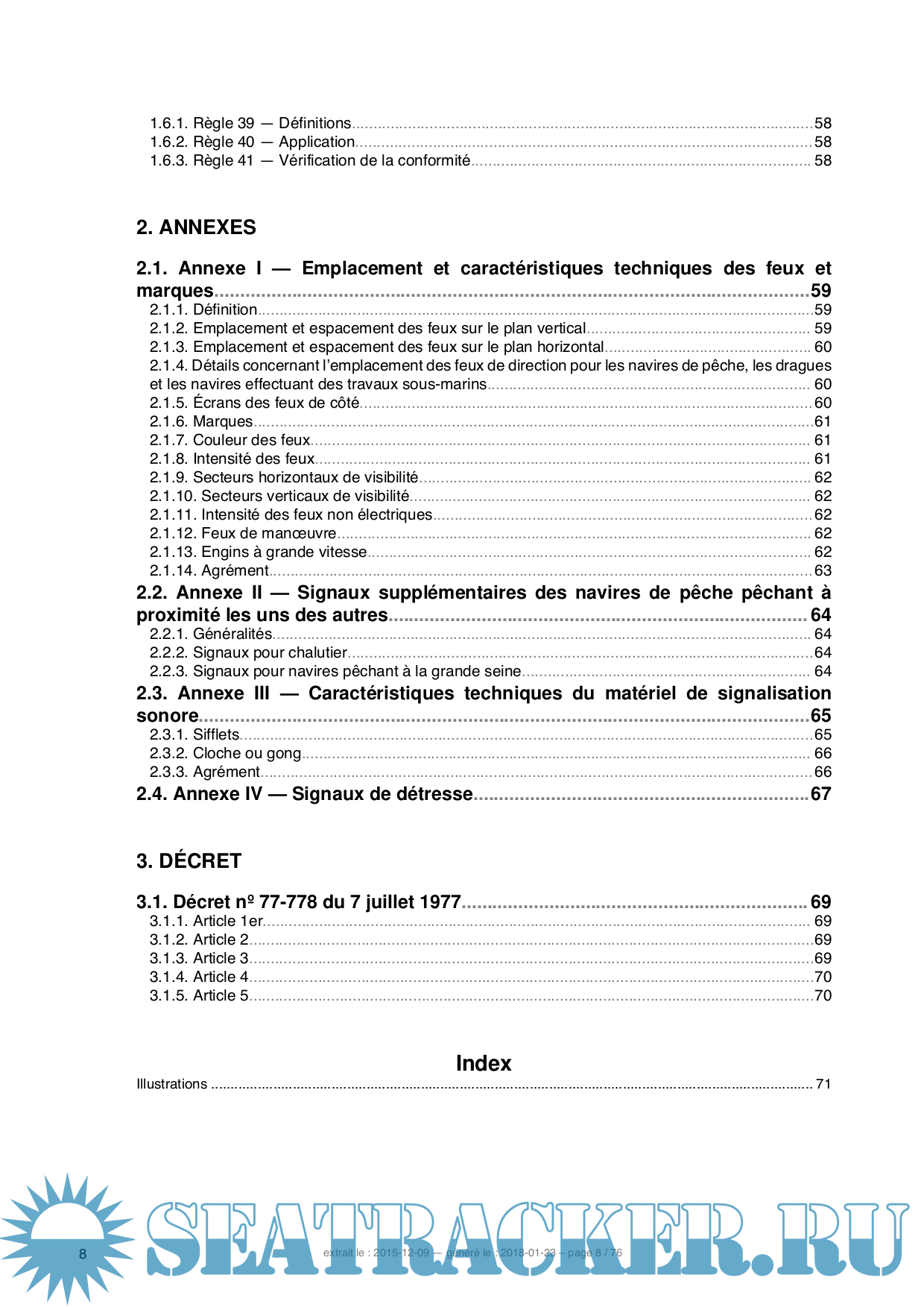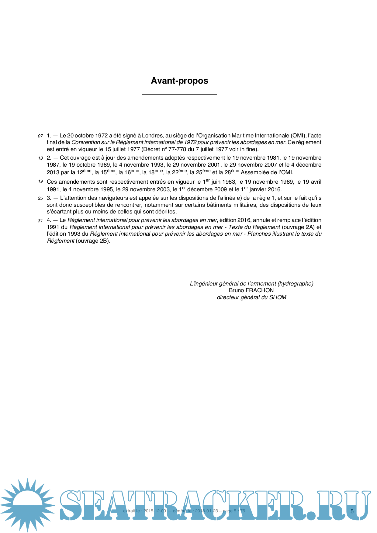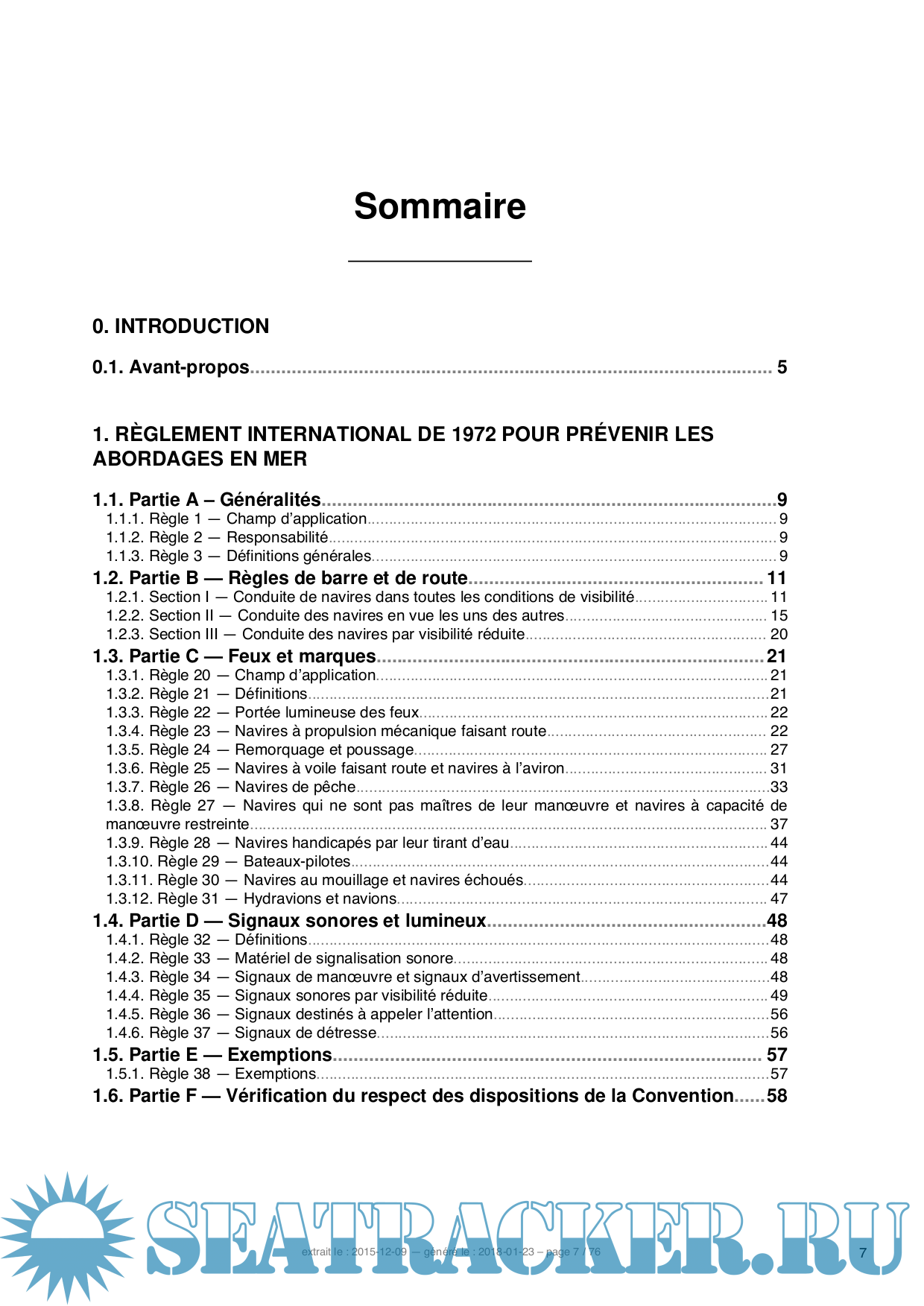Description: On trouve dans ce document l’intégralité des règles énoncées dans le règlement international de 1972 pour prévenir les abordages en mer, à jour de ses divers amendements. Ce document comporte un grand nombre de planches qui illustrent certaines des règles énoncées.