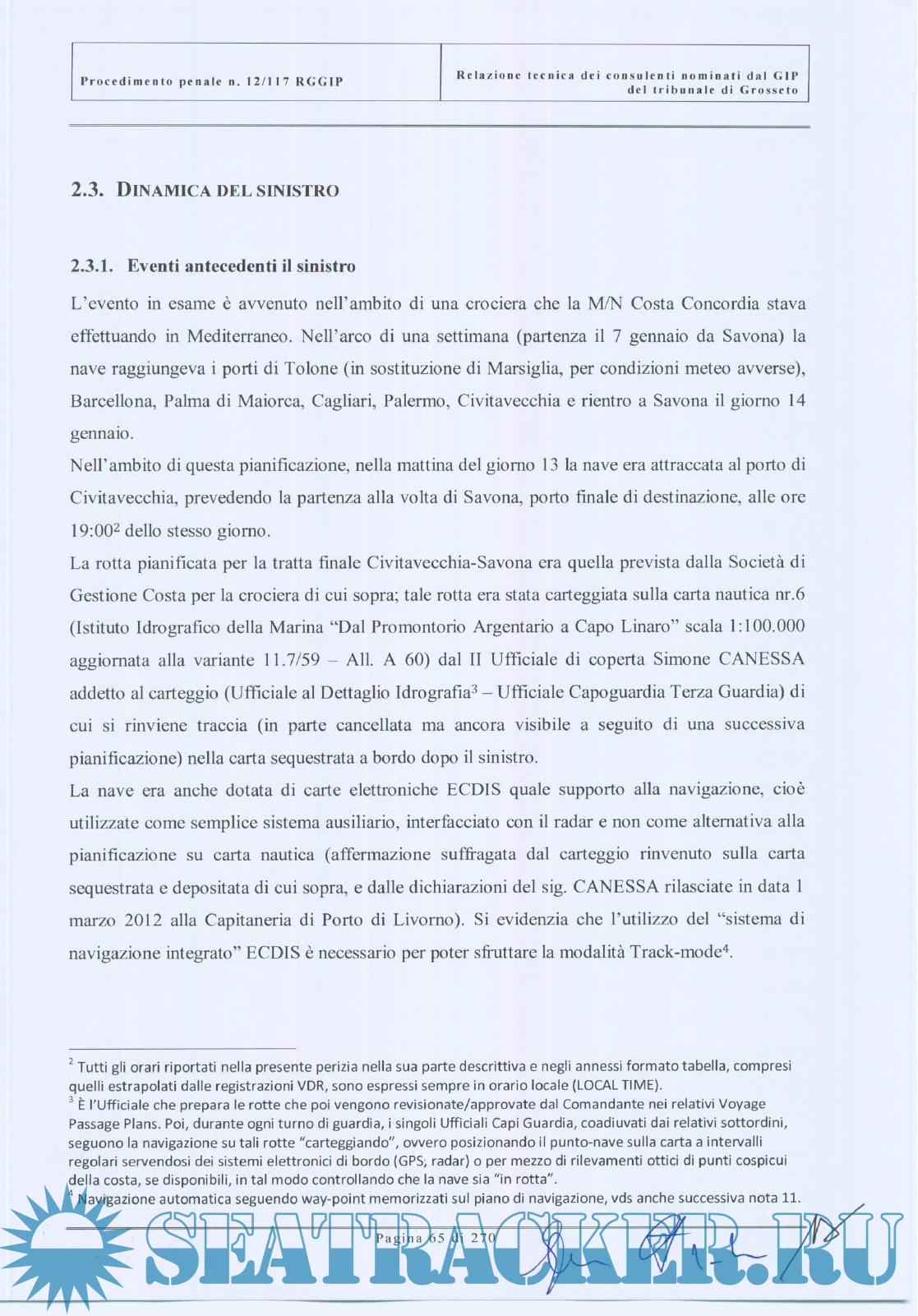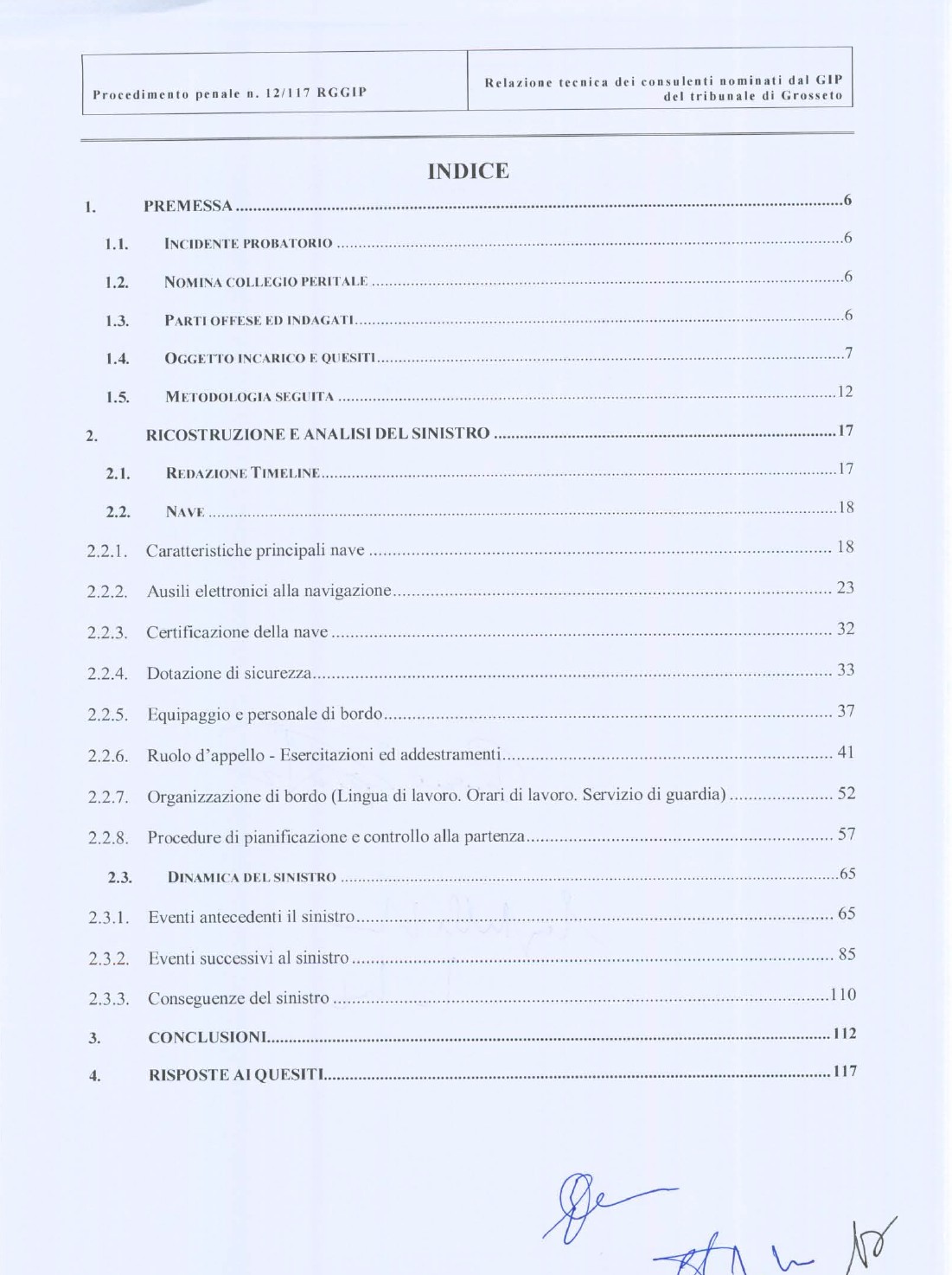 Description: Questo documento è la relazione tecnica del collegio dei periti nominati dal GIP del tribunale di Grosseto, relativo al sinistro della nave Costa Concordia. Il collegio peritale era costituito da due ammiragli (CP e Marina Militare) e da due ingegneri, docenti universitari , esperti di radar, comunicazioni e costruzioni navali. E' un'indagine estremamente approfondita sulle cause e gli errori che portarono al disastro della Costa Concordia, corredata da una vasto numero di allegati, annessi e documenti.