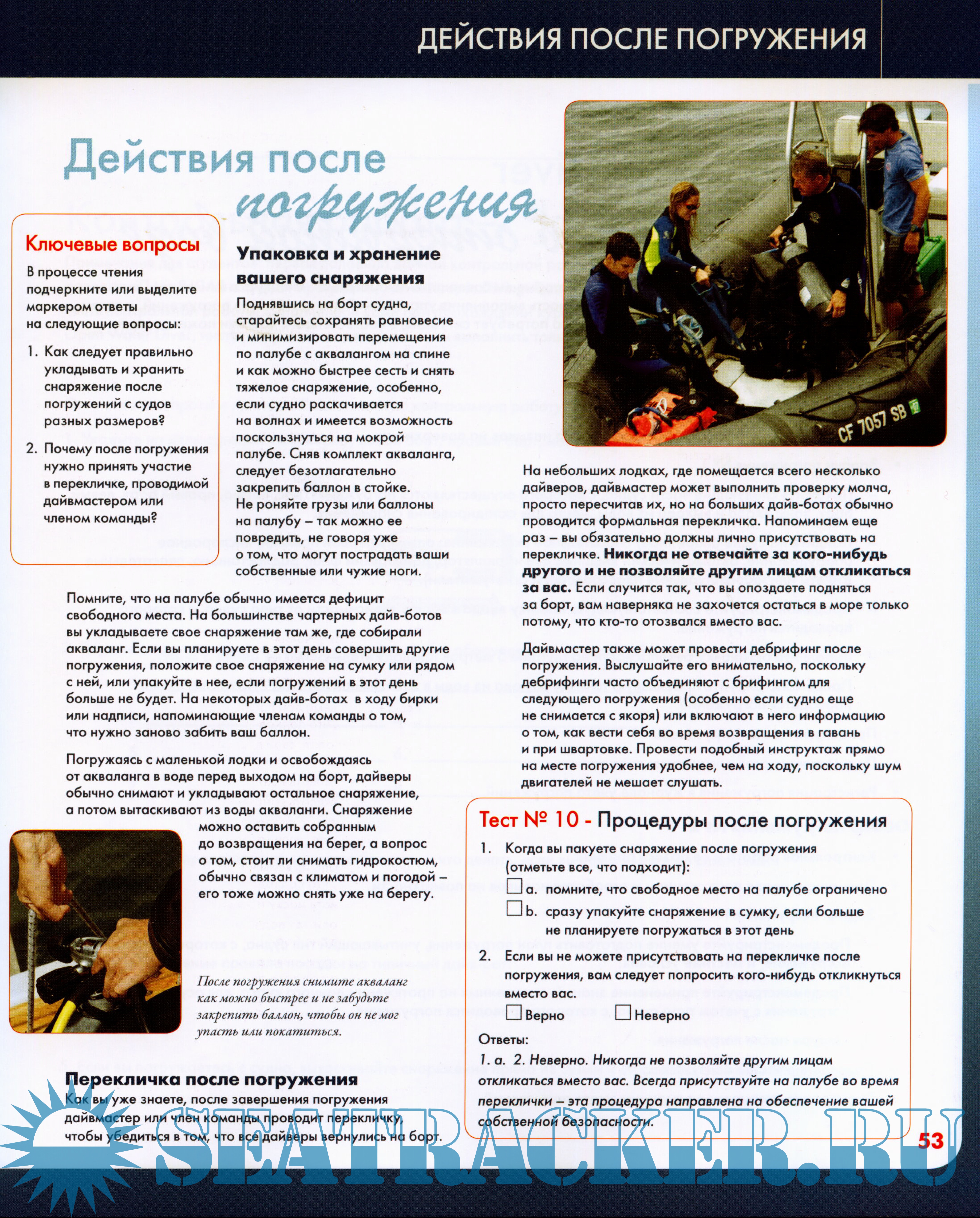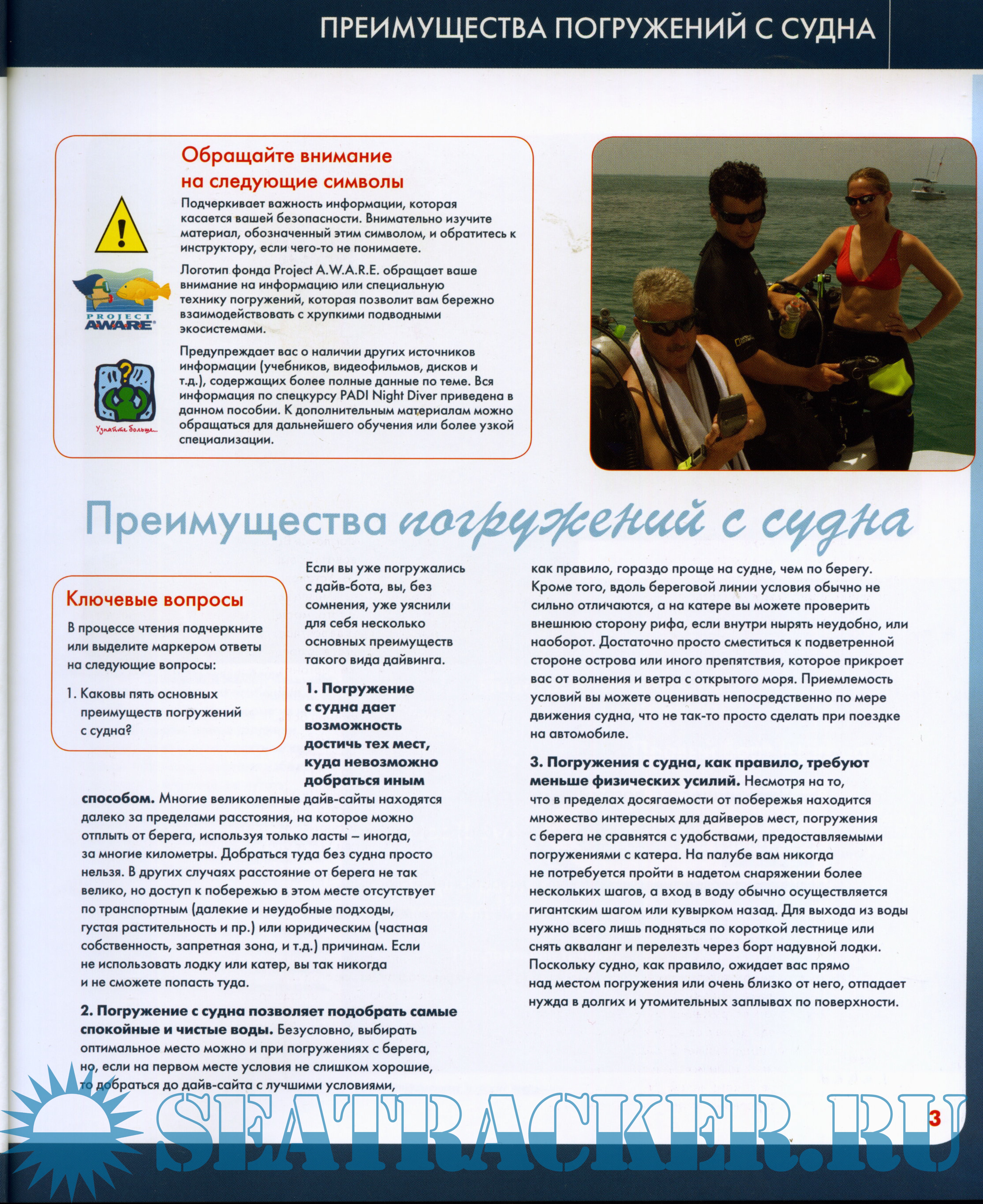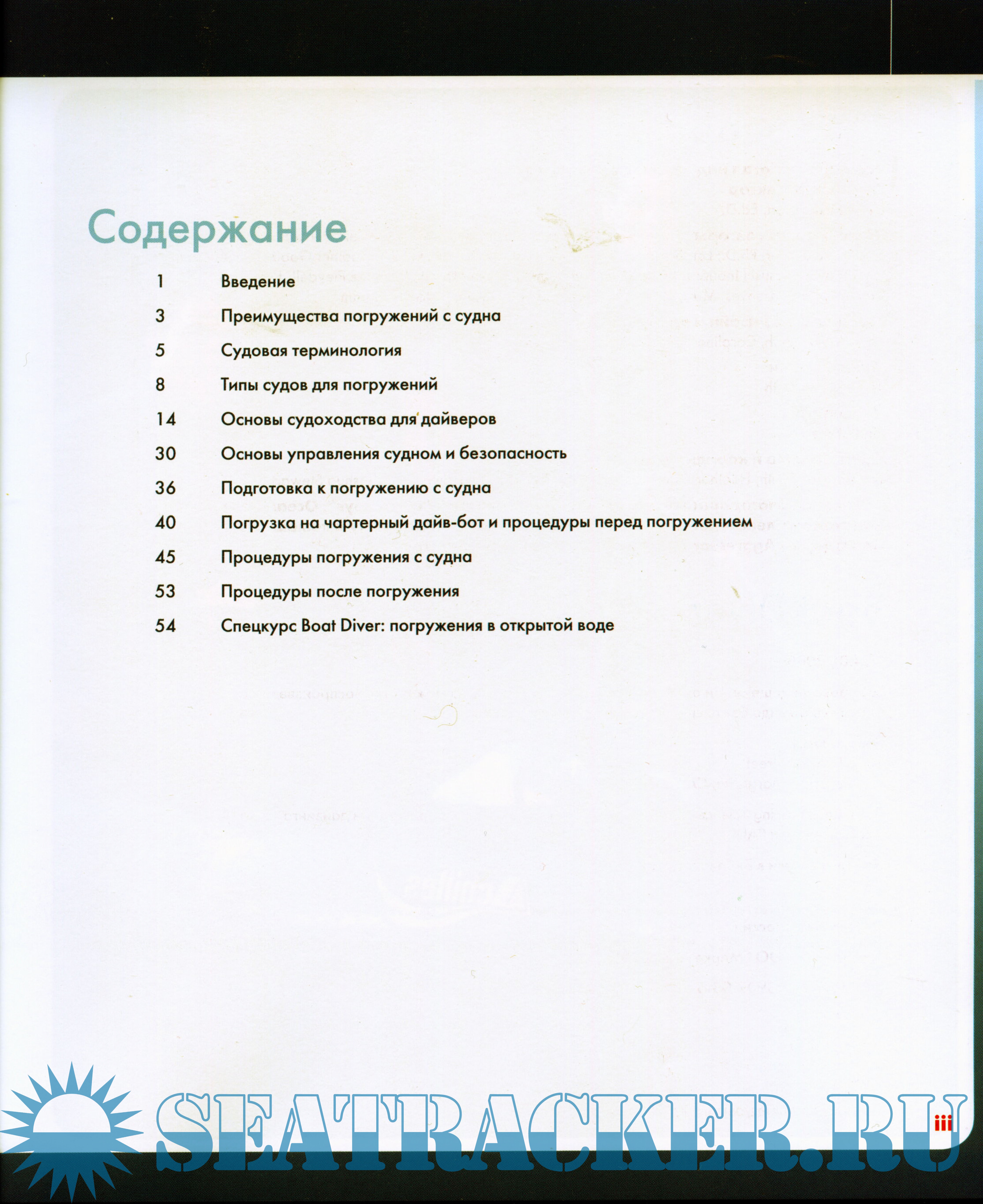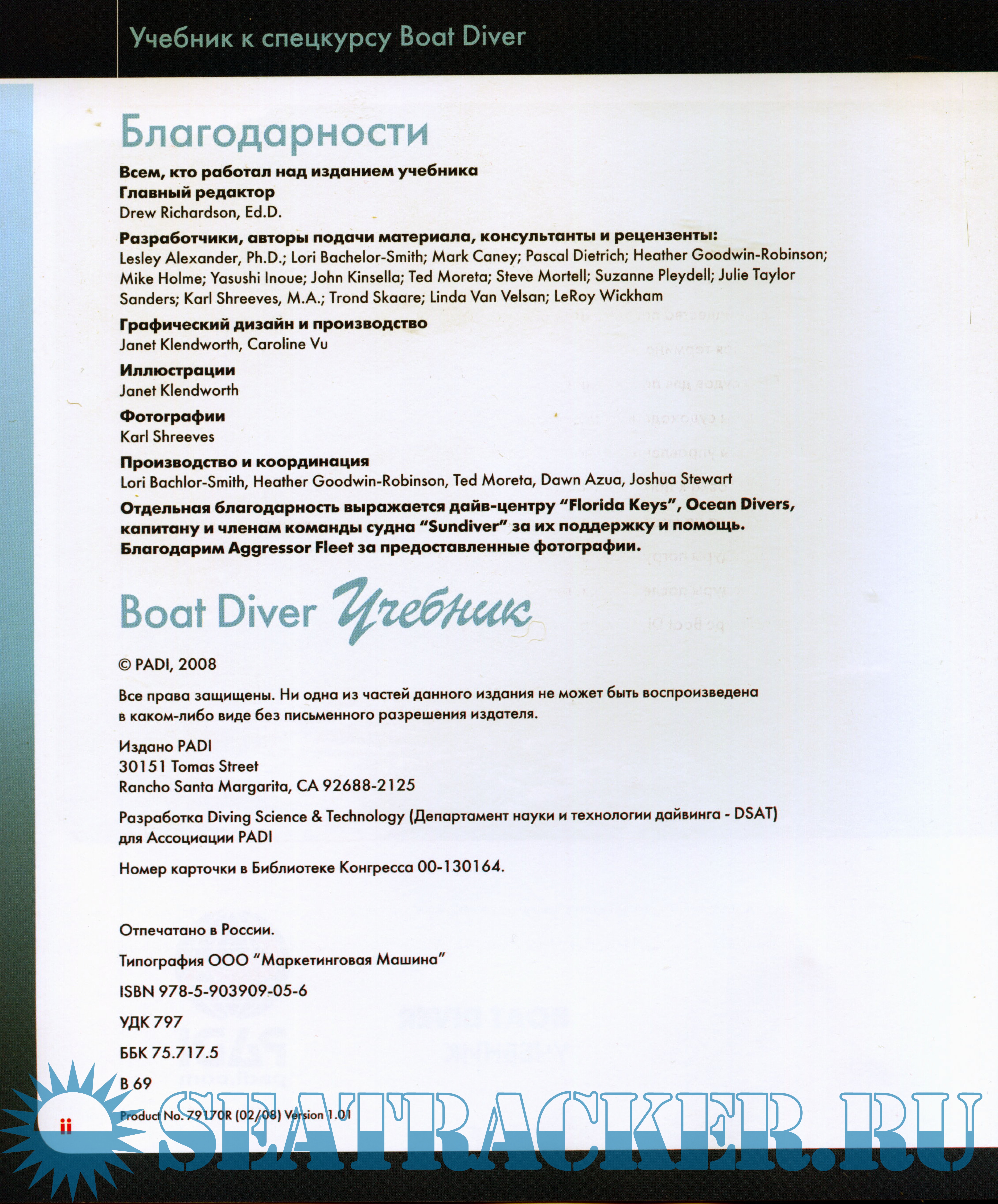 Год выпуска: 2008 Язык: русский Автор: International PADI, Inc. Жанр: Учебное пособие Издательство: International PADI, Inc. ISBN: 978-5-903909-05-6 Формат: PDF Качество: Отсканированные страницы Количество страниц: 66 Описание: Спецкурс PADI Boat Diver предоставит вам необходимые знания для того, чтобы с удовольствием совершать безопасные погружения с борта дайв-бота, о также даст общее представление о морской nпрактике. Структура спецкурса достаточно гибкая, он принесет вам пользу независимо от того, планируете ли вы нырять с борта крупного чартерного дайв-бота в тропических водах или с маленькой частной лодки в умеренном климатическом nпоясе. Спецкурс научит вас извлекать из погружений с дайв-ботов намного больше удовольствия, независимо от того, используете ли вы плавсредства, чтобы добраться до места погружения или рассматриваете прогулки по воде как отдельный вид развлечений. Заявление об ограничении ответственности. Дайвинг - это вид занятий, сопряженный с риском. Каждый дайвер в отдельности, принимающий участие в любом виде погружений, обязан согласиться с рисками и принять на себя ответственность за свои действия. Автор и издатель (и уж тем более раздающий) не несут никакой ответственности ни перед кем за утери, повреждения, травмы или смерть, вызванные любыми ошибками, пропусками в тексте, а также личной интерпретацией текста дайвером. Любая подобная ответственность не признается. Информация в данном пособии относится к дайвинrу с аквалангом и должна использоваться только как дополнение к утвержденному курсу обучения, который проводит сертифицированный инструктор. Данный учебник не может заменить профессиональный инструктаж и здравое отношение.