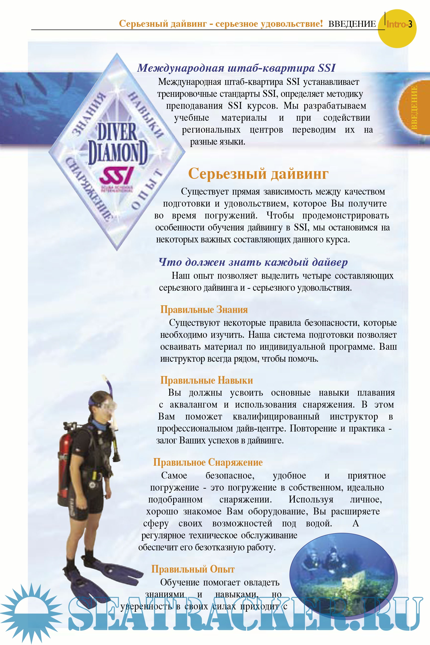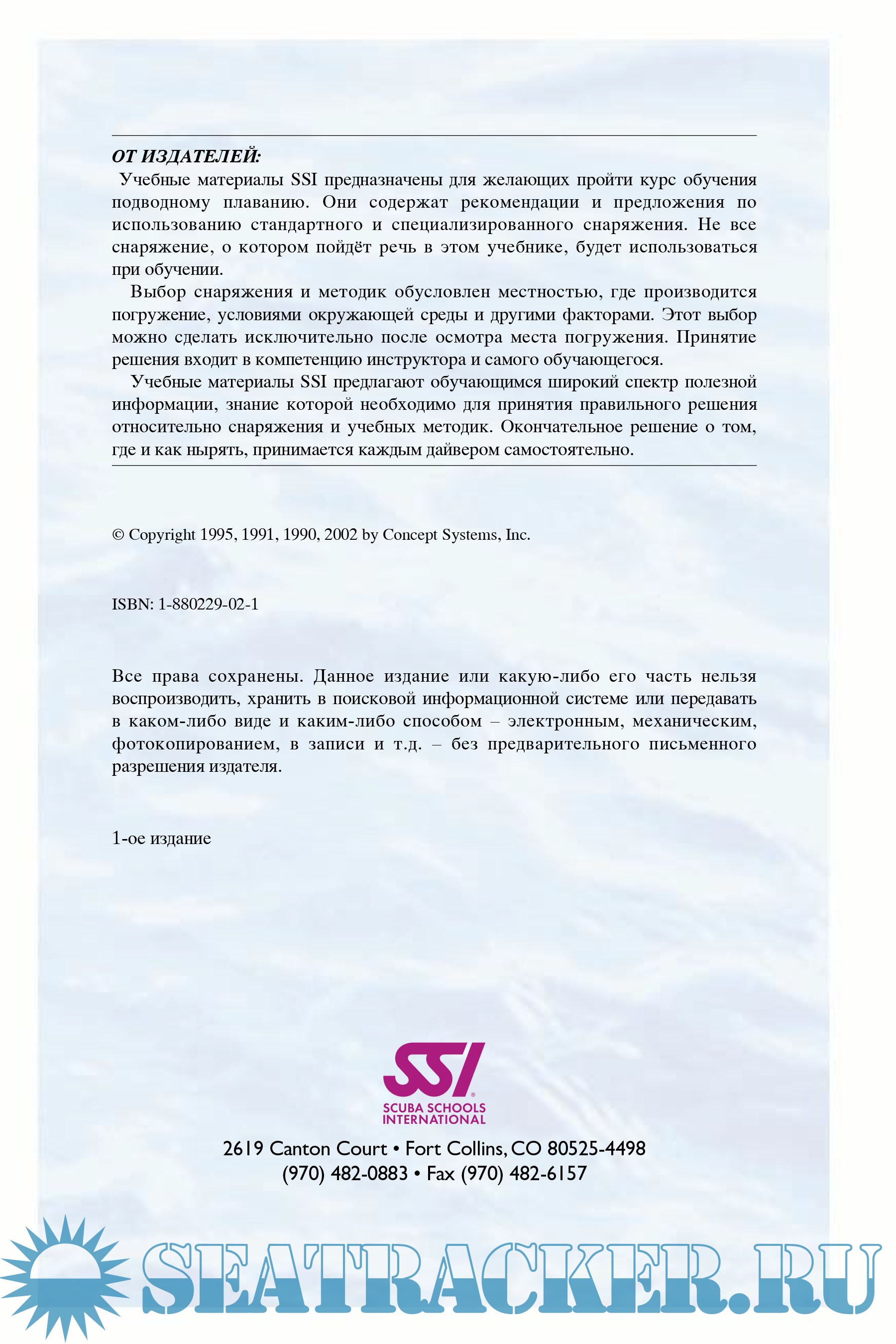 Описание: Учебные материалы SSI предназначены для желающих пройти курс обучения подводному плаванию. Они содержат рекомендации и предложения по использованию стандартного и специализированного снаряжения. Не все снаряжение, о котором пойдёт речь в этом учебнике, будет использоваться при обучении.Выбор снаряжения и методик обусловлен местностью, где производится погружение, условиями окружающей среды и другими факторами. Этот выбор можно сделать исключительно после осмотра места погружения. Принятие решения входит в компетенцию инструктора и самого обучающегося.Учебные материалы SSI предлагают обучающимся широкий спектр полезной информации, знание которой необходимо для принятия правильного решения относительно снаряжения и учебных методик. Окончательное решение о том, где и как нырять, принимается каждым дайвером самостоятельно.