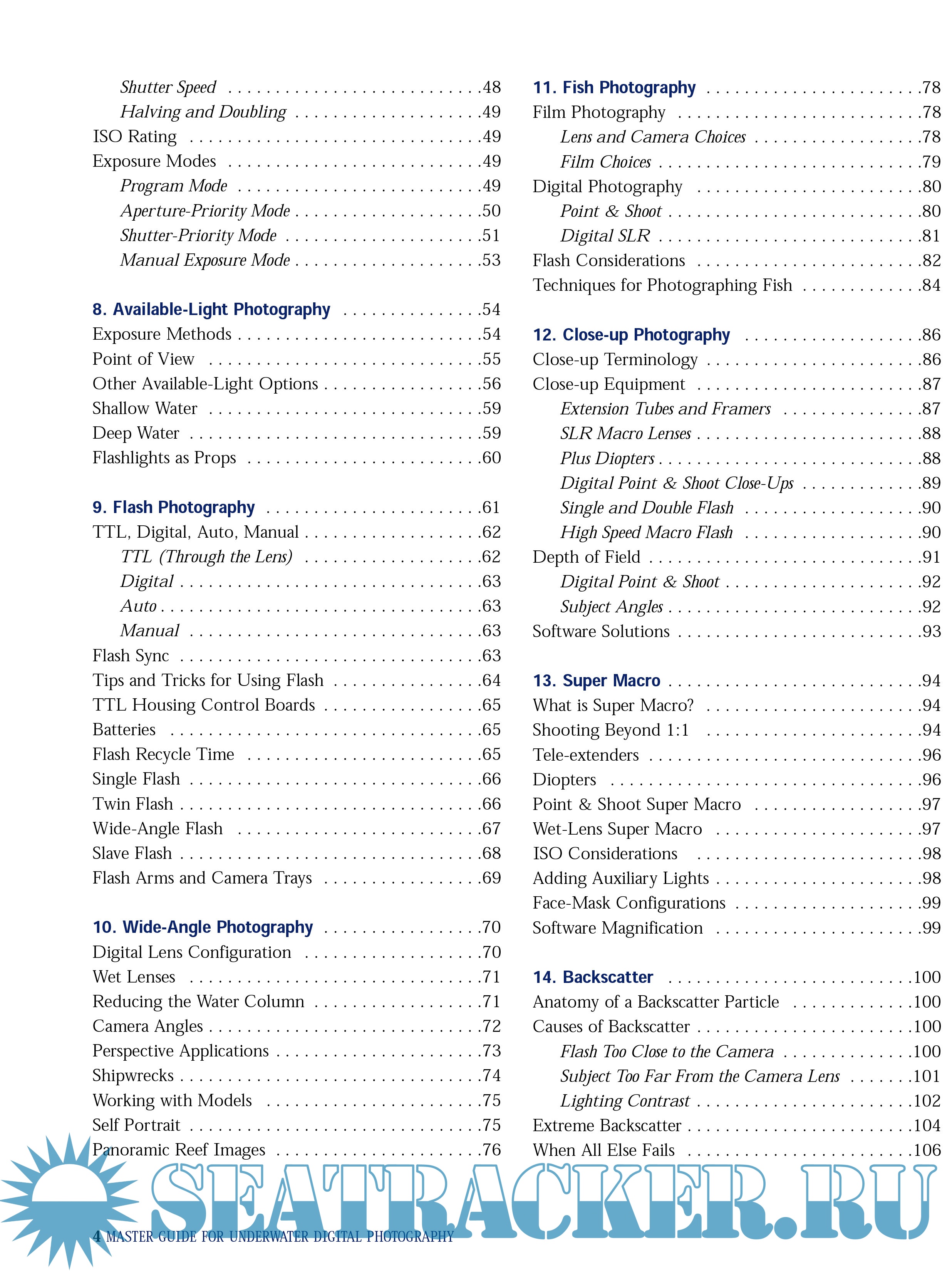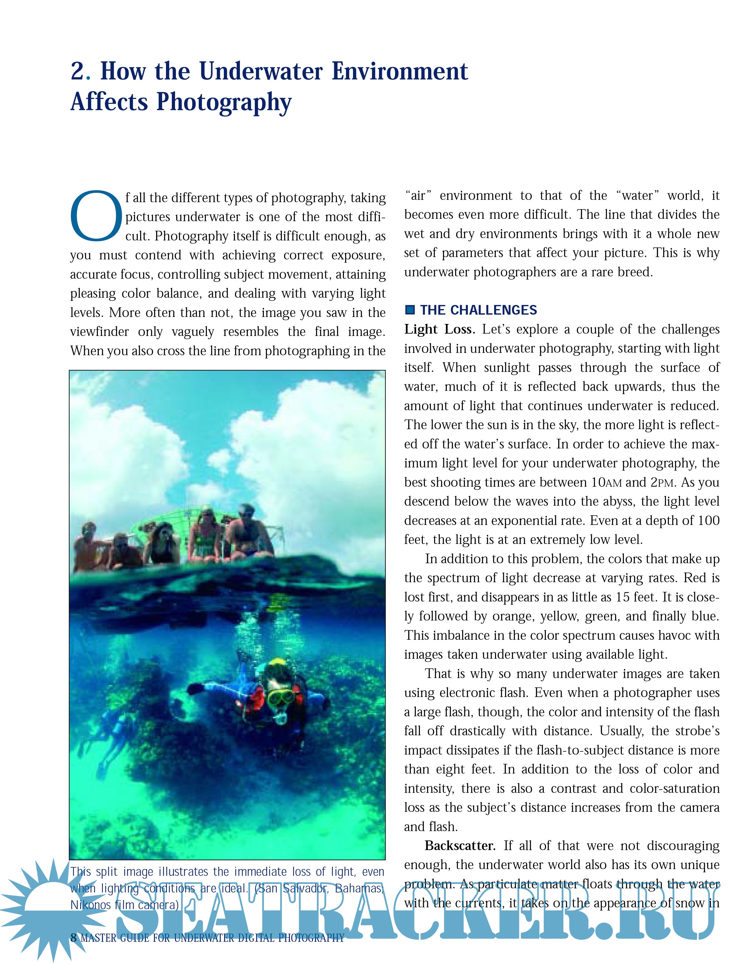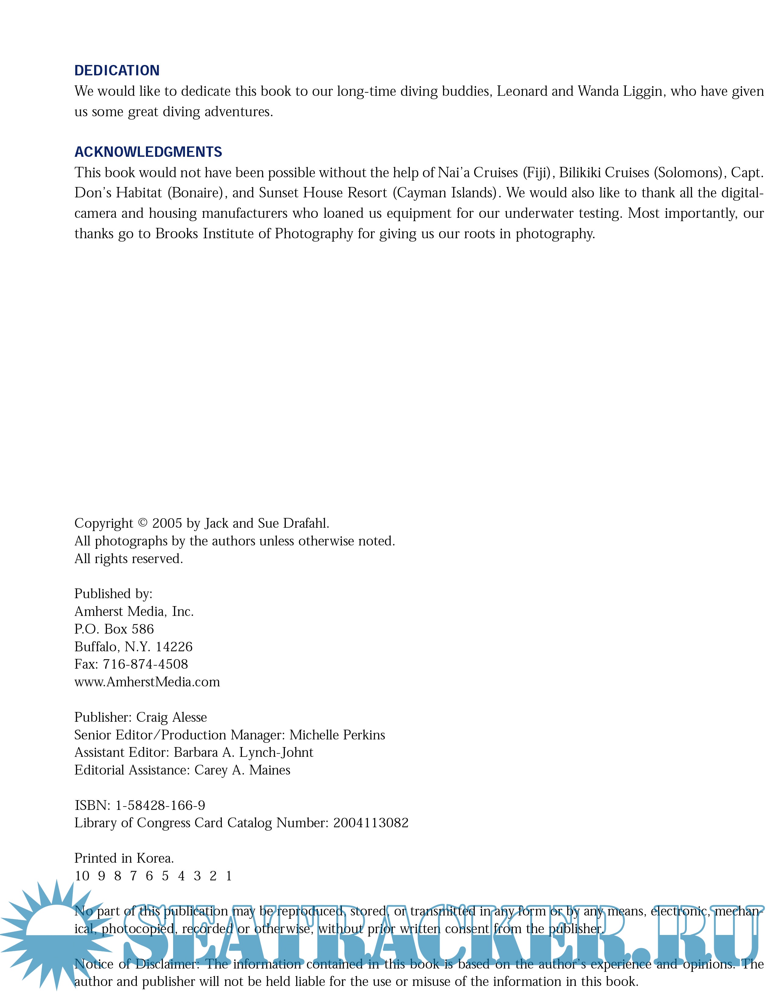 Year: 2005 Language: english Author: Jack and Sue Drafahl Genre: Guide Publisher: Amherst Media, Inc. ISBN: 1-58428-166-9 Format: PDF Quality: eBook Pages count: 130 Description: MASTER THE SKILLS YOU NEED TO CREATE DAZZLING PHOTOS WITH YOUR UNDERWATER DIGITAL CAMERA Learn to make the most of this exciting new technology with tips for purchasing gear, selecting camera settings, and taking your first dive with a digital camera. Also included are exposure techniques, lighting tips, and ideas for close-up photography. Packed with dramatic images and clear, step-by-step techniques, this book will inform and inspire underwater photographers of all skill levels. FEATURES: -Important advice for buying underwater digital photography equipment -Tips for preparing for and taking your first dive with a digital camera -Using digital-camera menu controls for flawless underwater images -Professional exposure and lighting techniques — from available-light images to single- and twin-flash photography -Dealing with common problems like blooming and backscatter -Ideas for dramatic close-up and super macro photography—from equipment selection to lighting and shooting -Techniques for photographing fish, shipwrecks, panoramic reef images, and more -Advice for traveling with and maintaining your underwater digital photography equipment