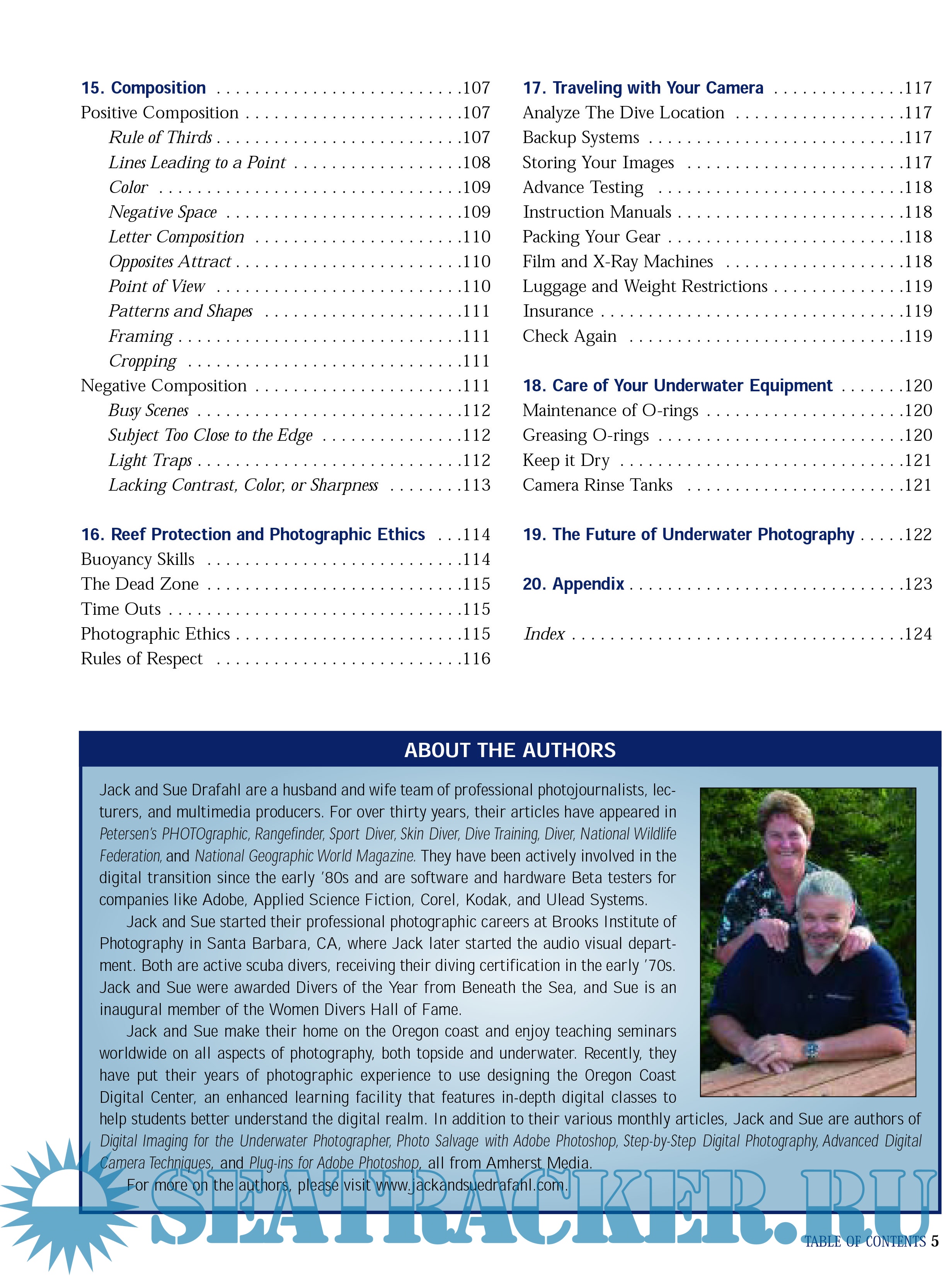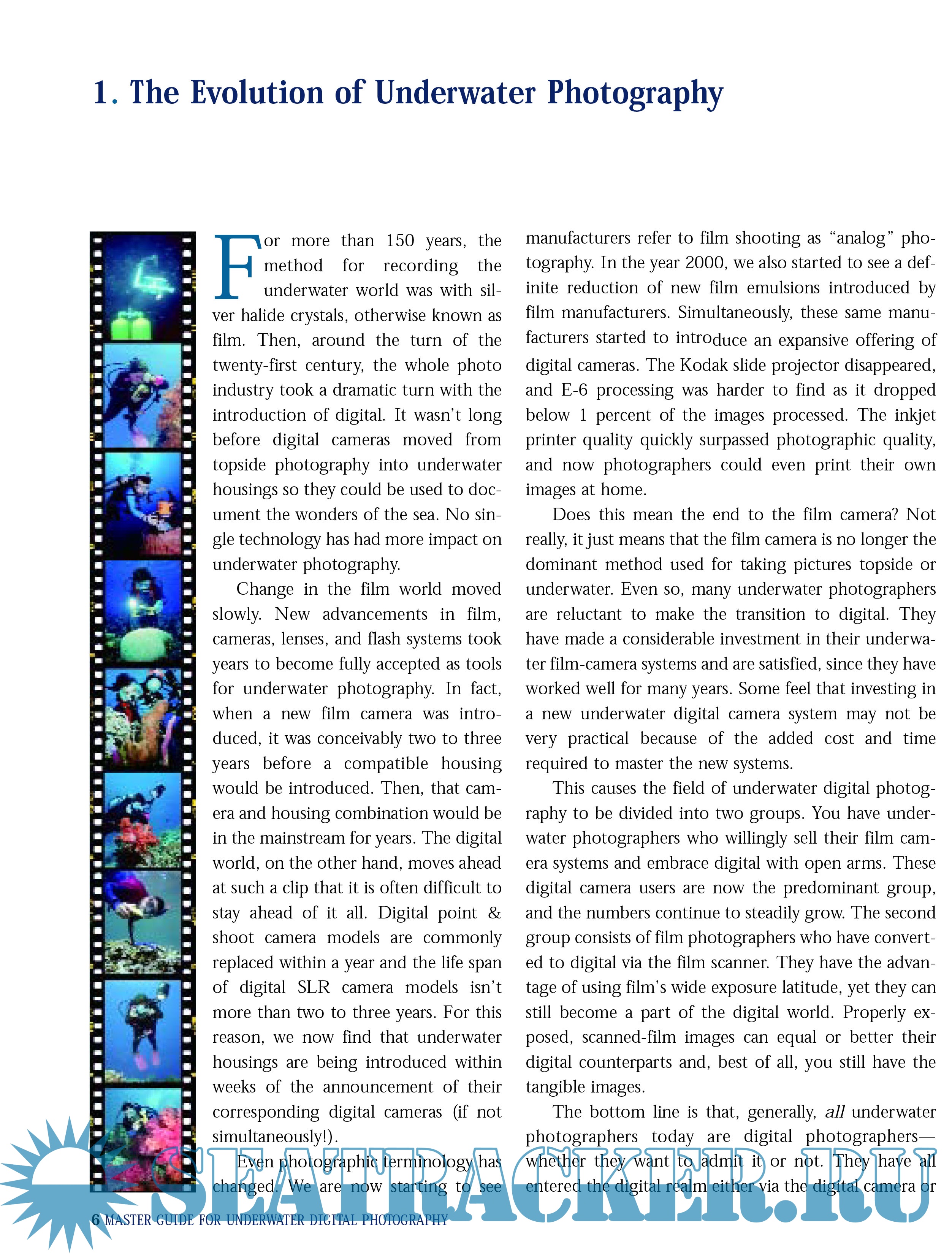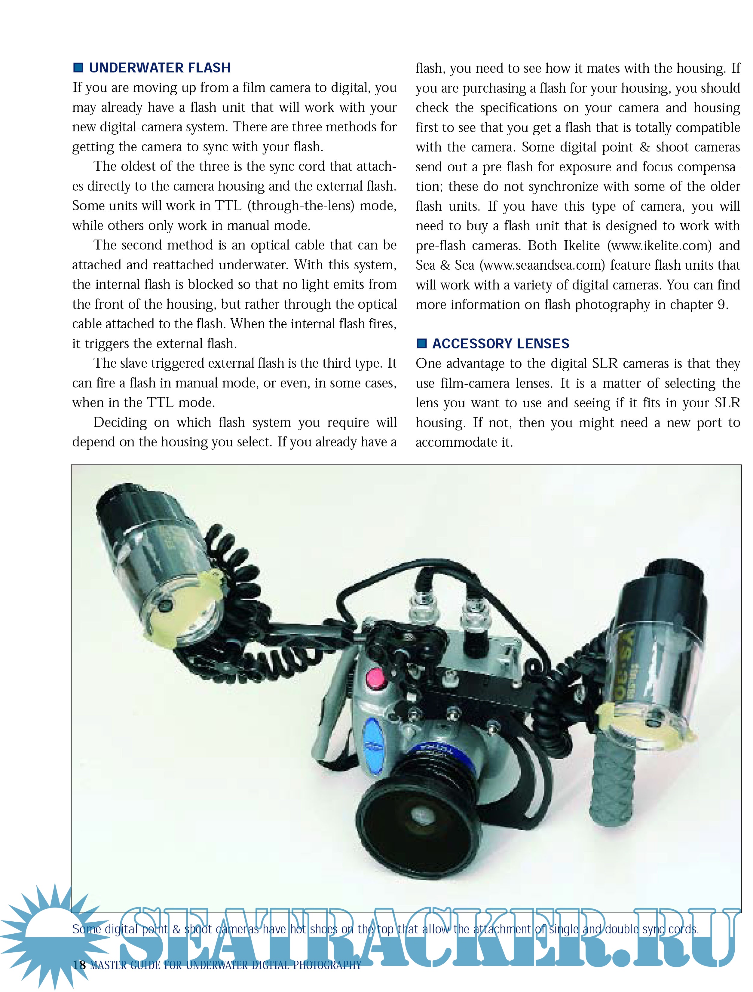 Year: 2005 Language: english Author: Jack and Sue Drafahl Genre: Guide Publisher: Amherst Media, Inc. ISBN: 1-58428-166-9 Format: PDF Quality: eBook Pages count: 130 Description: MASTER THE SKILLS YOU NEED TO CREATE DAZZLING PHOTOS WITH YOUR UNDERWATER DIGITAL CAMERA Learn to make the most of this exciting new technology with tips for purchasing gear, selecting camera settings, and taking your first dive with a digital camera. Also included are exposure techniques, lighting tips, and ideas for close-up photography. Packed with dramatic images and clear, step-by-step techniques, this book will inform and inspire underwater photographers of all skill levels. FEATURES: -Important advice for buying underwater digital photography equipment -Tips for preparing for and taking your first dive with a digital camera -Using digital-camera menu controls for flawless underwater images -Professional exposure and lighting techniques — from available-light images to single- and twin-flash photography -Dealing with common problems like blooming and backscatter -Ideas for dramatic close-up and super macro photography—from equipment selection to lighting and shooting -Techniques for photographing fish, shipwrecks, panoramic reef images, and more -Advice for traveling with and maintaining your underwater digital photography equipment
