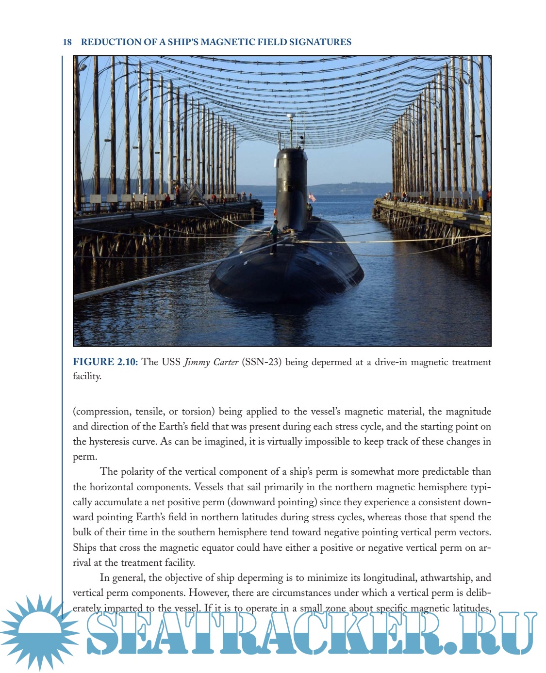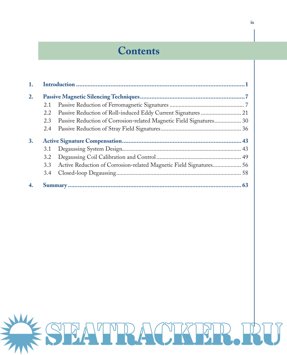 Year: 2008 Language: english Author: Holmes J.J. Genre: Technical book Publisher: Morgan and Claypool Publishers ISBN: 159829248X Format: PDF Quality: Scanned pages Pages count: 78 Description: Decreasing the magnetic field signature of a naval vessel will reduce its susceptibility to detonating naval influence mines and the probability of a submarine being detected by underwater barriers and maritime patrol aircraft. Both passive and active techniques for reducing the magnetic signatures produced by a vessel's ferromagnetism, roll-induced eddy currents, corrosion-related sources, and stray fields are presented. Mathematical models of simple hull shapes are used to predict the levels of signature reduction that might be achieved through the use of alternate construction materials. Also, the process of demagnetizing a steel-hulled ship is presented, along with the operation of shaft-grounding systems, paints, and alternate configurations for power distribution cables. In addition, active signature reduction technologies are described, such as degaussing and deamping, which attempt to cancel the fields surrounding a surface ship or submarine rather than eliminate its source.