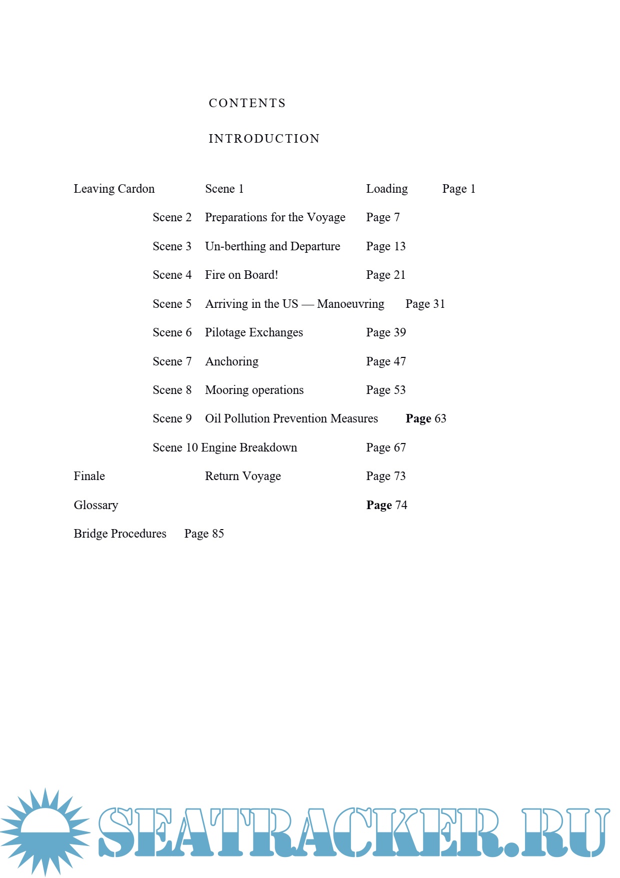 Each scene contains dialogues and descriptive passages followed by extracts from the Standard Marine Navigational Vocabulary related to that particular scene. In some cases, documents, check lists and forms have also been included. In order for the material to he fully exploited various language exercises are given. These, together with the dialogues can also be found on the cassettes. The pack contains check lists of Bridge Procedures which can be a useful guide, and should be used as a key to projects set at the end of various scenes.