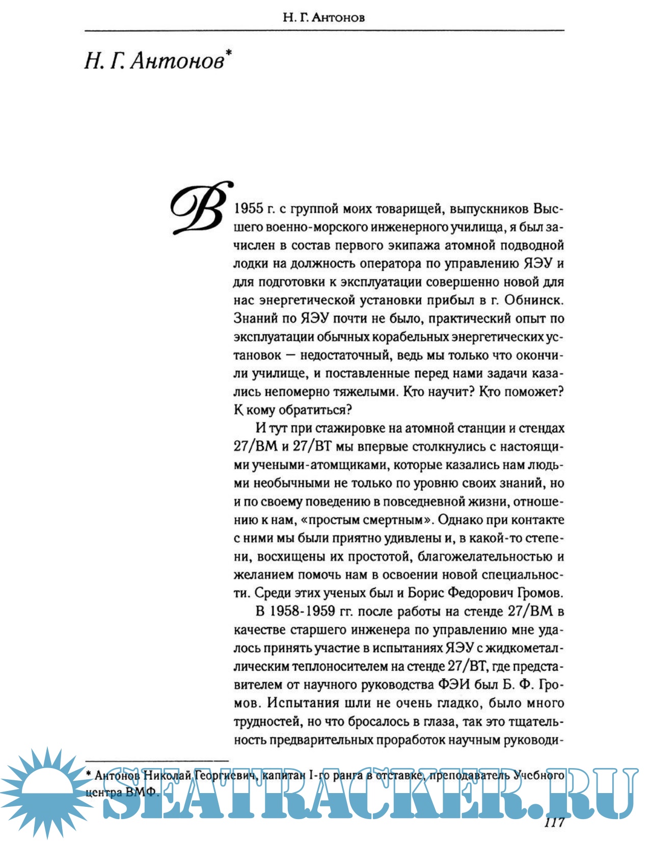Описание: Книга посвящена 80-летию со дня рождения Громова Бориса Фёдоровича - заместителя директора Физико-энергетического института (1972—2000), лауреата Ленинской премии (1961), лауреата Государственной премии СССР, заслуженного деятеля науки и техники РСФСР. Громов впервые в мире обосновал атомную энергетическую установку с жидкометаллическим теплоносителем (ЖМТ), ставшей прообразом последующих реакторов для атомных подводных лодок. В Северодвинске был построена АПЛ проекта 645 с двумя реакторами, охлаждаемыми жидкометаллическим теплоносителем. Лейпунский и Громов курировали все этапы её строительства и монтажа. В 1968 году после нескольких успешных автономных походов в подлёдные северные воды, экваториальные воды и Средиземное море произошла авария на реакторе правого борта, в результате которой погибло несколько человек. Громов взял ответственность за эту аварию на себя и выступил координатором работ по улучшению реактора.