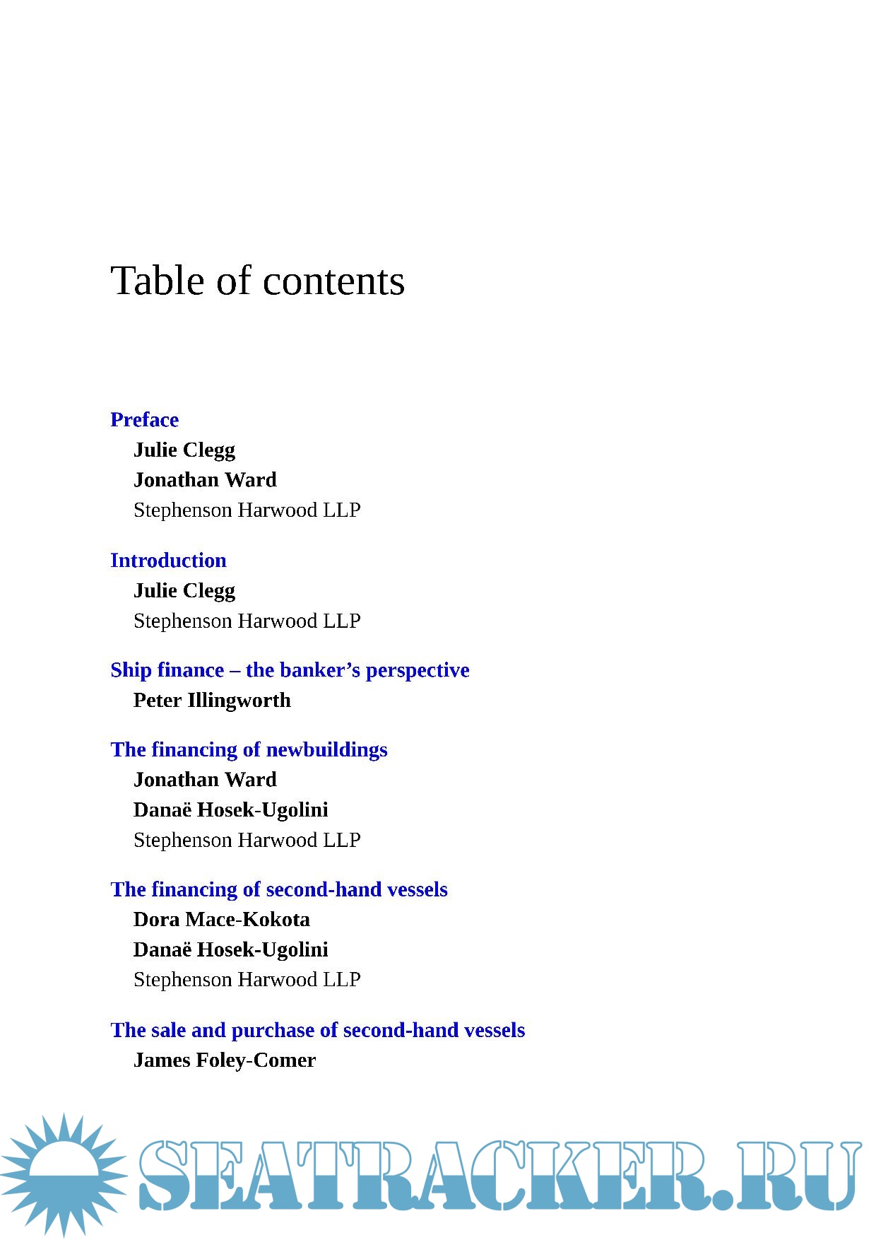 Chapters include: shipping finance from a banker's perspective; the financing of secondhand ships; the financing of new buildings; assignments of insurances and earnings, guarantees, indemnities, charges, debentures and other security relied upon by financiers; the sale and purchase of secondhand ships; the role of insurance in shipping; Islamic finance; Chinese leasing; and restructuring.