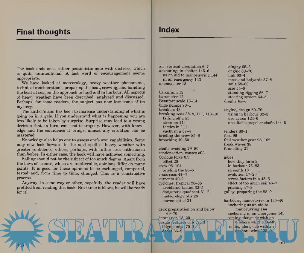 While Dietrich von Haefton's book deal with storm tactics, half of the book is devoted to the causes and effects of weather and how they affect boats. The book makes it clear that coping with storms requires the mariner to know what kind of storm is confronting him and he will be better prepared by knowing how the storm will evolve. The book deals exclusively with sail boats, but this should not diminish its value to power boaters because the common denominator is weather and sea conditions and their effect on the boat and crew. An important chapter, too often over looked in other articles and books about storms, is von Haeften's chapter on Gales in Harbour. For sheer opportunities for collision, damage and injury, nothing can surpass violent weather in a harbor crowded with unprepared and uncrewed boats.