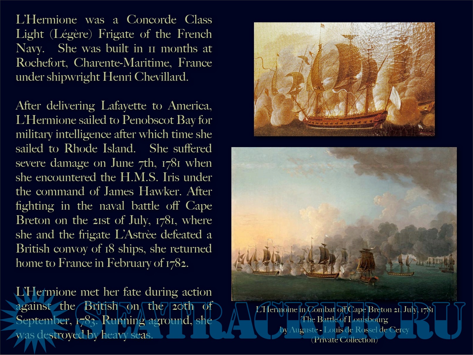 Description: NEW YORK, Feb. 11, 2015 /PRNewswire/ -- The Friends of Hermione-Lafayette in America, Inc., announce Lafayette's Hermione Voyage 2015, a two-month 'Re-Living History' sail to commemorate the Hermione, the Frigate of Freedom, that delivered the young Marquis de Lafayette in 1780 to General Washington with full French aid. They, together, turned the tide of the American Revolution. The authentically reconstructed Hermione, 17 years in the re-making, will sail 3,819 miles across the Atlantic to land in Yorktown on June 5th, before sailing up the coast to 11 additional iconic ports for an unprecedented two months of events. Visitors can join the festivities at any point along the route and enjoy tours on board or pier-side where activities are scheduled, including, historic shipbuilding crafts demonstrations, interactive conversations with the young volunteer sailors, and a lineup of cultural activities like costumed performances by seasoned re-enactors, concerts of period and contemporary music and food and craft exhibitions.
