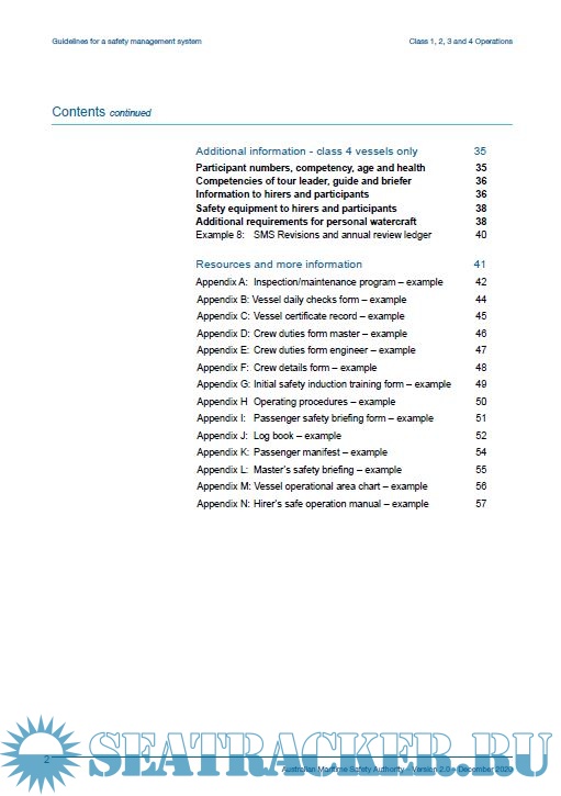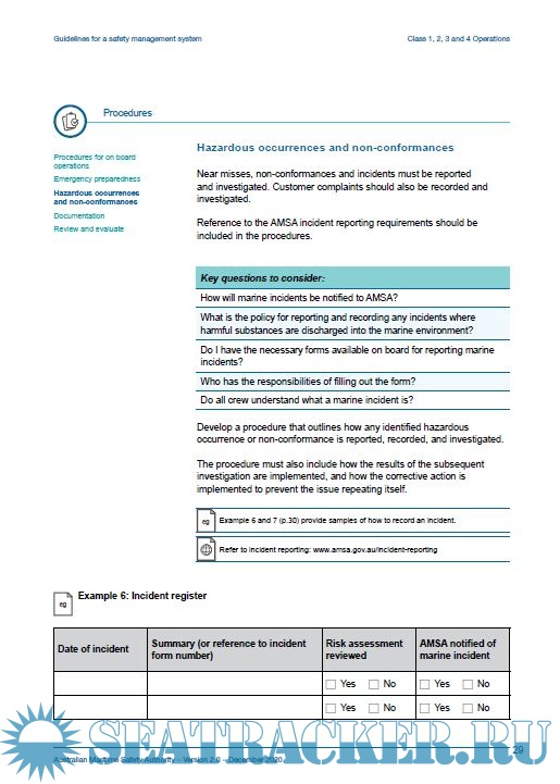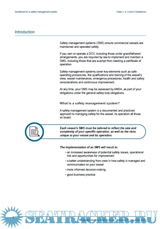 Year: 2020 Language: english Author: AMSA Genre: Guide Publisher: Australian Maritime Safety Authority (AMSA) Edition: v.2.0 Format: PDF Quality: Unknown Pages count: 64 Description: The Australian Maritime Safety Authority (AMSA) works with domestic commercial vessels (DCV) toensure they operate safely through the implementation and maintenance of a safety management system(SMS) for each vessel. Scope: These guidelines provide information and examples to help DCV owners and operators develop an SMS.Each vessel’s SMS must be tailored to reflect the size, complexity and area of opereation, as well as therisks unique to their vessel and its operation. Application: This user guide applies to all owners and operators of DCVs who are required by law to implement andmaintain an SMS, including those under grandfathered arrangements and those that are exempt fromneeding a certificate of operation.
