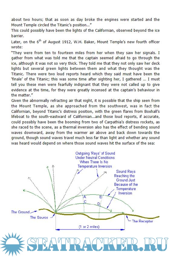 "Tim Maltin has shown that there was a strong superior-mirage display in the ice-field where Titanic sank, using both archival weather records and the logs of numerous ships in the area. The mirage and related refraction phenomena, such as looming, contributed to the confusion at the time of the accident. In particular, he has established that the crews of the Titanic and Californian saw each other's signals, but were unable to interpret them because of atmospheric effects acting in the unexpectedly large distance between the two ships."