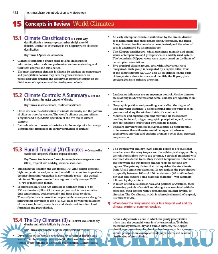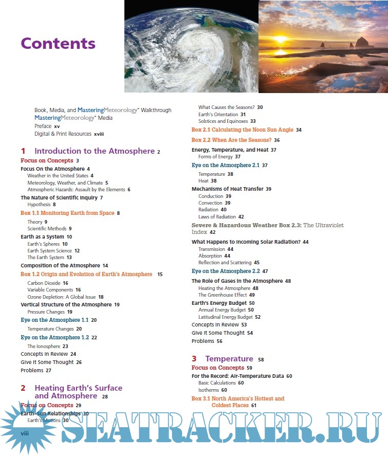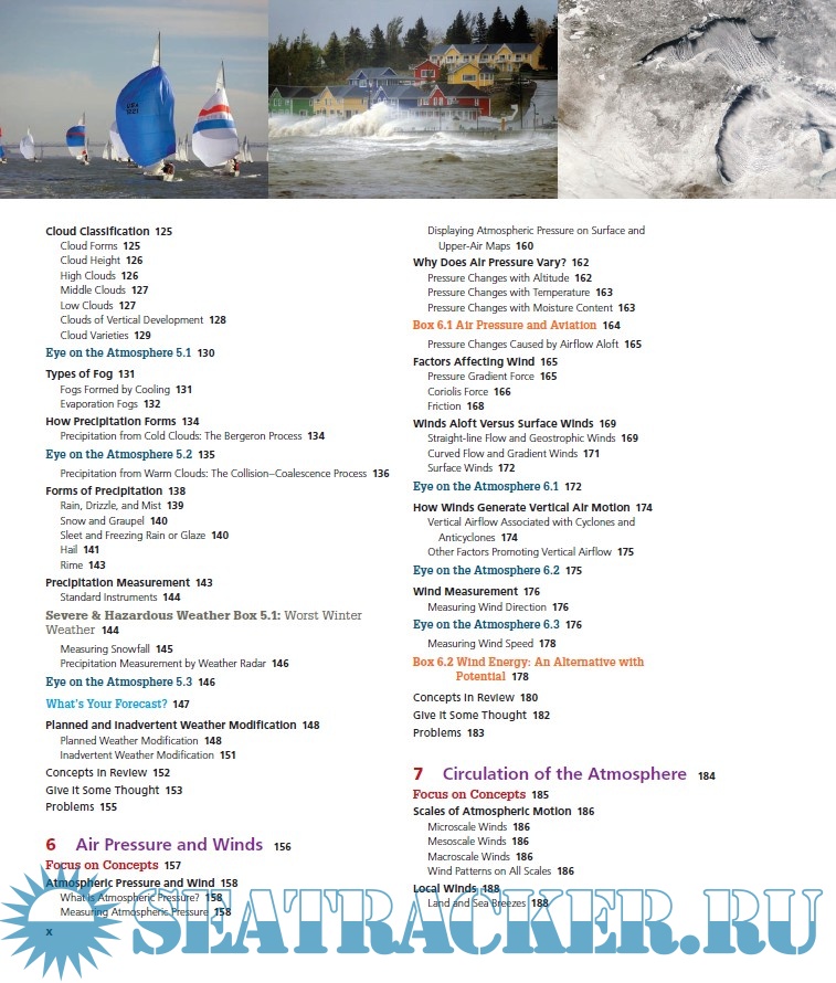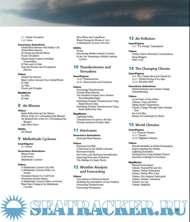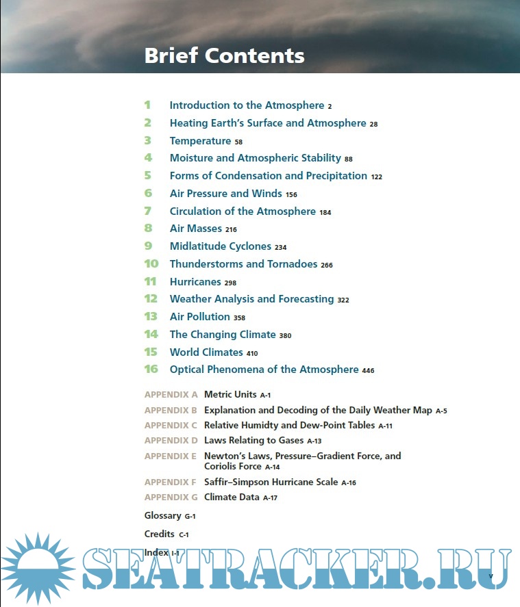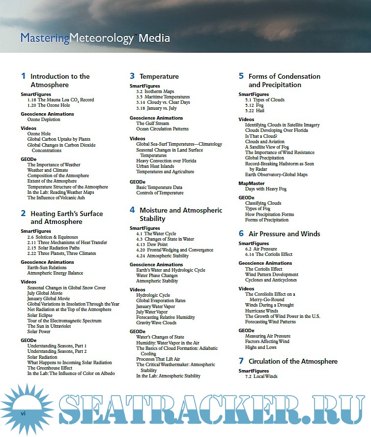 Year: 2016 Language: english Author: Frederick K. Lutgens, Edward J. Tarbuck Genre: Manual Publisher: Pearson Edition: 13th ISBN: 978-0-321-98462-3 Format: PDF Quality: eBook Pages count: 540 Description: This text, a well-known introductory meteorology text, is aimed to first-approach readers and college students, as a beginning course in meteorology. Topics cover, in a plain and non-technical language, a survey of atmospheric phenomena and weather forecasting. To meet this goal the 13th edition incorporates a new active-learning approach, integrates mobile media, and is full of useful and innovative learning tools. - Mastering Meteorology focus on course objectives and students progresses, and includes instructor resources. - What’s Your Forecast? provides students with forecasting activities. Students are guided to make predictions based on real-world data. - SmartFigures and Integrated Mobile Media are videos that explain concepts or depict animations of key phisical processes, accessible on web by scanning Quick Response (QR) codes - New and expanded active learning path. Every chapter begins with Focus on Concepts. Concept Checks allow students to check their comprehension before moving on to the next section. Each chapter concludes with a series of questions that challenge learners skills.
