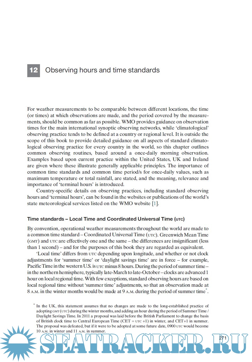 Topics on traditional and modern weather instruments are covered, as well as how best to choose and to site a weather station, how to get the best out of one's equipment, how to store and analyze weather records, and how to share observations with other people and across the Internet. The guide follows the World Meteorological Organization recommendations on observing methods and practices, and focuses on procedures to accurately measure the weather variables.