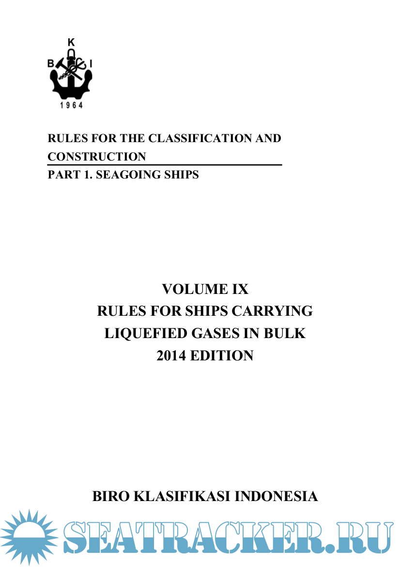 Description: This rules is a Part 1-Seagoing Ship, Volume IX-Rules for Ships Carrying Liquefied Gas in Bulk 2014 edition and an amendment of previous edition 2013. This rules is based on the technical requirements of the International Code for the Construction and Equipment of Ships Carrying Liquefied Gases in Bulk (IGC Code), which are all contained in their entirety and are required for classification.