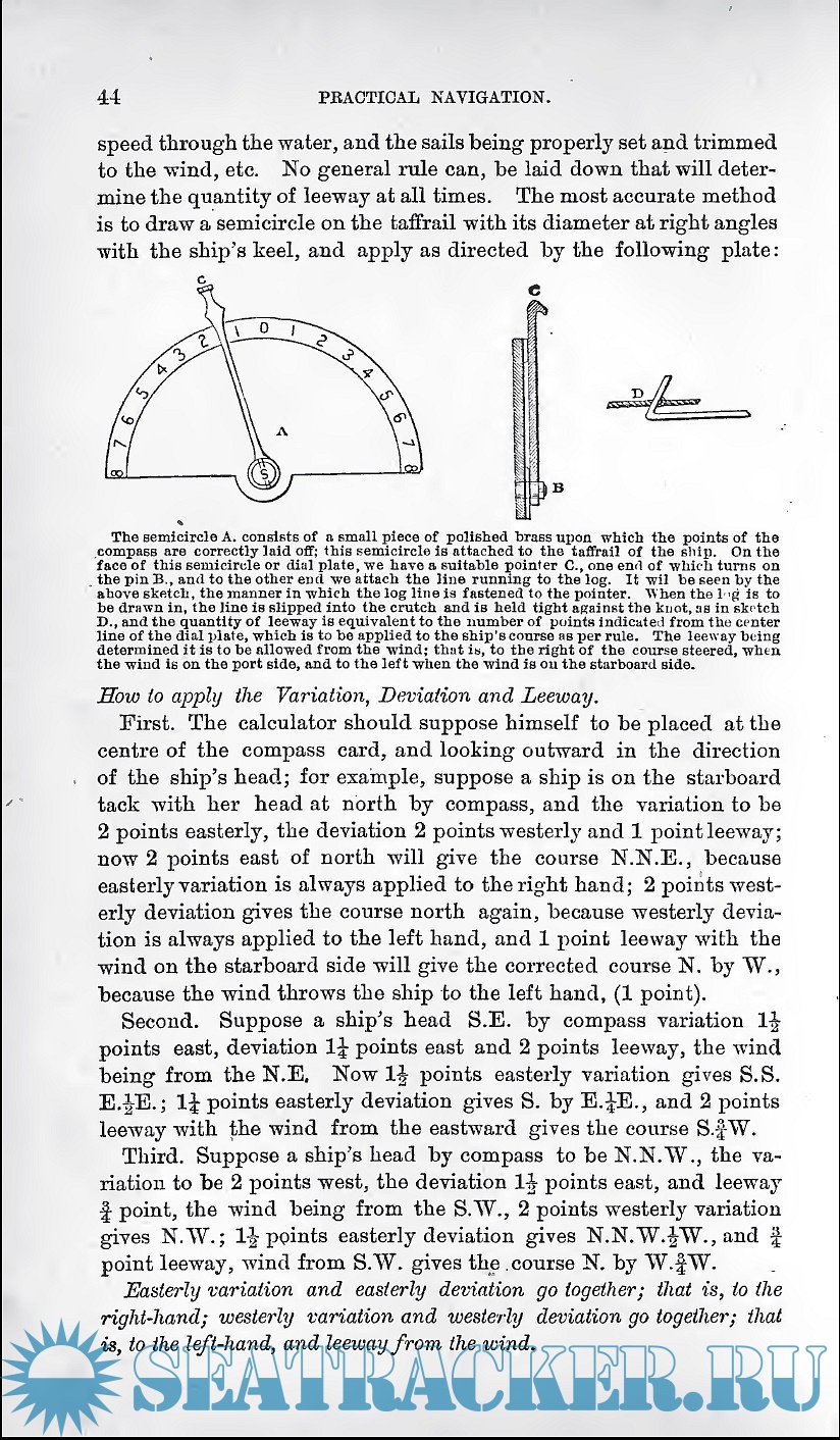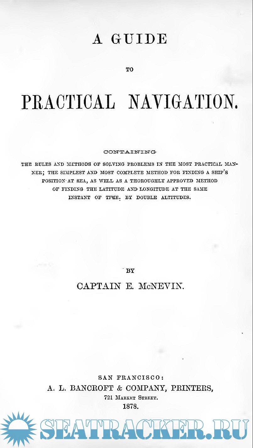 Year: 1878 Language: english Author: Edmund McNevin Genre: Manual Publisher: A. L. Bancroft & Co. Format: PDF Quality: Scanned pages + text layer Pages count: 360 Description: This manual has been written by a twenty years experienced merchant marine master, and has been written for seamen, instead of scholars or scientists. It is clearly aimed to help the navigator to find quickly and accurately his position at sea in the simplest possible way, and by choiche avoids all other methods of determining latitude and longitude, either difficult or poorly accurate, such as lunar observations. Some useful and, for the time, innovative methods are given. The author calls out the student's special attention to the system of finding simultaneously latitude and longitude by double altitude, and to a leeway indicator (a diagram is given). For finding latitude by star altitudes refers to the American Ephemeris for the declination of the fixed stars instead of to the English tables, with the notation of the former. Content well detail topics.