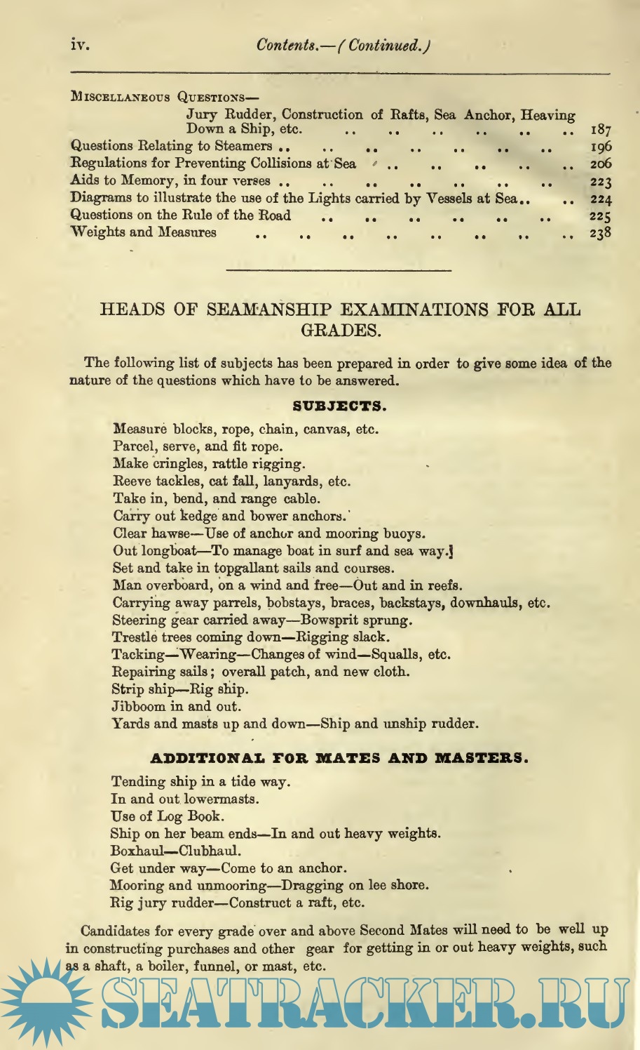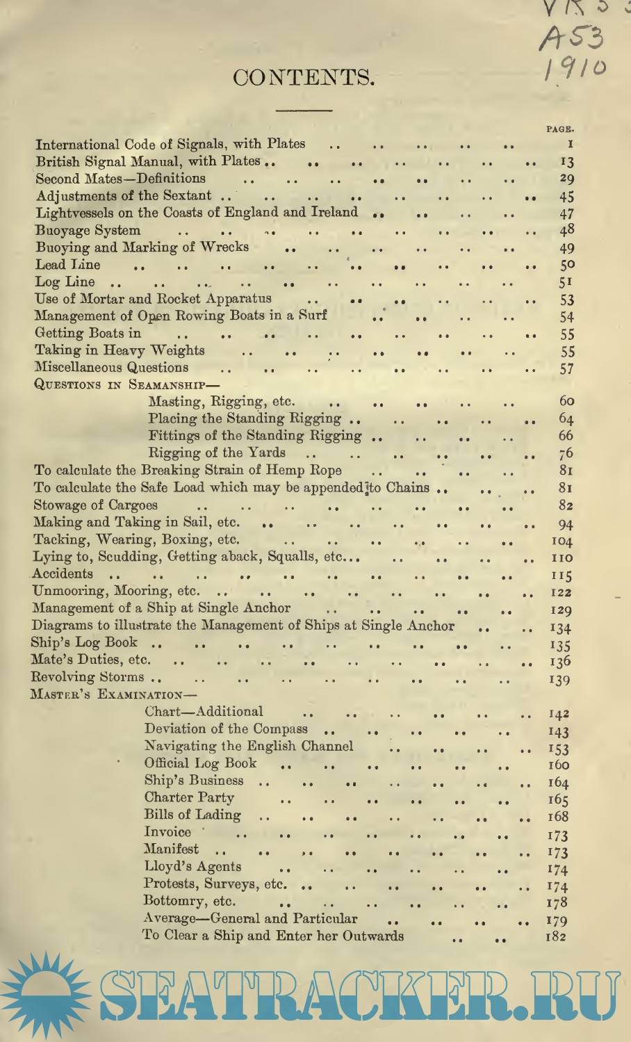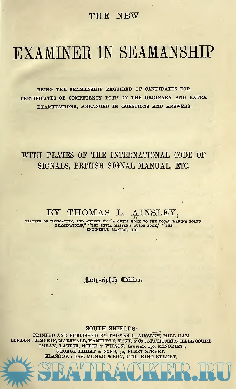 Year: 1910 Language: english Author: Thomas L. Ainsley Genre: Textbook Publisher: Thomas L. Ainsley Edition: 48th Format: PDF Quality: OCR without errors Pages count: 268 Description: This manual is a revised and enlarged edition of a famous text book for Candidates preparing for the Board of Trade Examinations, UK. Seamanship Notes, subjects required for Certificates of Competency both in the ordinary and extra examinations, are arranged in Form of Questions and Answers. Many additions have been made, including full explanations and illustrations of the " British Signal Manual," a thorough knowledge of this Code being necessary to pass the examination. The " International Code of Signals" has received special attention, and numerous illustrated examples added, plus a chapter on miscellaneous questions. The book is in form of "questions and answers" ready to be studied by the examinee.