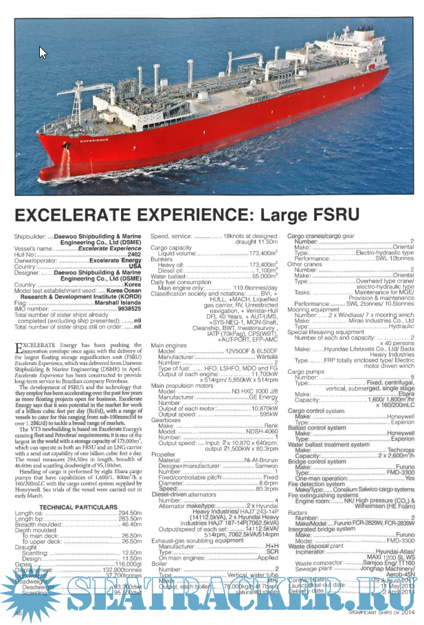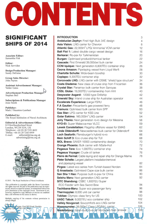 Significant Ships of 2014 The Newbuildings included in this volume of Significant Ships of 2014:Significant Ships 2014 Cover Andalucian Zephyr: First High Bulk 34E design Asia Vision: 160,000cu.m LNG carrier for Chevron Atlantic Gas: 22,000cu.m LPG/ Ammonia/ VCM carrier Balt Flot 1: Latest double cargo vessel design Berkarar: 2,400dwt Ro-pax for Turkmenistan Burgan: Optimised 38,000dwt product/chemical tanker Cascade: First Emerald 39,000dwt bulk carrier CCNI Iquique: Next generation 6,800TEU container ship Ceona Amazon: Pipelaying vessel from Lloyd Werft Charlotte Schulte: Wide-beam 5,400TEU boxship Copiapo: 9,300TEU container ship Corcovado LNG: 159,800cu.m LNG carrier with DSME “shield type structure” Costa Diadema: New class of 4,947 passenger cruise ship from Fincantieri Crystal Star: 82,000dwt Panamax bulk carrier from Sanoyas CSSL Globe: 19,000TEU containership from HHI Deepwater Asgard: 12000 type Drillship Emerald Sky: Inland cruise ship for Australian operator Excelerate Experience: Large 173,000cu.m FSRU F.A Gautier: Fincantieri’s gas-powered ferry Framura: Optimised 63,087dwt bulk carrier from SPP Gas Star: 84,100cu.m LPG carrier for KSS Line Golar Eskimo: 160,000cu.m LNG carrier Jolly Titanio: Next generation ro-ro design for Messina KYO-EI: Super Malacca-max 318,000dwt VLCC Lewek Constellation: Flagship offshore vessel for EMAS Linda Oldendorff: Newcastlemax 172,970dwt bulk carrier for Oldendorff Loch Seaforth: Flensburger's hybrid ro-ro Mein Schiff 3: Eco cruise ship for TUI MOL Bravo: SAVER 10000 containership design Orange Phoenix: 206,600dwt Bulk carrier with NSafe-Hull Pegasus Tera: Eco 1,000TEU container ship Pegasus Voyager: 155,720dwt Crude oil tanker Pierre de Fermat: Cable laying and repair ship for Orange Marine Pieter Schelte: Largest platform installation/removal and pipelaying vessel Pirgos: Latest eco series 9,000dwt general cargo vessel from Turkish-based Norden Q Anastasia: Optimised Cape size 180,000dwt bulk carrier San Sha 1 Hao: Purpose built ro-pax for China Seishu Maru: Next generation 155,696cu.m LNG carrier SITC Shandong: CSBC 1,800TEU Super ECO Feeder with Sea Sword Bow Tachibana-Maru: Super eco passenger ferry Thermopylae: 8,000 unit car carrier Tokitae: Olympic class ferry for US Washington State Ferries UASC Tabuk: 9,000TEU eco container ship Velikiy Novgorod: Sovcomflot’s eco 170,200cu.m LNG carrier Waasmunster: 38,000cu.m Class LPG/NH3 carrier Wedellsborg: Italian-built ro-ro for Nordana’s fleet renewal