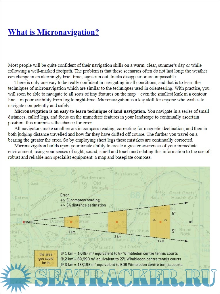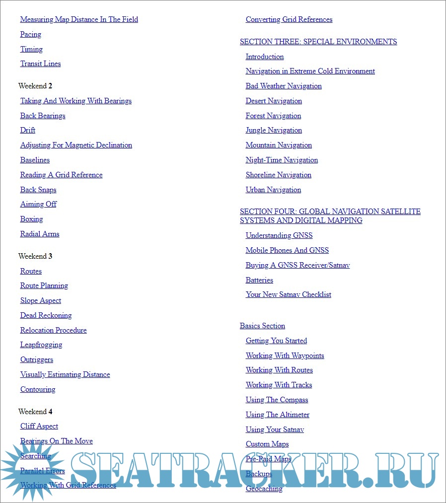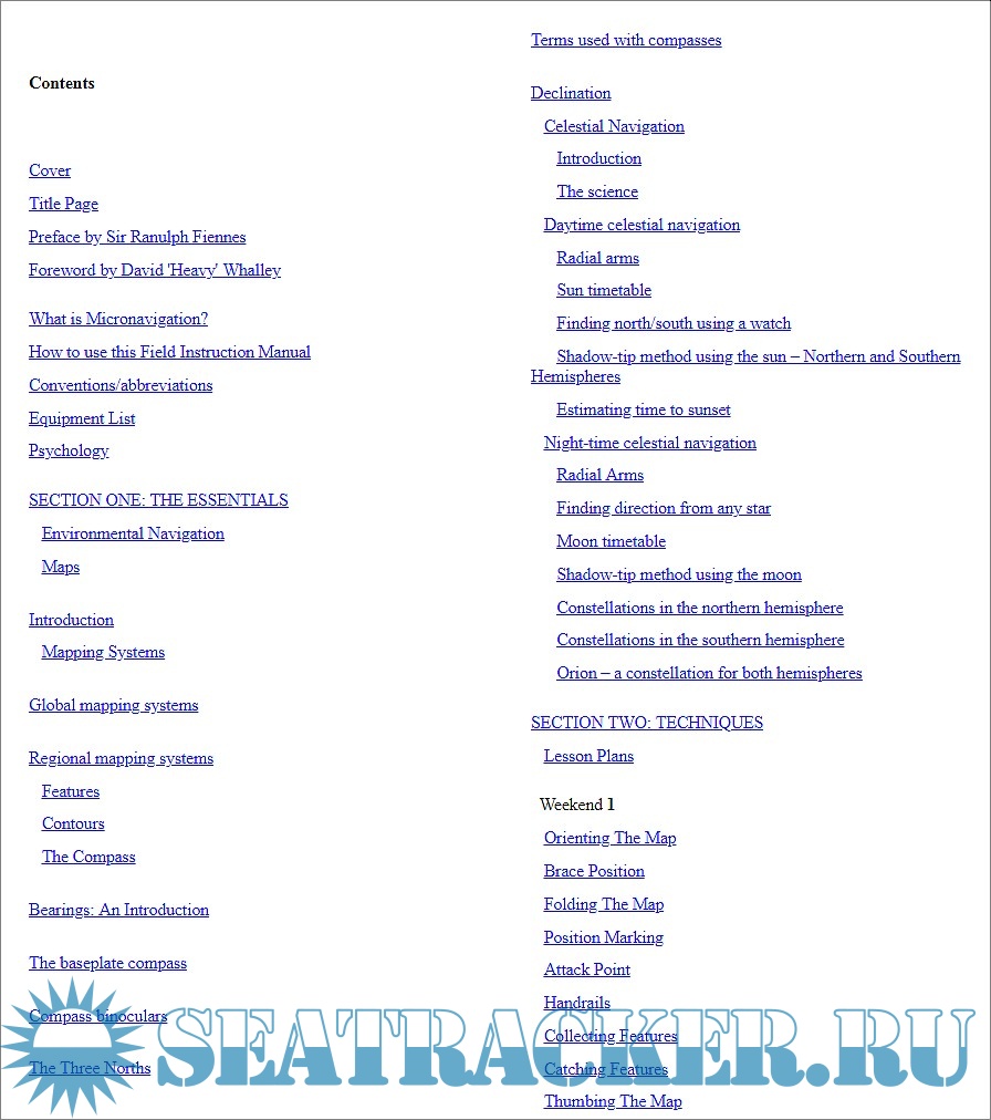 Even if not specific for nautical purpose, it is extremely interesting for seafarers and for anyone interested in navigation. See for example chapters on micronavigation, the concept of "legs" and waypoints, the expanding uncertainity area around the estimated position, the "relocation procedures" when lost, the basic celestial navigation with no instruments, bearings, transits and declination.