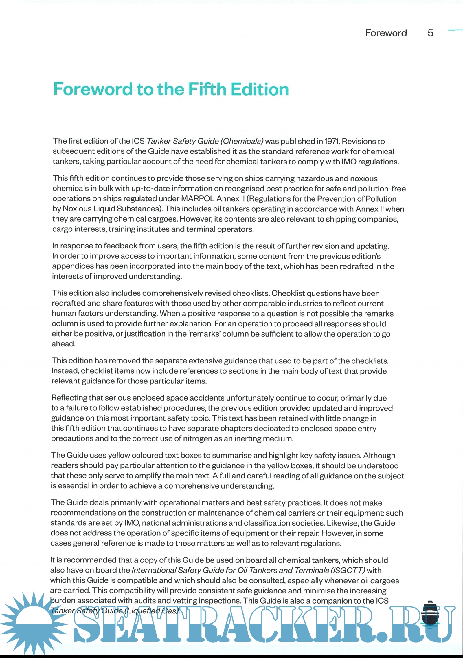 Description: The ICS Tanker Safety Guide (Chemicals) is the standard reference work for chemical tankers. Now in its fifth edition, the Guide provides chemical tanker operators and crew with up-to-date best practice guidance for safe and pollution-free operations on ships regulated under MARPOL Annex II (Regulations for the Prevention of Pollution by Noxious Liquid Substances). This includes oil tankers operating in accordance with Annex II when they are carrying chemical cargoes.