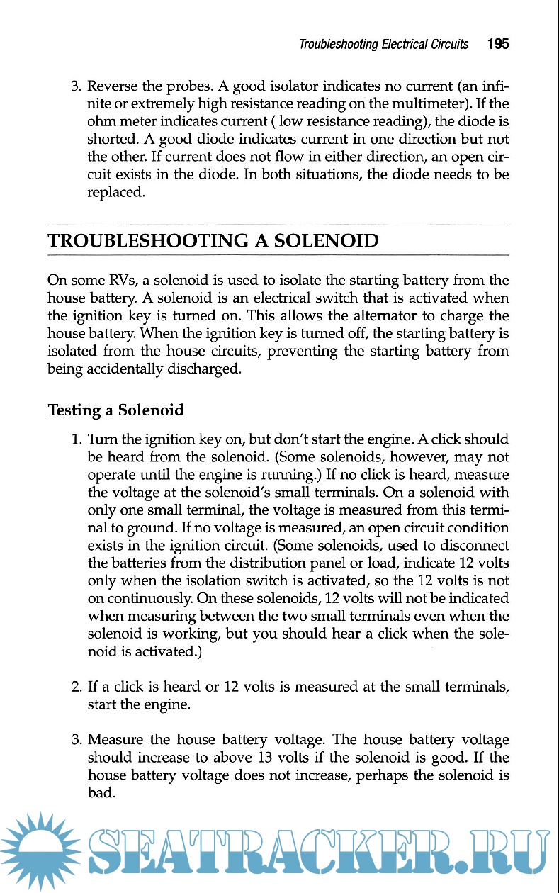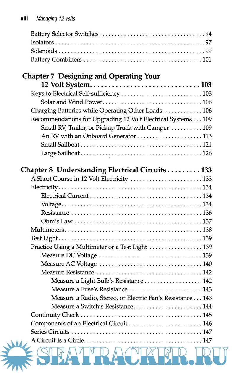 Description: This manual is about how to upgrade, operate and troubleshoot a 12-volt systems with emphasis on understanding what may be wrong with a system and how to improve it with a multi-stage charging system. The author, through diagrams and clear, concise writing, lead the reader to understand, operate, upgrade, repair the 12 V electrical system, how to change parts, calculate the amount of charge batteries contain and power consumption, and how to recharge them properly.
