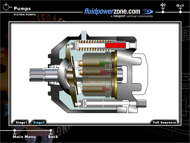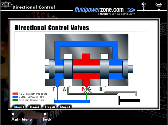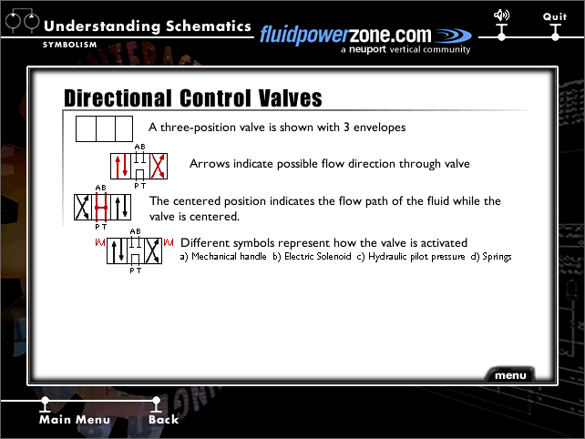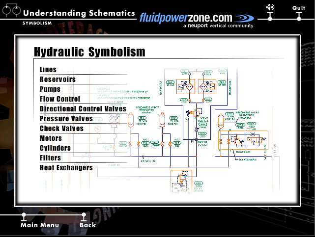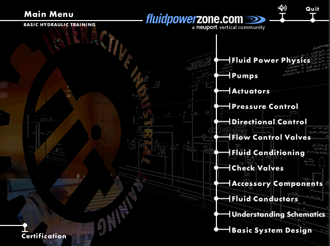 From this main menu, you can select from any of the course topics listed on the right hand side of your screen. Although you can work through these topics in any order, we recommend that you start at the top of the list with Fluid Power Physics and continue through the subjects from top to bottom. These topics are presented in this order to aid in your understanding of the material presented. While using this program, you can return to the main menu screen at any time.