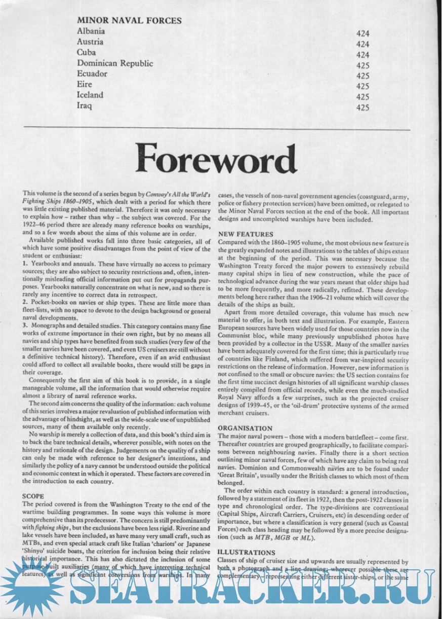 Year: 1980 Language: english Author: Gardiner R., Chesneau R. Genre: Reference book Publisher: Naval Inst Pr Edition: 1st ISBN: 0870219138 Format: PDF Quality: Photo of pages Pages count: 464 Description: 'Conway's All The World's Fighting Ships' series presents an international history of iron and steel warships from the first ironclad to the modern warship. The acclaimed series involved a major revaluation of published information and the wide scale use of unpublished sources. Every ship is covered, type by type and class by class and the series places the detailed and precise data of the ships into the wider context through introductions and extended texts allowing the reader to trace important technical and design developments and understand how and when naval developments took place. The text is complemented by photographs and/or accurate scale drawings for most classes included. This volume lists all the significant warships built between the Washington Treaty and the end of the wartime construction programmes.