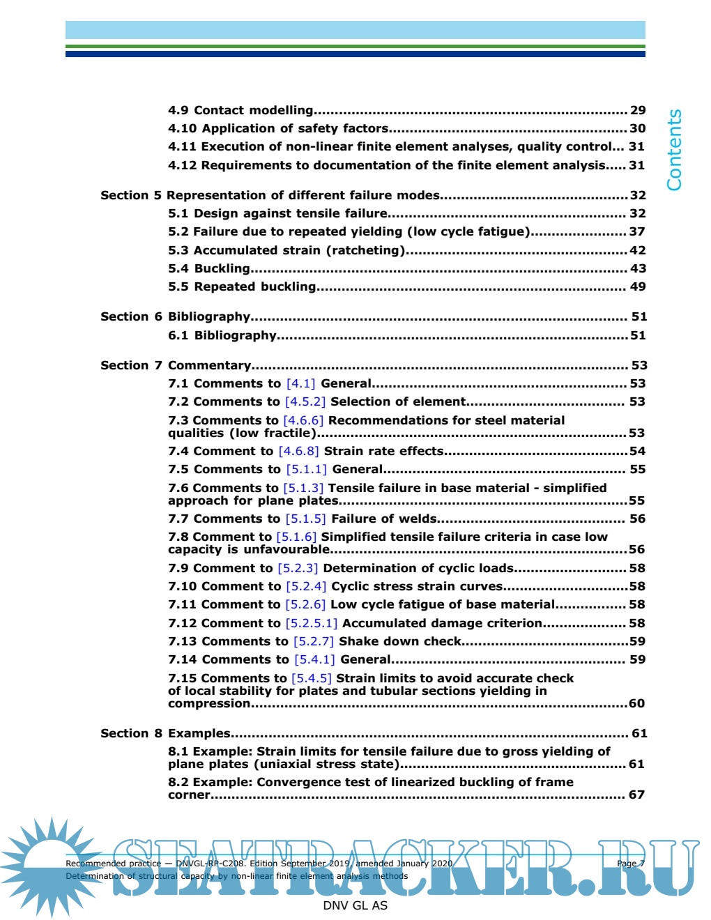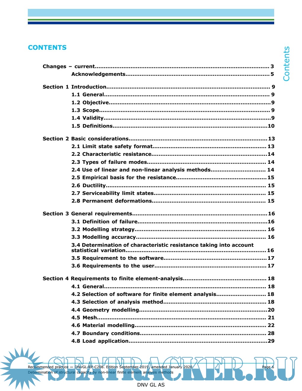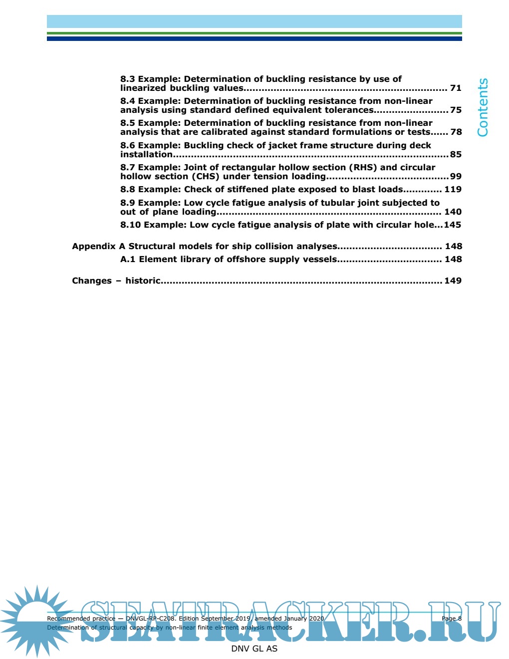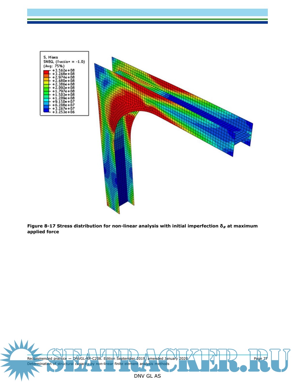 Year: 2020 Language: english Author: DNV GL AS Genre: Methodological guide Publisher: DNVGL Edition: September 2019 - Amended January 2020 Format: PDF Quality: eBook Pages count: 150 Description: 1.1 General This document is intended to give guidance on how to establish structural resistance by use of nonlinear finite element (FE) methods. It deals with determining the characteristic resistance of a structure or part of a structure in a way that fulfils the requirements to ultimate strength in DNV GL standards. Nonlinear effects that may be included in the analyses are material and geometrical nonlinearity, contact problems, etc. The characteristic resistance should represent a value that meets the requirement that there is less than 5% probability that the resistance is less than this value. This definition of characteristic resistance is similar to what is required by many other structural standards that use the limit state safety format. Recommendations in this document are expected to be valid for determination of capacities to be used with such standards. 1.2 Objective The objective of this recommended practice is that analyses carried out according to the recommendations given in this document will lead to a structure that meets the requirements to the minimum safety margin in the governing structural standard. This document is not intended to replace formulas for resistance in design standards for the cases where they are applicable and accurate, but to present methods that allow for using nonlinear FEmethods to determine resistance for cases that is not covered by traditional standards. 1.3 Scope This recommended practice is meant to supplement structural design standards for offshore steel structures and gives recommendation on how to determine the structural capacity by the use of nonlinear finite element analysis. 1.4 Validity The document is valid for marine structures made from structural steels meeting requirements to offshore structures with yield strength of up to 500 MPa. The recommendations presented herein are adapted to typical offshore steels that fulfil the requirements specified in DNVGLOSC101 /9/ or an equivalent offshore design standard. The specified requirements are made under the assumption that the considered structure is operating under environmental conditions that are within the specifications of the applied offshore standard. If the offshore unit is operating outside these specifications, the failure criterion presented in this recommended practice can only be utilized if it can be documented that both the weld and parent material have sufficient toughness in the actual environmental conditions. This recommended practice is concerned only with failure associated with extreme loads. Failure due to repeated loading from moderate loads (fatigue) needs to be checked separately. See DNVGLRPC203 /11/.