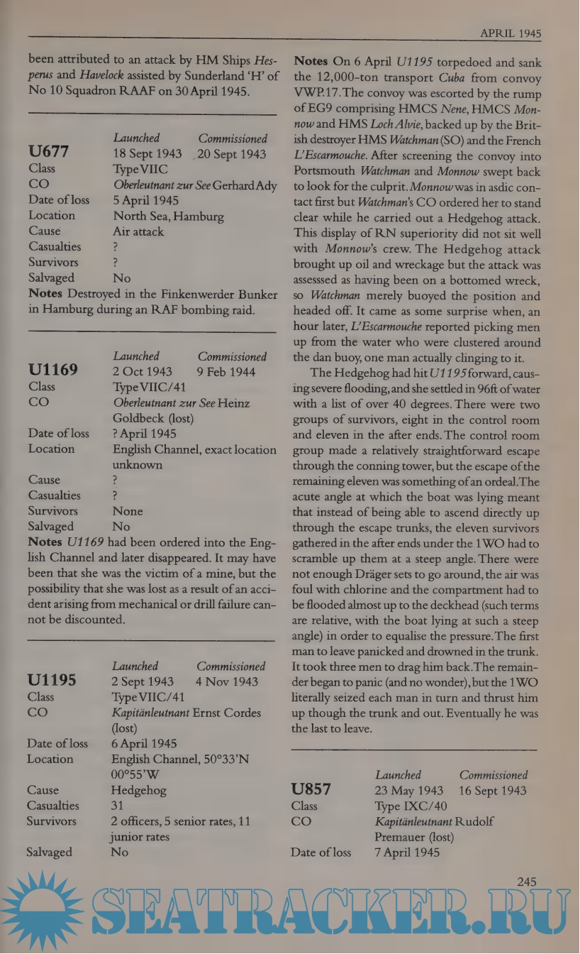 Year: 1999 Language: english Author: Kemp P. Genre: History Publisher: Arms @ Armour Edition: 2nd ISBN: 1-85409-515-3 Format: PDF Quality: Scanned pages Pages count: 292 Description: In both World Wars I and II, the German U-boat was the Allies' scourge, and in the latter conflict it very nearly won the day for the Nazis. Over a thousand of these powerful ships were destroyed in air and seaborne attacks, by surface vessels and submarines, in tough head-to-head encounters, chance meetings, and after extensive chases and hunts. Here is unprecedented detail of these sinkings and obliterations, of casualties on a massive scale, and of a victory hard-won. Additional info: