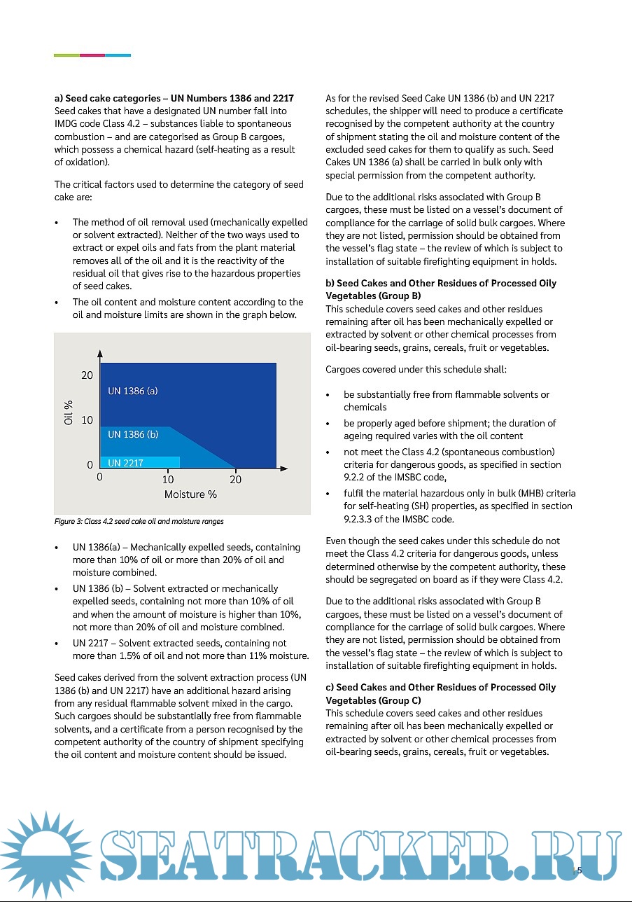Description: Nowadays the seed cake entry in IMSBC code covers a wider range of products that are made from seeds, grains, cereals, fruit or vegetables. Seed cake cargoes are commonly shipped for use as animal feed or biofuel, and are usually transported in the form of pulp, meals, cake, pellets and expellers. With some exceptions, seed cake is a hazardous cargo that can self-heat owing to the residual oil content and/or the presence of moisture, due to the fact the bulk temperature of the cargo can rise to the point of spontaneous ignition. The shipper is required, according to the provisions of the IMSBC code, to provide a certificate from a person recognised by the competent authority of the country of shipment confirming the oil and moisture content of the shipment, on the basis of which the category of the seed cake cargo is determined.