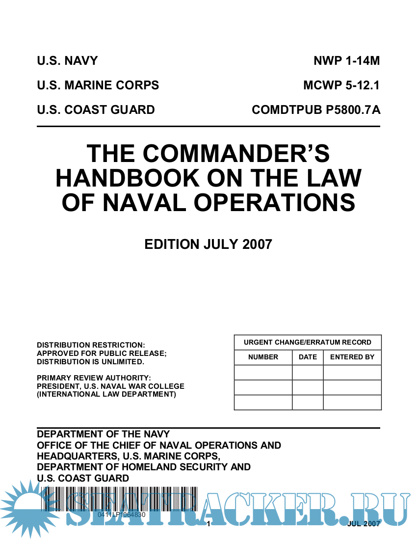 Description: 1. NWP 1-14M, THE COMMANDER’S HANDBOOK ON THE LAW OF NAVAL OPERATIONS (JUL 2007), is available in the Navy Warfare Publications Library. It