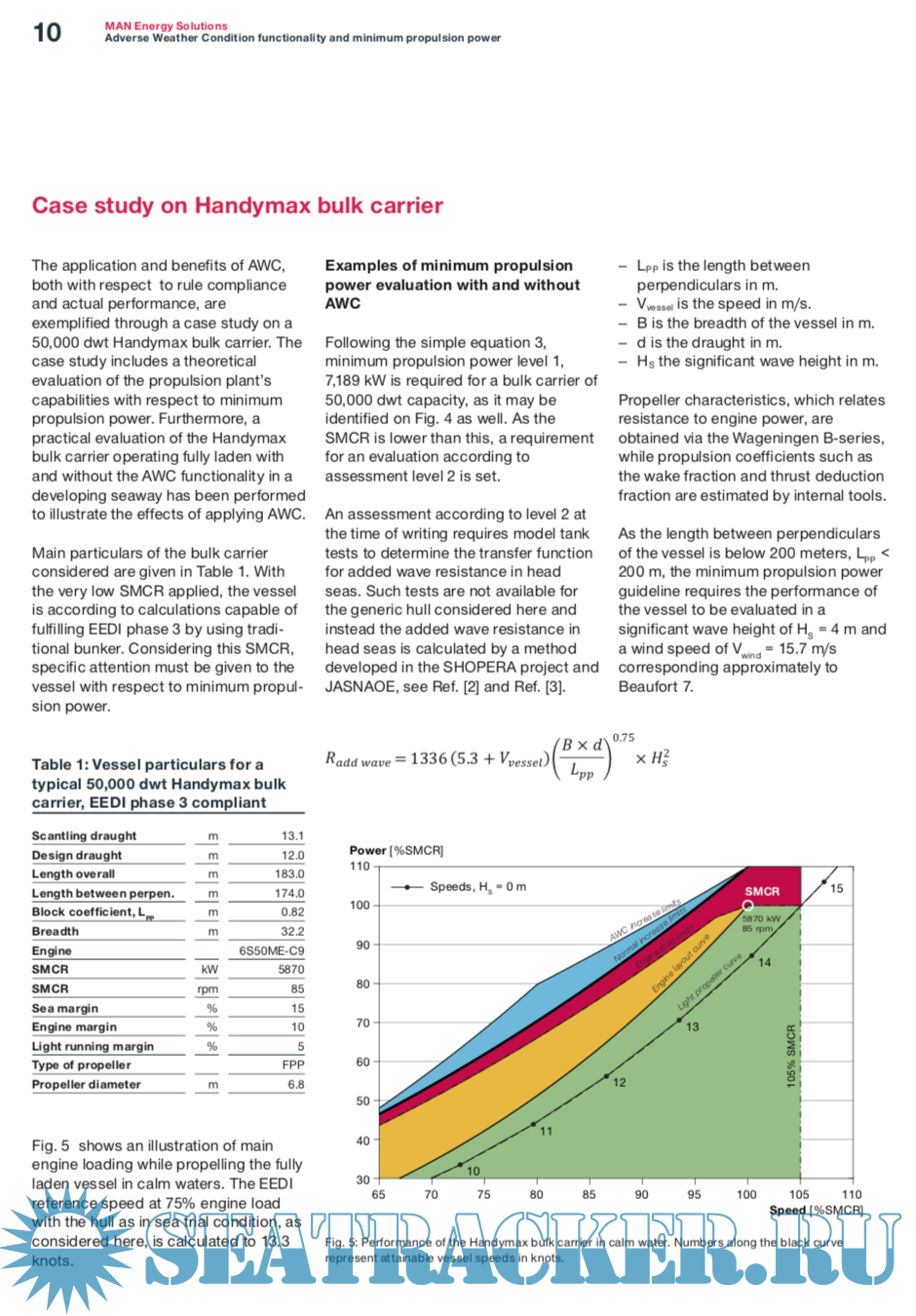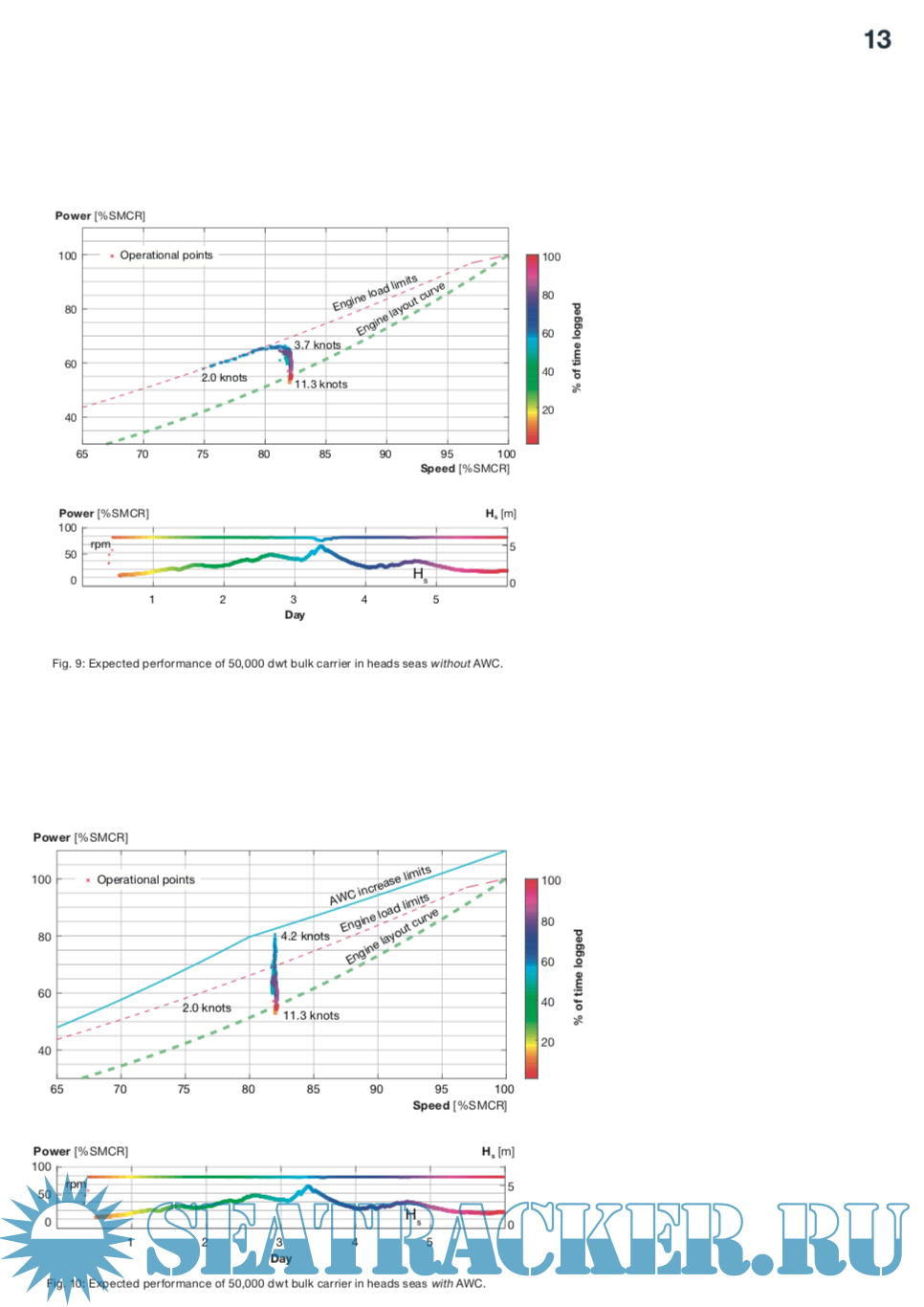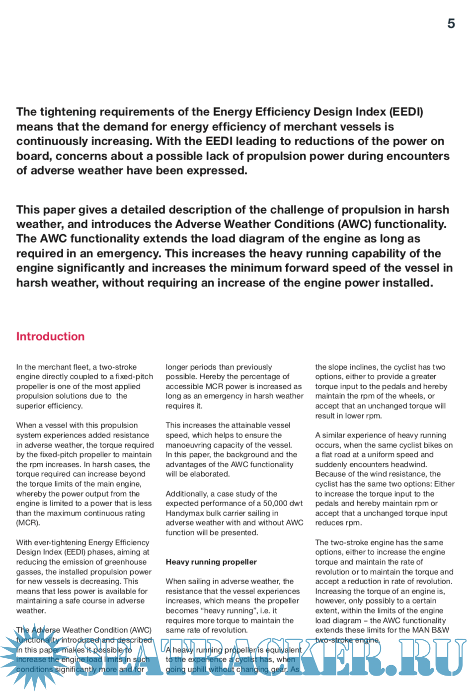Description: This paper gives a detailed description of the challenge of propulsion in harsh weather, and introduces the Adverse Weather Conditions (AWC) functionality. The AWC functionality extends the load diagram of the engine as long as required in an emergency. This increases the heavy running capability of the engine significantly and increases the minimum forward speed of the vessel in harsh weather, without requiring an increase of the engine power installed.