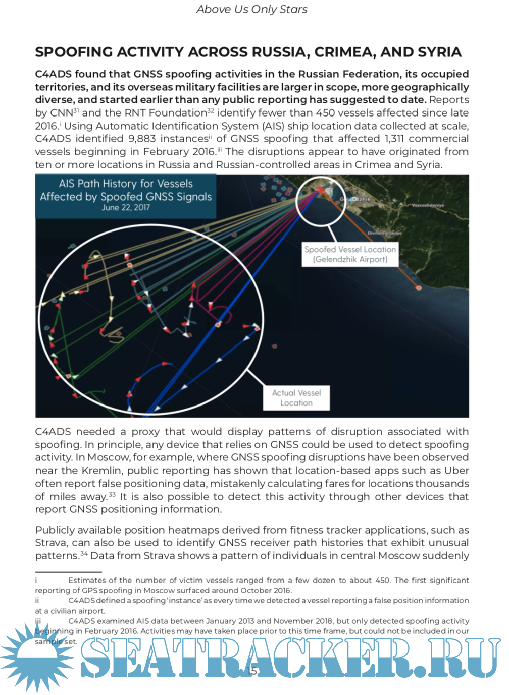 In this report, we present findings from a year-long investigation ending in November 2018 on an emerging subset of EW activity: the ability to mimic, or “spoof,” legitimate GNSS signals in order to manipulate PNT data. Using publicly available data and commercial technologies, we detect and analyze patterns of GNSS spoofing in the Russian Federation, Crimea, and Syria that demonstrate the Russian Federation is growing a comparative advantage in the targeted use and development of GNSS spoofing capabilities to achieve tactical and strategic objectives at home and abroad. We profile different use cases of current Russian state activity to trace the activity back to basing locations and systems in use.