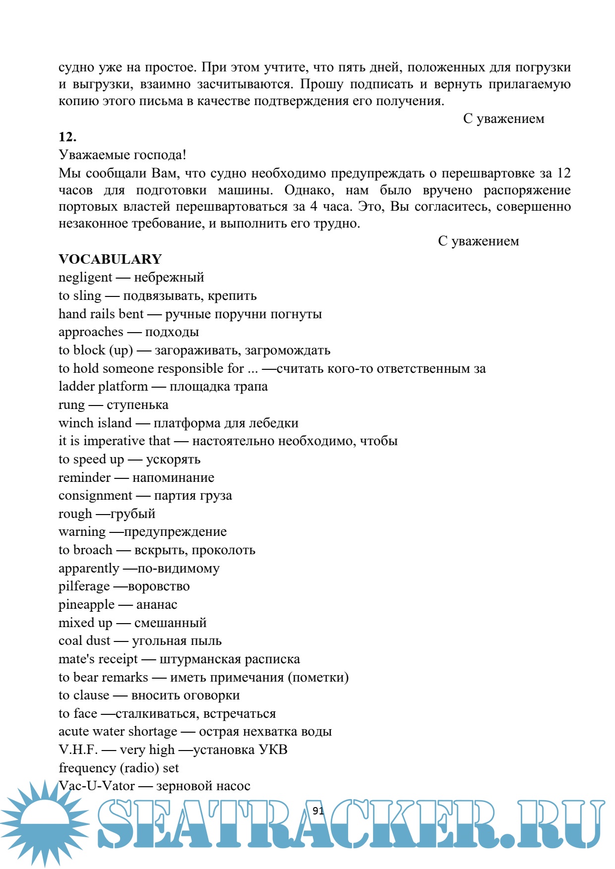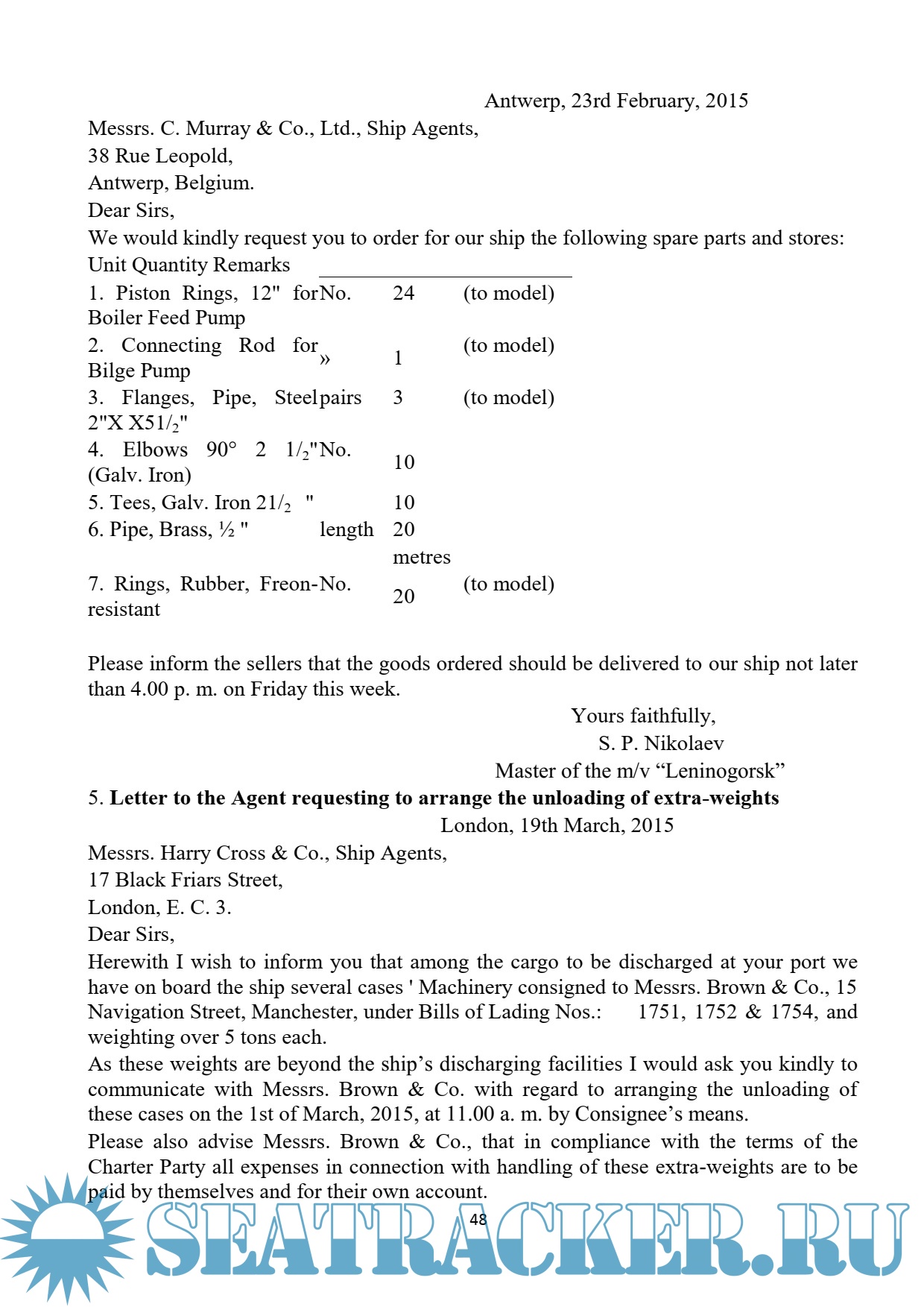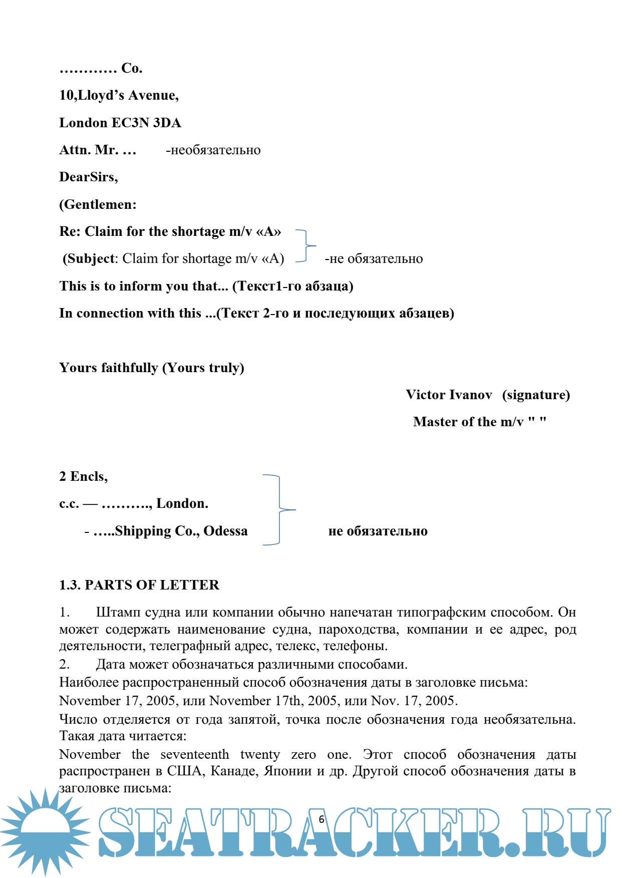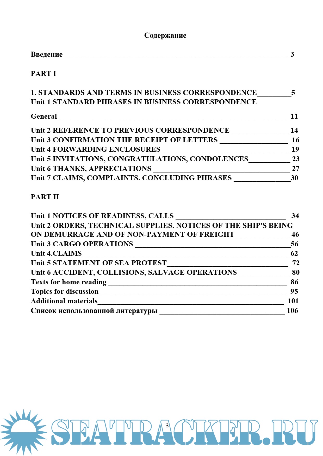Year: 2016 Language: english / russian Author: Осипова М.А. Genre: Methodological guide Publisher: Керченский государственный морской технологический университет Format: PDF Quality: eBook Pages count: 107 Description: Введение. Standard phrases in business correspondence. Reference to previous correspondence. Confirmation the receipt of letters. Forwarding enclosures. Invitations, congratulations, condolences. Thanks, appreciations. Claims, complaints. Concluding phrases. Notices of readiness, calls. Orders, technical supplies. Notices of the ship'S Being on demurrage and of non-payment of freight. Cargo operations. Claims. Statement of sea protest. Accident, collisions, salvage operations. Texts for home reading. Topics for discussion. Additional materials. Список использованной литературы.