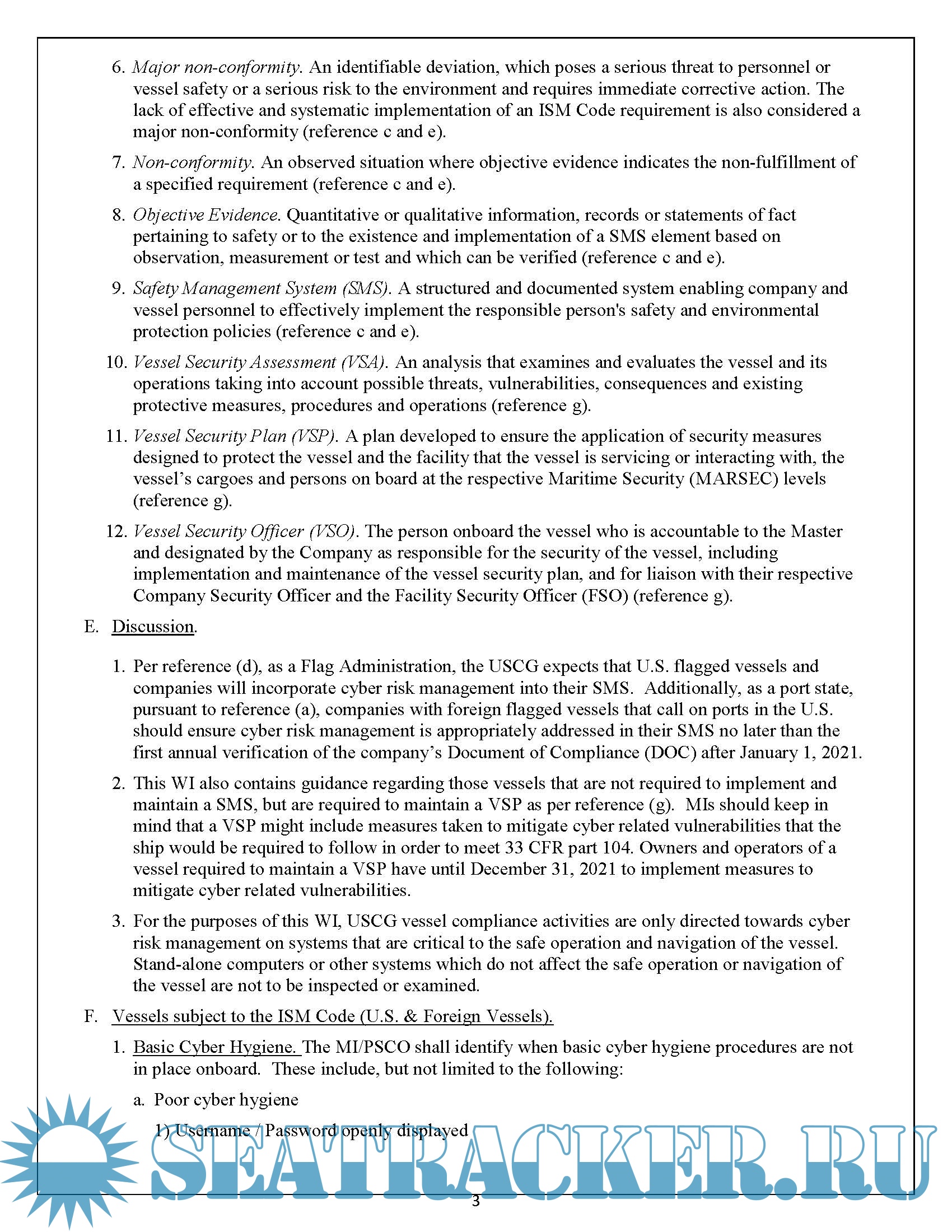 Year: 2021 Language: english Author: USCG Genre: Guide Publisher: USCG Format: PDF Quality: eBook Pages count: 7 Description: As maritime operations become more reliant on the systems integrated through automation, cyber risk is an area of increasing concern in the Marine Transportation System. This matter would eventually be monitored via PSC inspections for both domestic as well as foreign Flag vessels calling US ports. In an effort to address cyber threats in the maritime sector, the US Coast Guard has issued a Guidance Paper to provide guidance to Coast Guard Marine Inspectors and Port State Control Officers for assessing cyber hygiene onboard applicable vessels, as well as compliance options if deficiencies are noted. USCG recognizes that not all shipping companies and ships are alike, and therefore the SMS provides shipping companies the ability to tailor a structured system to address evolving cybersecurity vulnerabilities unique to a company/vessels specific management and operations. If you arrive in the US port with a malfunctioning critical system, you will be required to fix it there and then, be audited, and be able to reassure the PSCO on your next visit that the issue has been rectified. If you cannot do this, your vessel will most probably be detained.