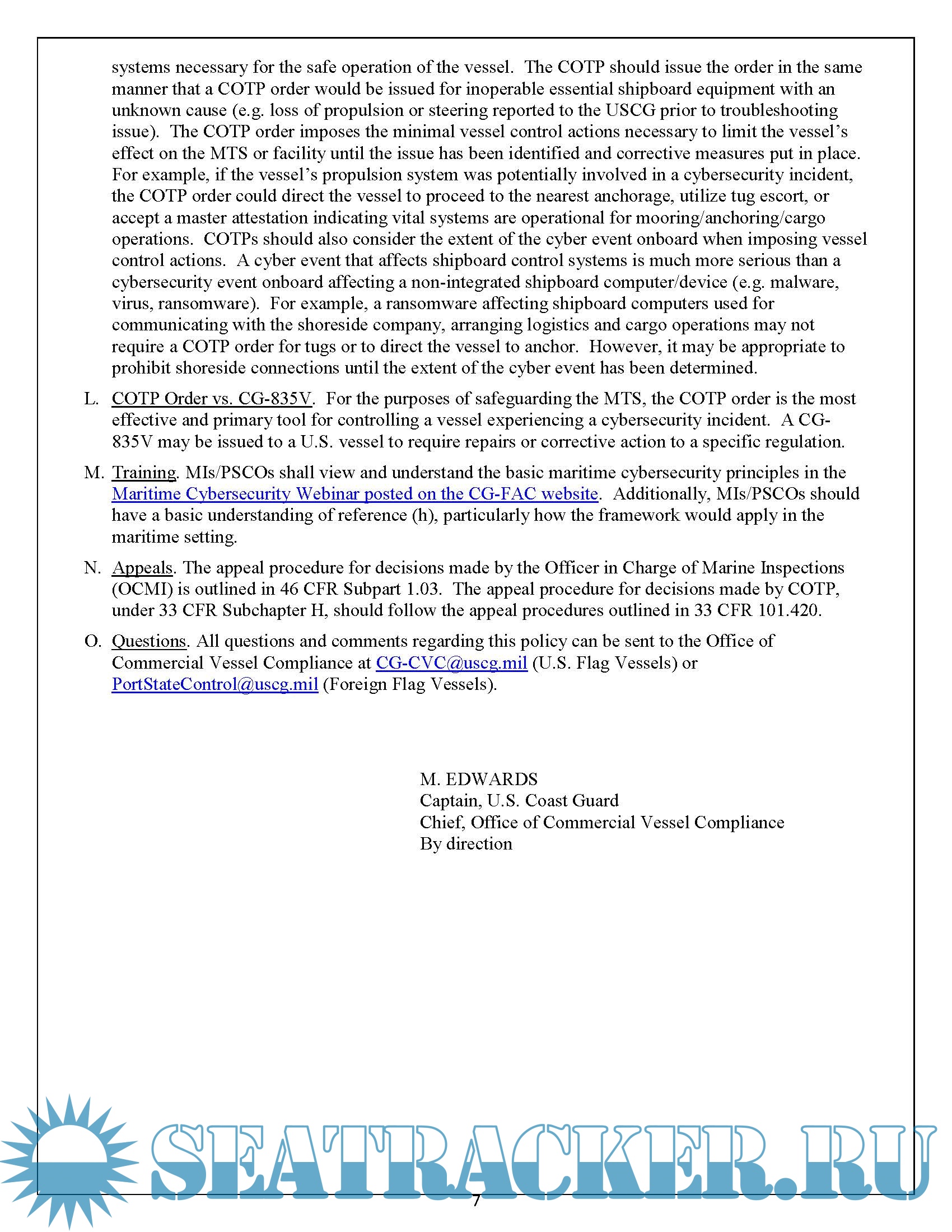 Description: As maritime operations become more reliant on the systems integrated through automation, cyber risk is an area of increasing concern in the Marine Transportation System. This matter would eventually be monitored via PSC inspections for both domestic as well as foreign Flag vessels calling US ports.