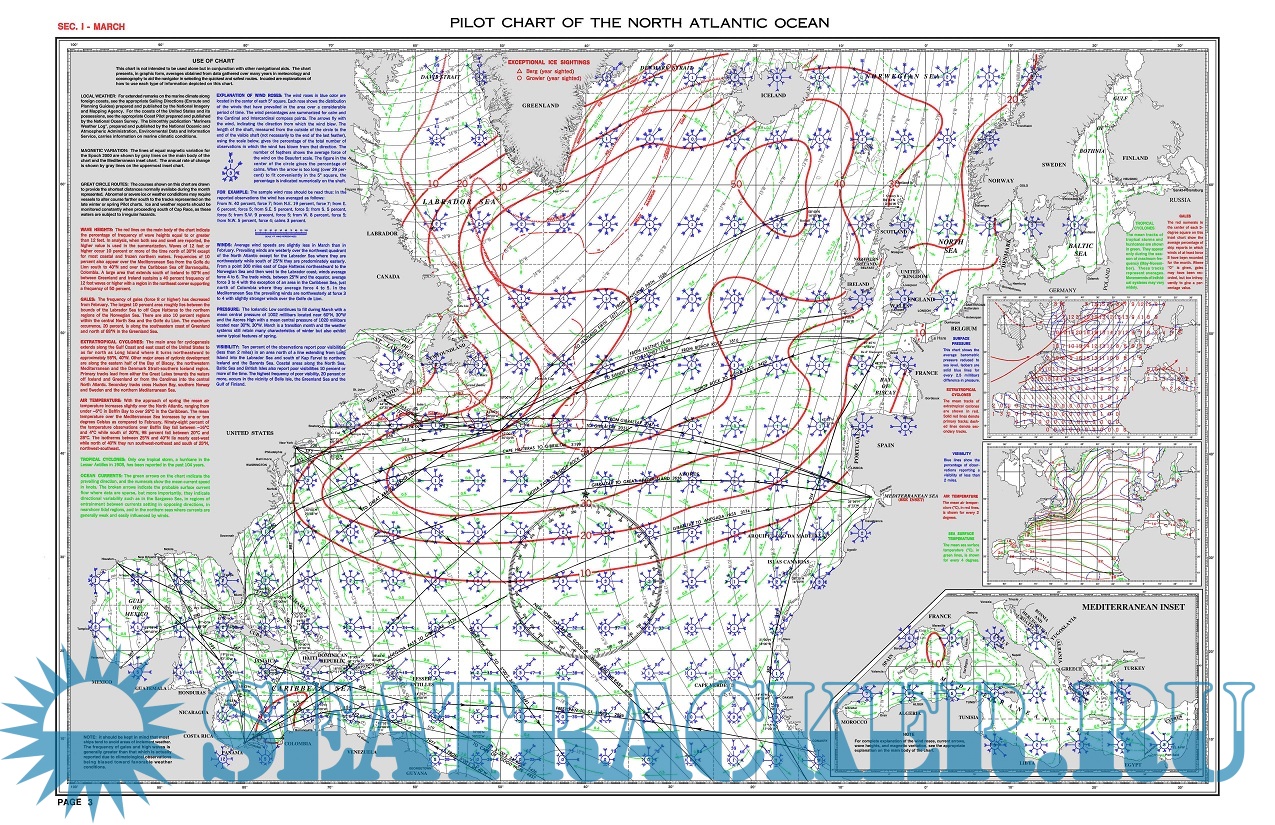 Year: 201? Language: english Author: National Geospatial-Intelligence Agency Genre: Guide Format: PDF Quality: eBook Pages count: >70 Description: Pilot Charts depict averages in prevailing winds and currents, air and sea temperatures, wave heights, ice limits, visibility, barometric pressure, and weather conditions at different times of the year. The information used to compile these averages was obtained from oceanographic and meteorologic observations over many decades during the late 18th and 19th centuries. The Atlas of Pilot Charts set is comprised of five volumes, each covering a specific geographic region. Each volume is an atlas of twelve pilot charts, each depicting the observed conditions for a particular month of any given year. The charts are intended to aid the navigator in selecting the fastest and safest routes with regards to the expected weather and ocean conditions. The charts are not intended to be used for navigation. .