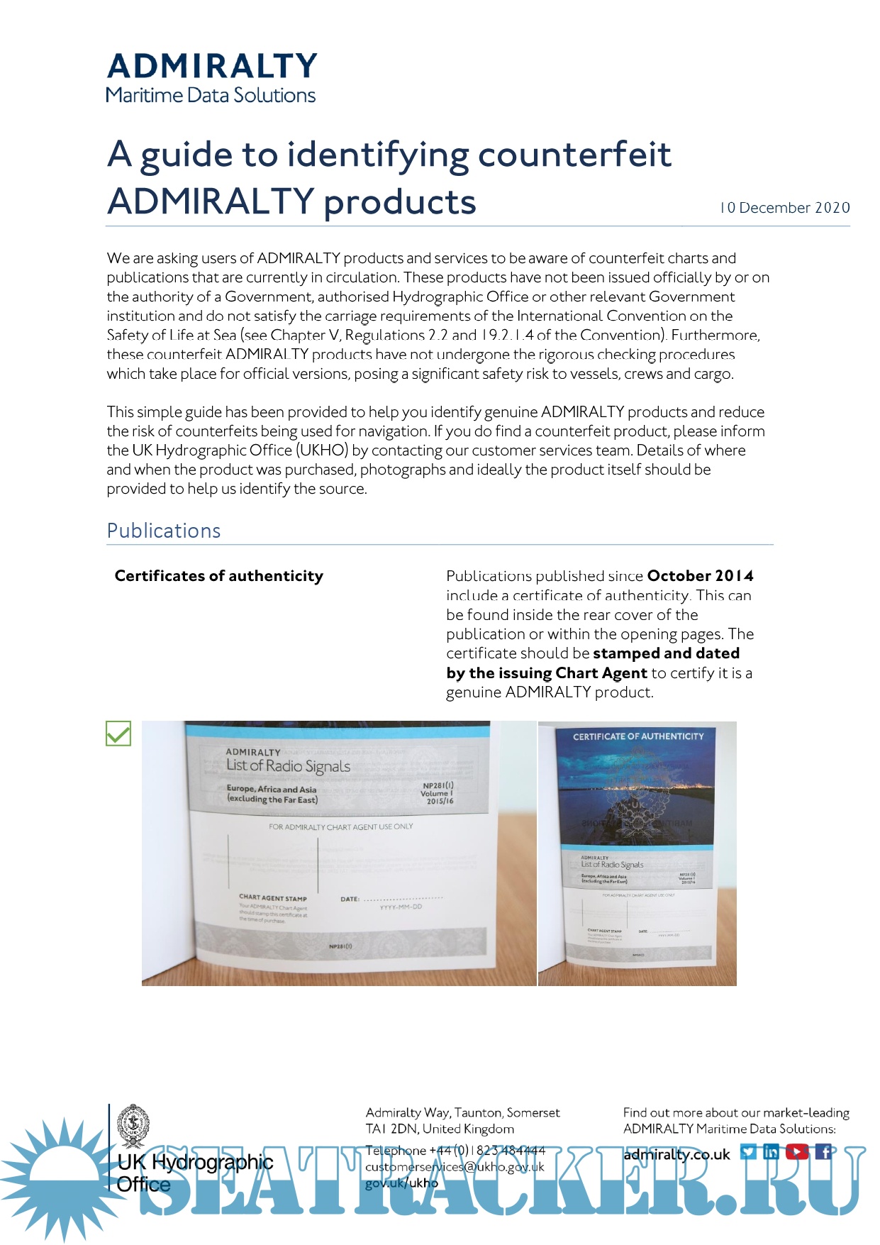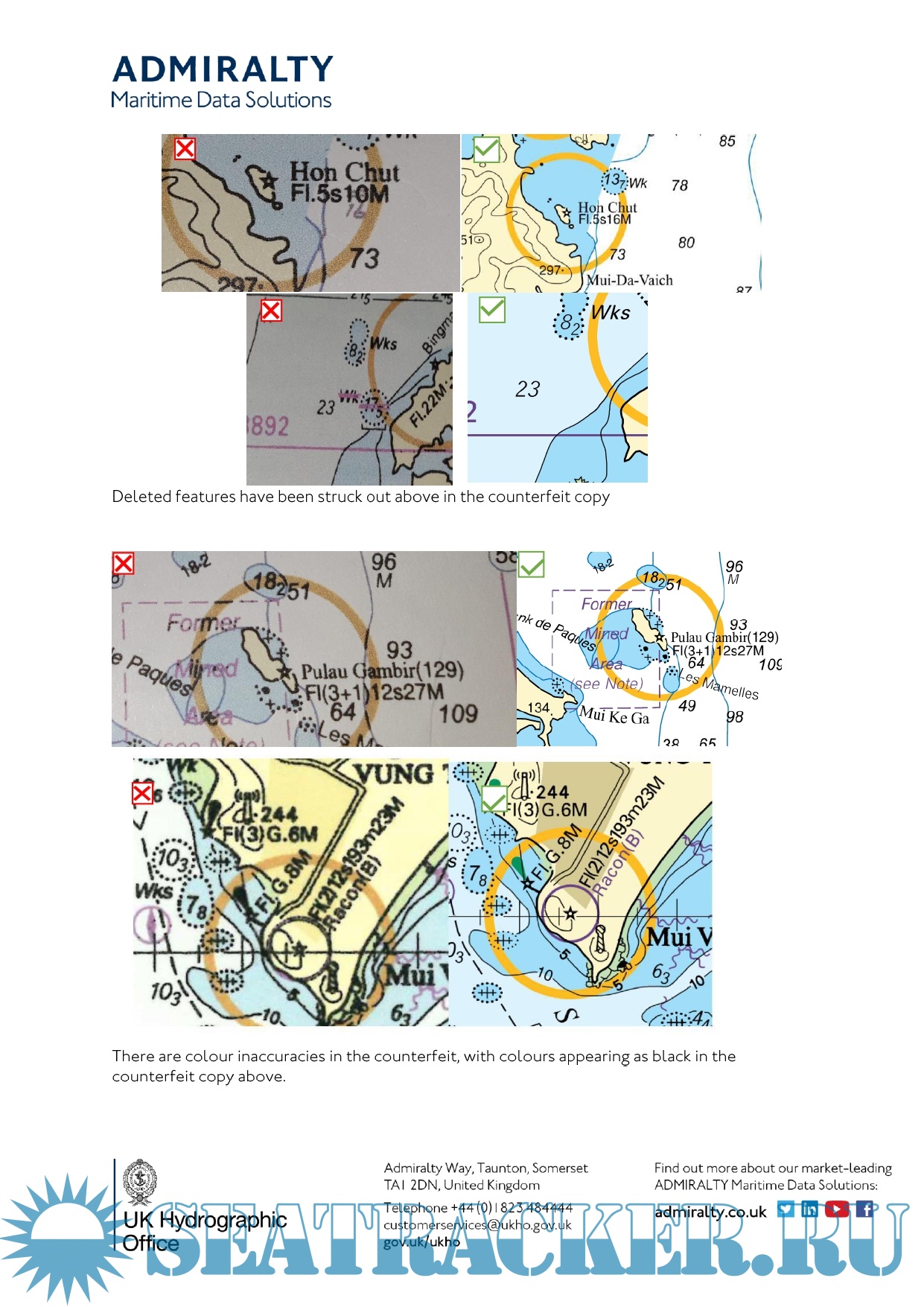 Description: UKHO is also calling on mariners and inspectors to use extra due diligence to ensure products held are genuine, as some sellers of counterfeit products have been found to ‘mix’ genuine charts and information with fake publications and vice versa.