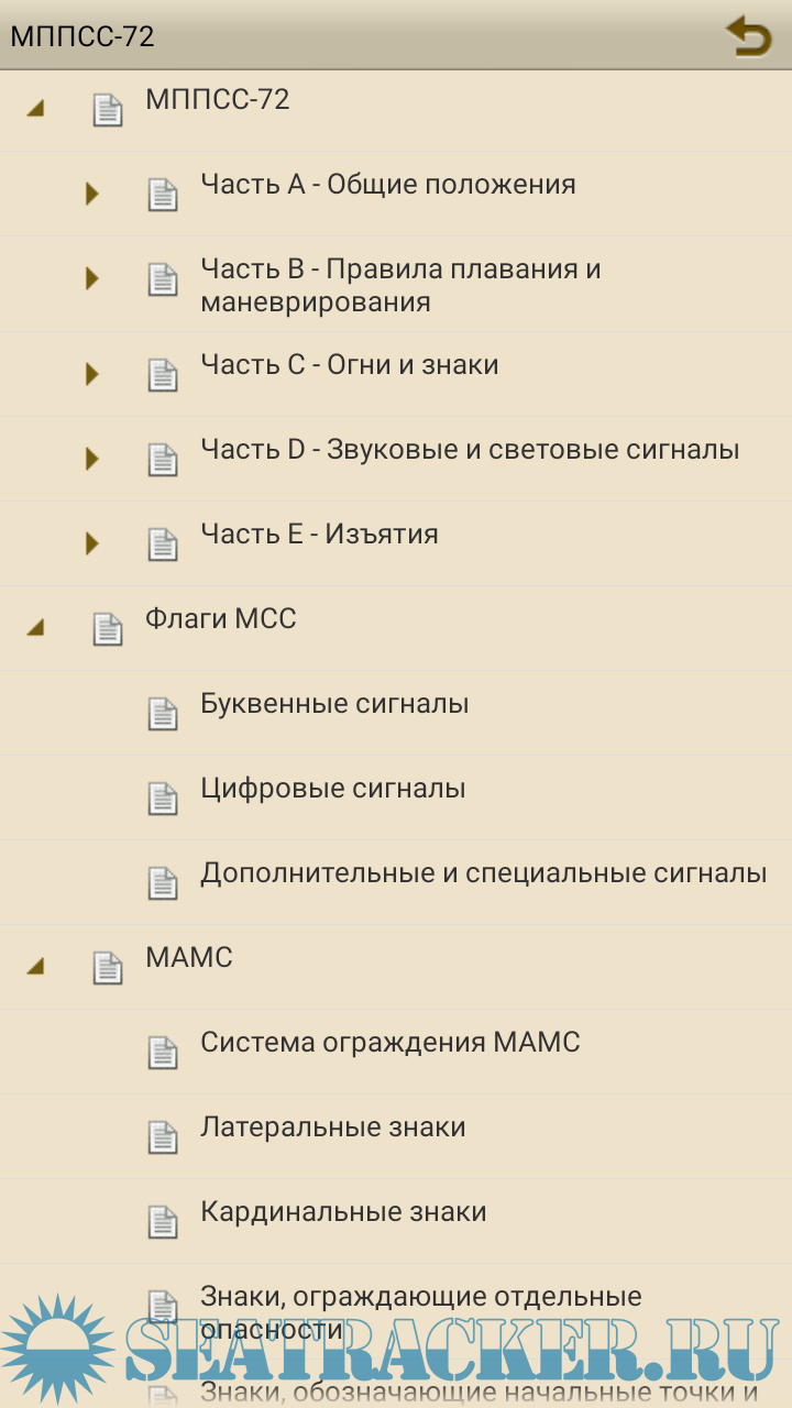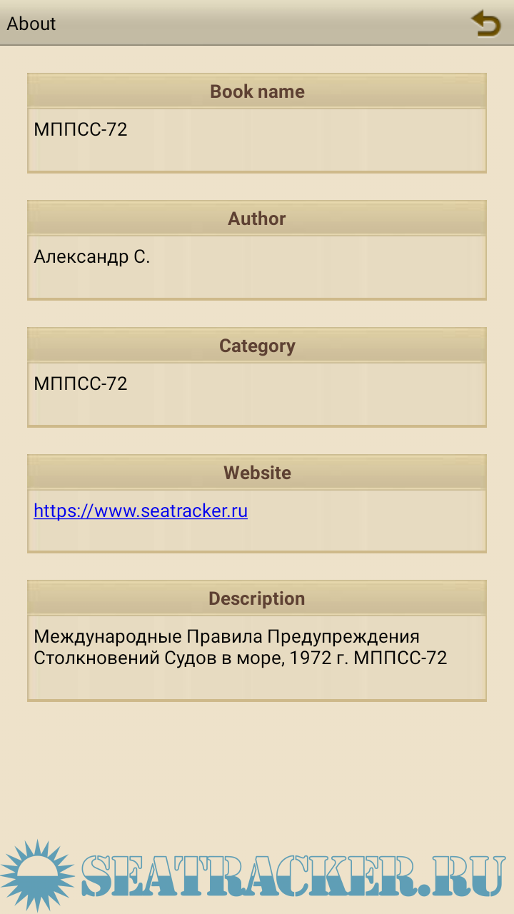 Год выпуска: 2021 Версия: Версия 1.1 Beta Разработчик: Александр С. Платформа: Android Совместимость с 64-битными ОС: неизвестно Системные требования: Тестировал на версиях Android: 4.4 и 8 Возможно будет работать на более ранних версиях. Язык интерфейса: русский Таблэтка: Не требуется Описание: Книга, представляющая собой учебное пособие. Будет полезна как начинающим помощникам, так и уже работающим в должности. В книге на данный момент три раздела: МППСС-72 , МСС , МАМС. В книге можно настраивать текст и режимы дневной/ночной. Доп. информация: Программа на стадии разработки! Цель создания данного приложения, собрать в едино как можно больше информации для Штурманов. Без рекламы!!! Программа сделана в виде книги. Меню не совсем удобно, но пользоваться можно. После установки на телефон по желанию измените в настройках программы шрифт на более крупный что бы легче читалась.