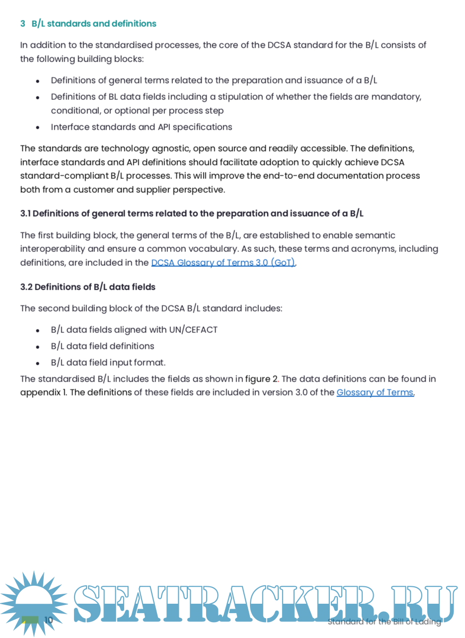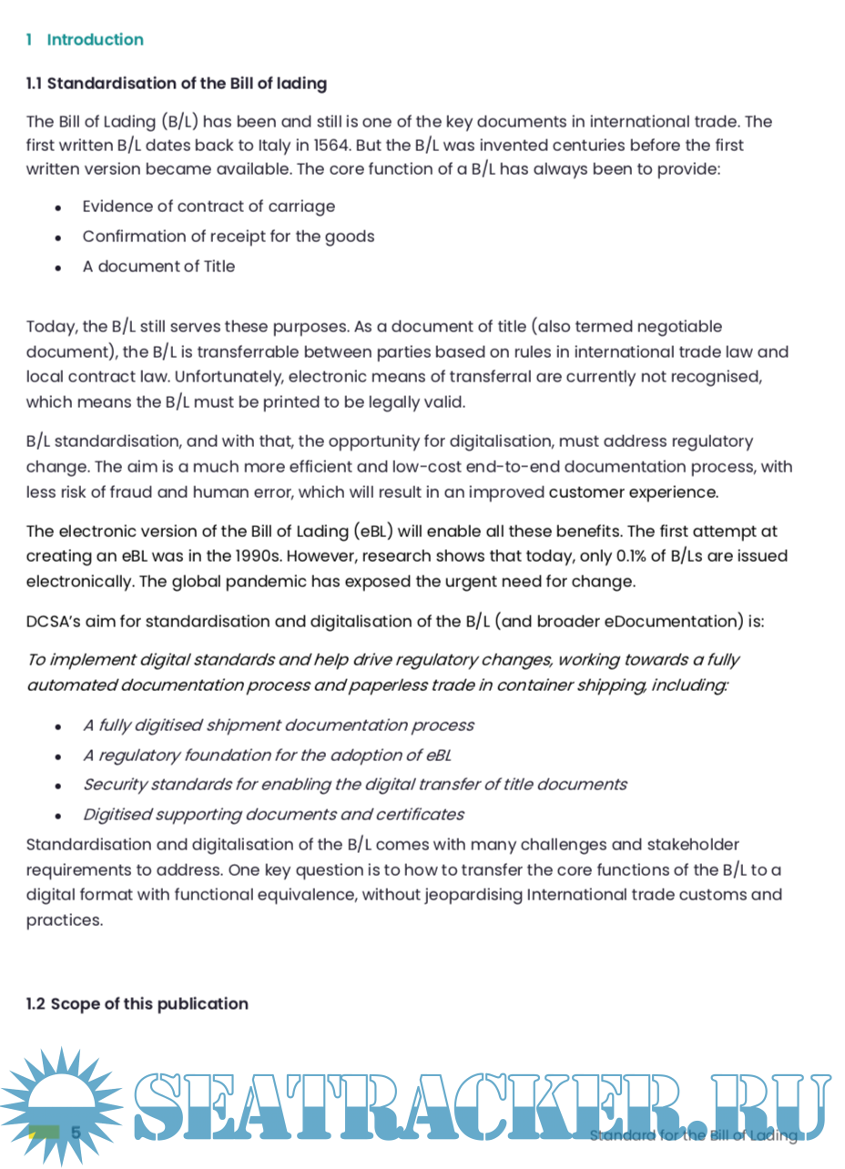 Description: This document provides the DCSA standard for the Bill of Lading as applied in container shipping. It also includes standards for the processes of preparing and issuing a Bill of Lading regardless of the channel used, i.e. physical or digital (the latter is referred to as the eBL). The standard also applies to the Sea Waybill.