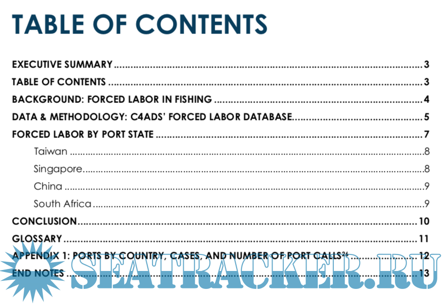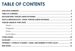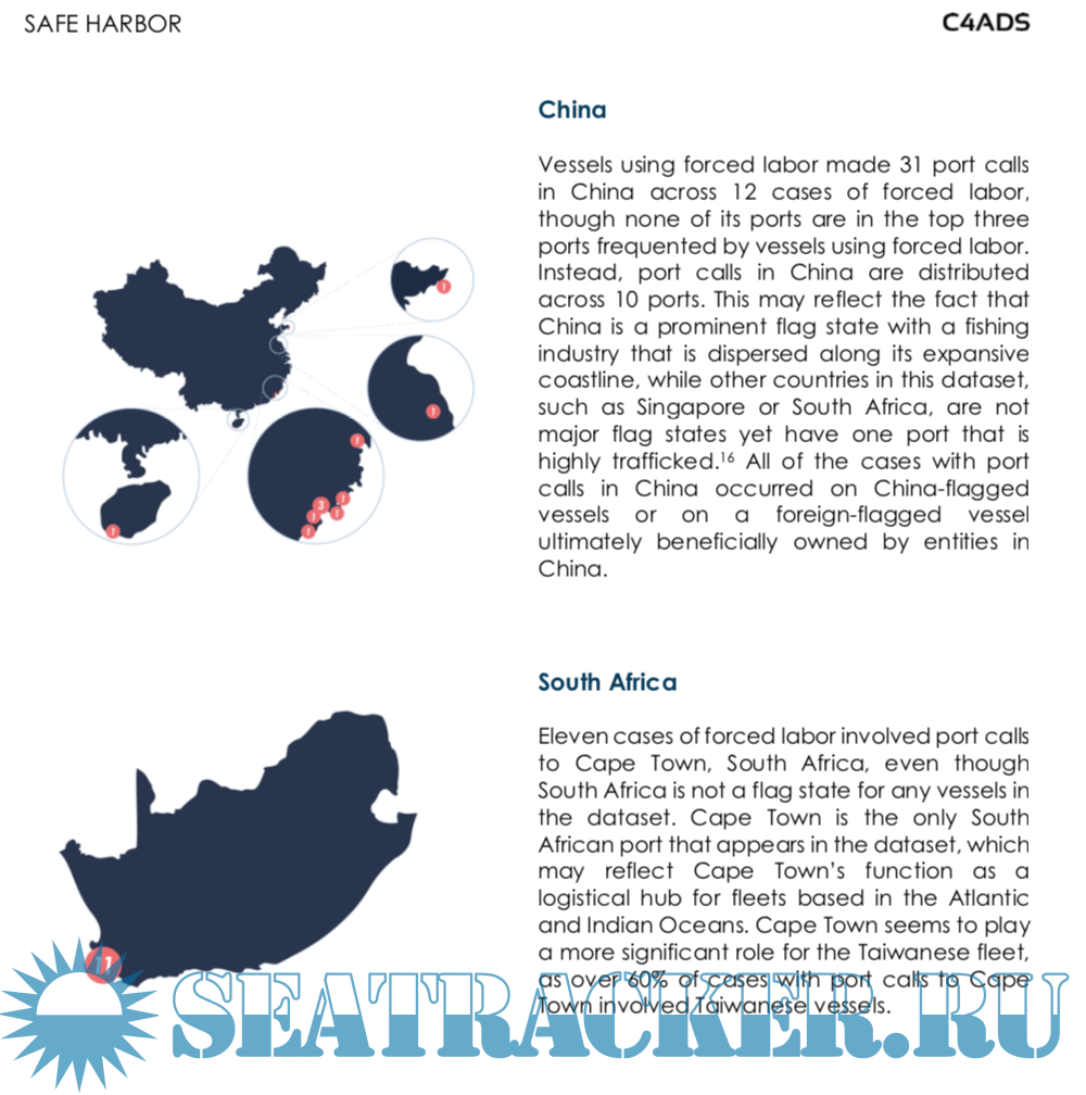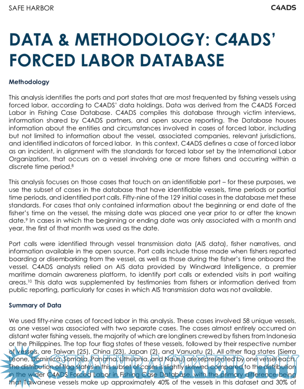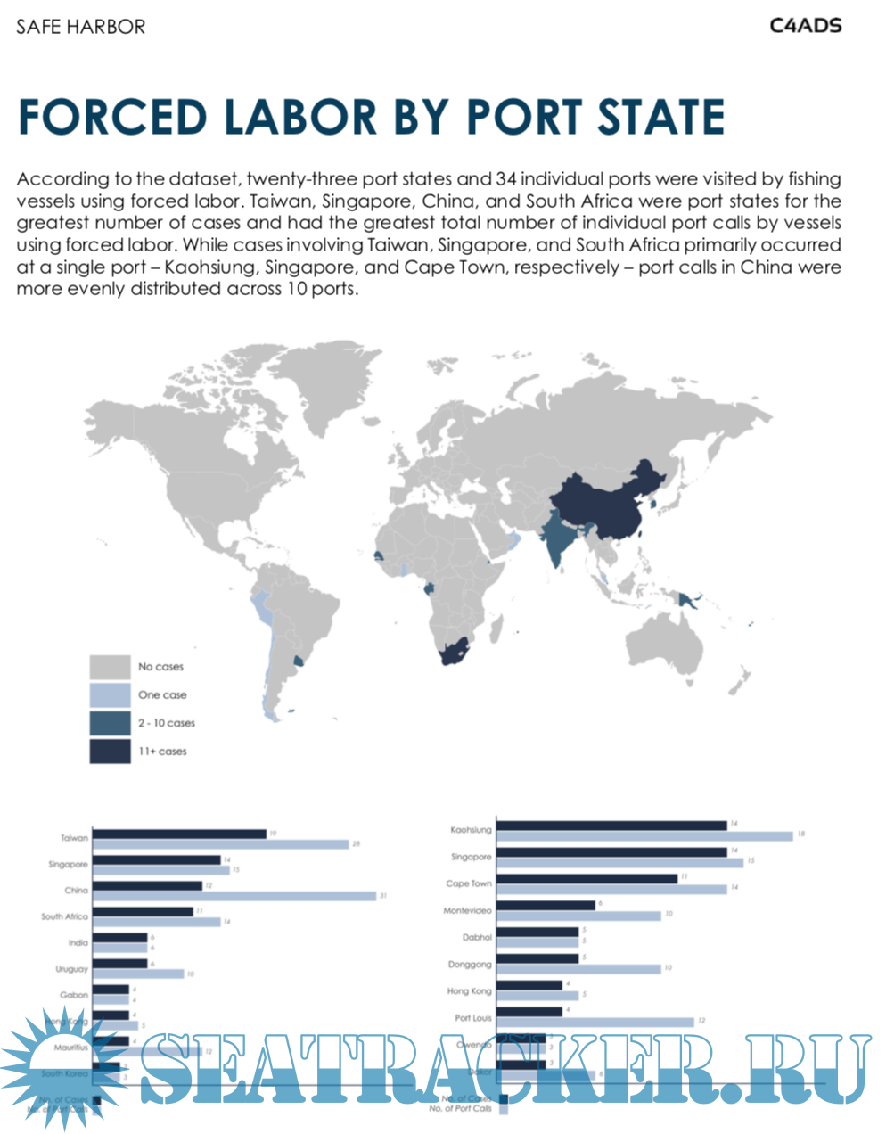 Description: Using 59 cases from the C4ADS Forced Labor Case Database, this analysis finds that between 2015 and 2020, Taiwan, Singapore, China, and South Africa were the most common port states visited by fishing vessels using forced labor, while Kaohsiung, Singapore, and Cape Town were the individual ports most frequently visited by fishing vessels using forced labor. Port states, and stakeholders around the world, have the opportunity to maximize anti-trafficking resources by identifying and disrupting forced labor and its supporting mechanisms at these key ports.