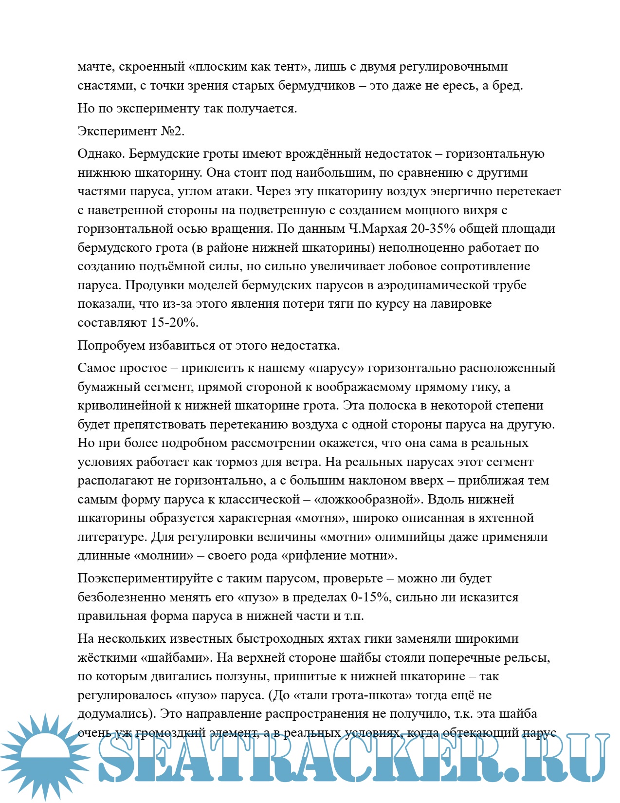 Год выпуска: ? Язык: русский Автор: Перегудов. В. Жанр: Руководство Издательство: ? Формат: PDF/DOCX Качество: Изначально компьютерное (eBook) Количество страниц: 15 Описание: На форуме опять обсуждается парус «Стриж» и опять без понимания этого вопроса. Цитата. Piton45. Ответ #21. «1) Стриж по Перегудову должен иметь в вертикальной плоскости форму "часть поверхности цилиндра". Для поддержания такой формы ему нужна жесткая (не гнущаяся) мачта. При такой форме паруса возникает "жопа" на верхнем и нижнем краях паруса из-за перетекания воздуха из области с большим давлением в область более низкого давления.» На самом деле всё обстоит с точностью «до наоборот». Одной из причин появления «Стрижей» было желание избавиться именно от этой «ж…», так характерной для парусов старых типов, в том числе и «бермудских гротов».